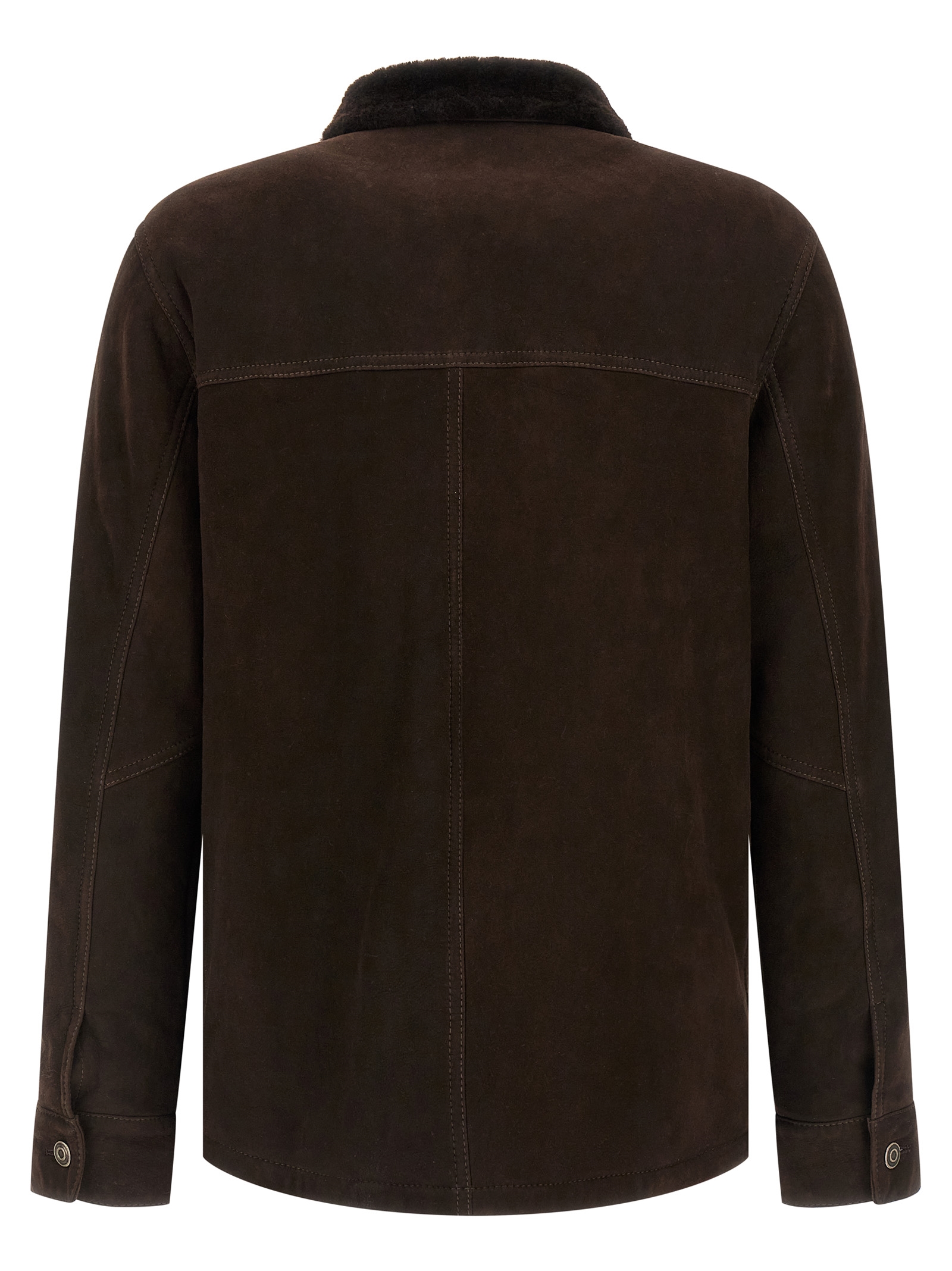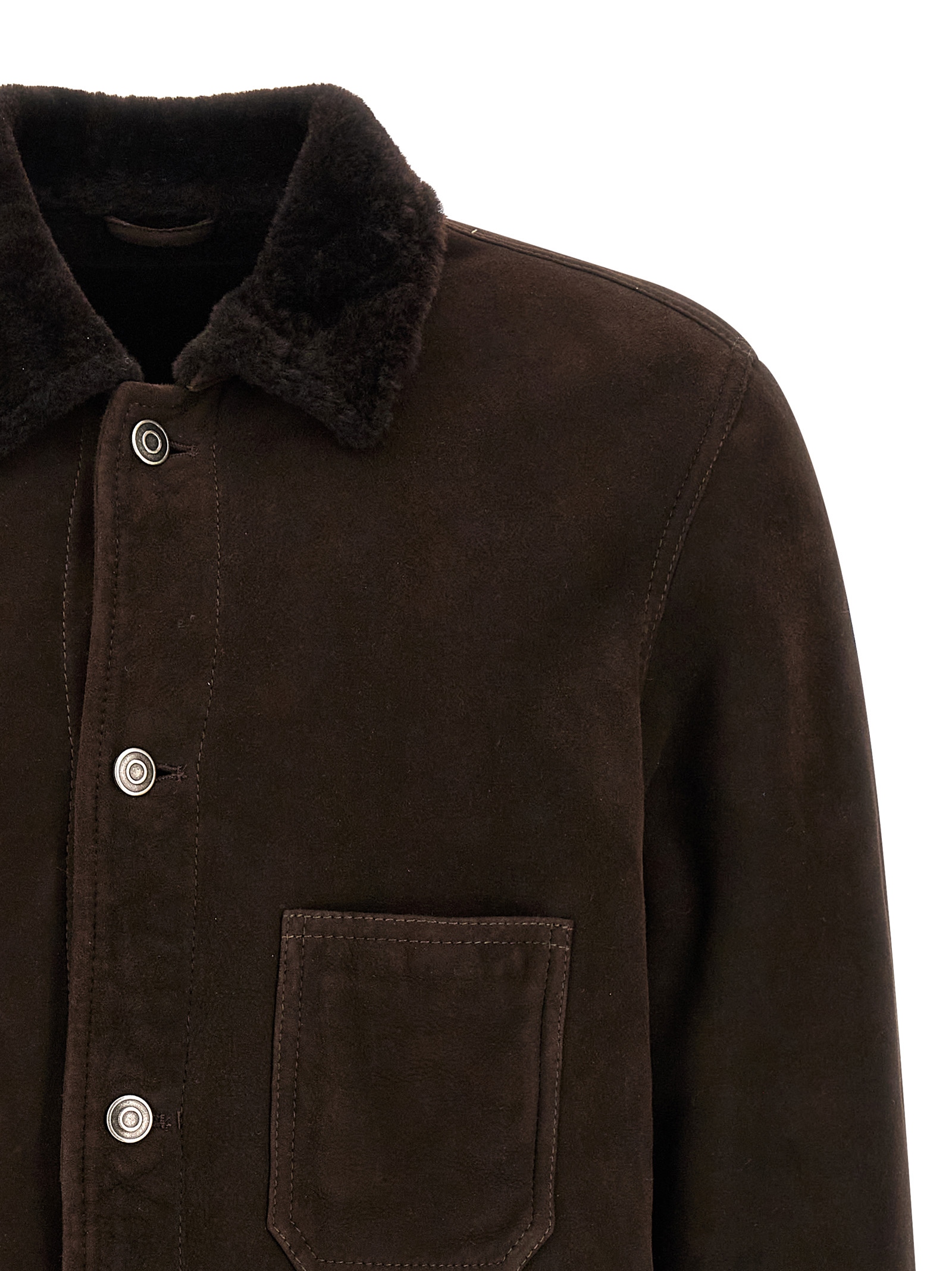 Suede sheepskin jacket with Sherling lining, collar, front button closure, pockets, long sleeves.
