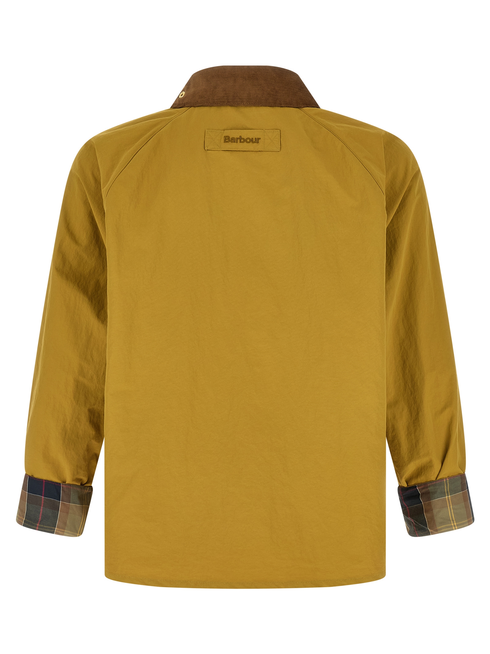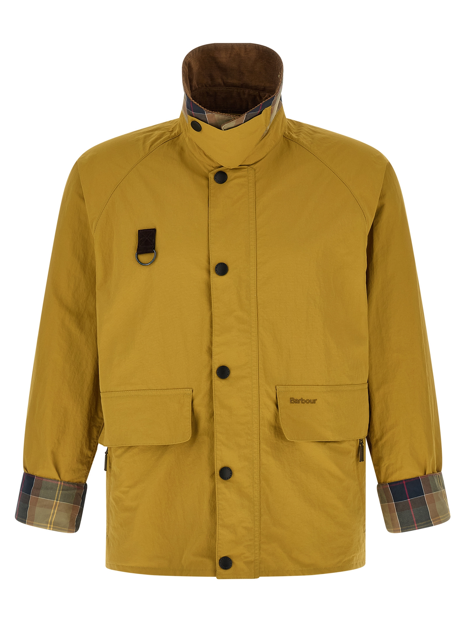'Spey Icons' jacket in wrinkled-effect technical fabric with contrast corduroy shirt collar with chinstrap, removable metal brooch and tartan under collar, tone-on-tone logo embroidery and front zip and snap button closure, pockets, long raglan sleeves with foldable cuffs, tone-on-tone logo patch on the back, tartan half lining.