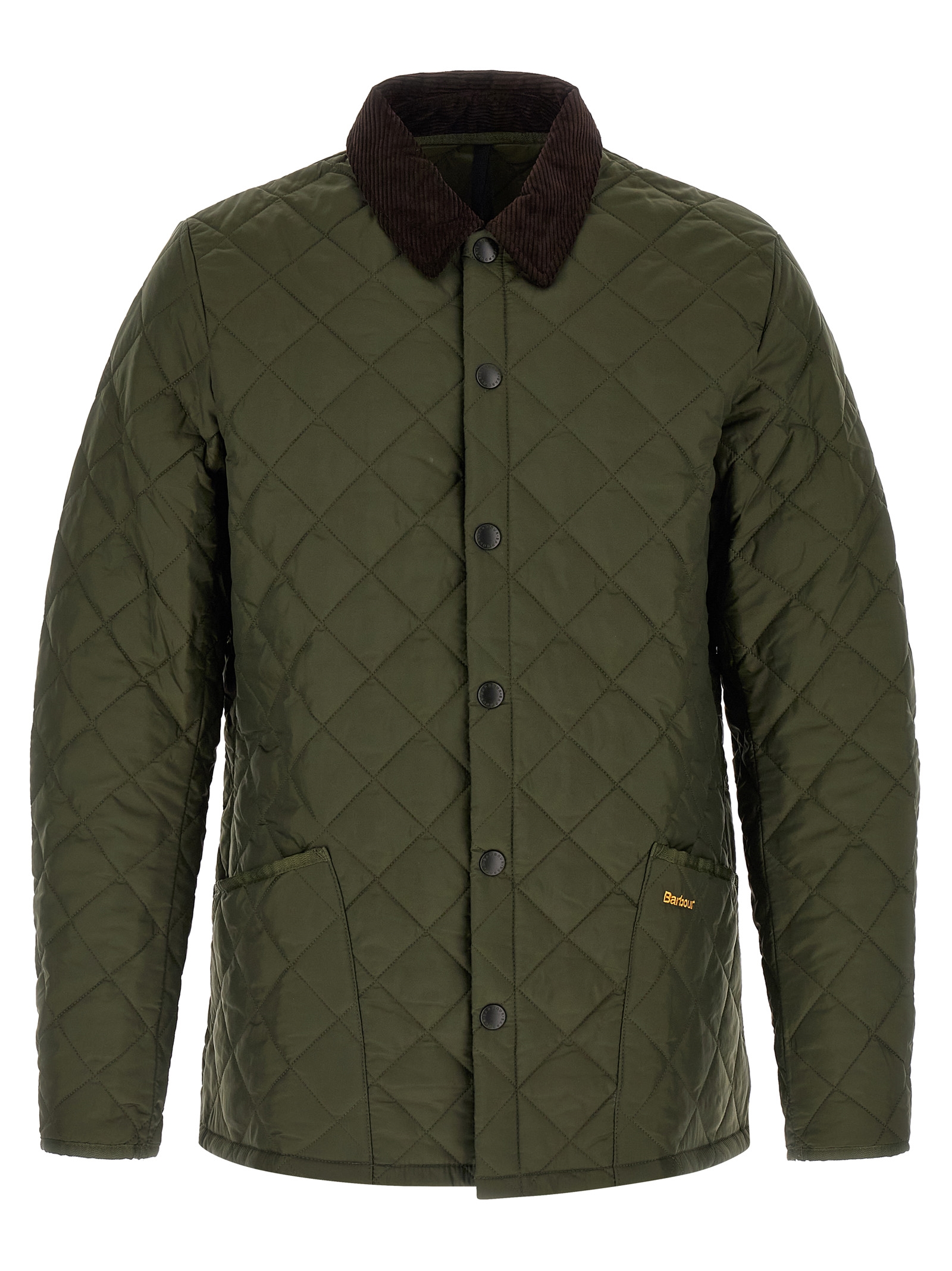 ‘Heritage Liddesdale’ jacket in windproof technical fabric with diamond quilting, durable nylon lining with light warm wadding padding, contrasting corduroy shirt collar, embroidered logo and front snap button closure, pockets, long sleeves.