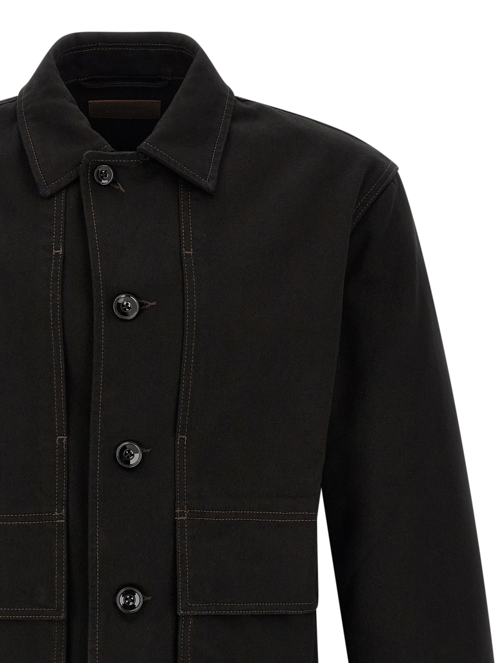 'Boxy' jacket in heavy cotton denim with deep black wash, contrast stitching, workwear style, square silhouette, shirt collar, front button closure, pockets, long sleeves with cuffs and dropped shoulder, unlined.