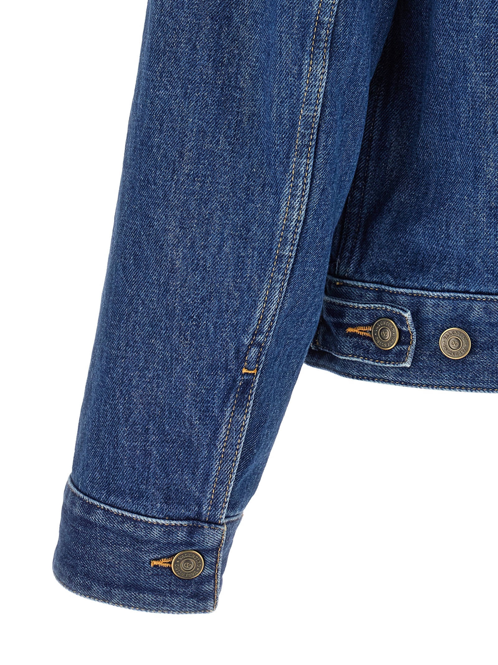 Куртка «Valentino» з бавовняного деніму з контрастною прострочкою, кишенею з металевою антикварною деталлю VGold, коміром сорочки, застібкою на ґудзиках спереду, кишенями, довгими рукавами з манжетами та злегка опущеними плечима.