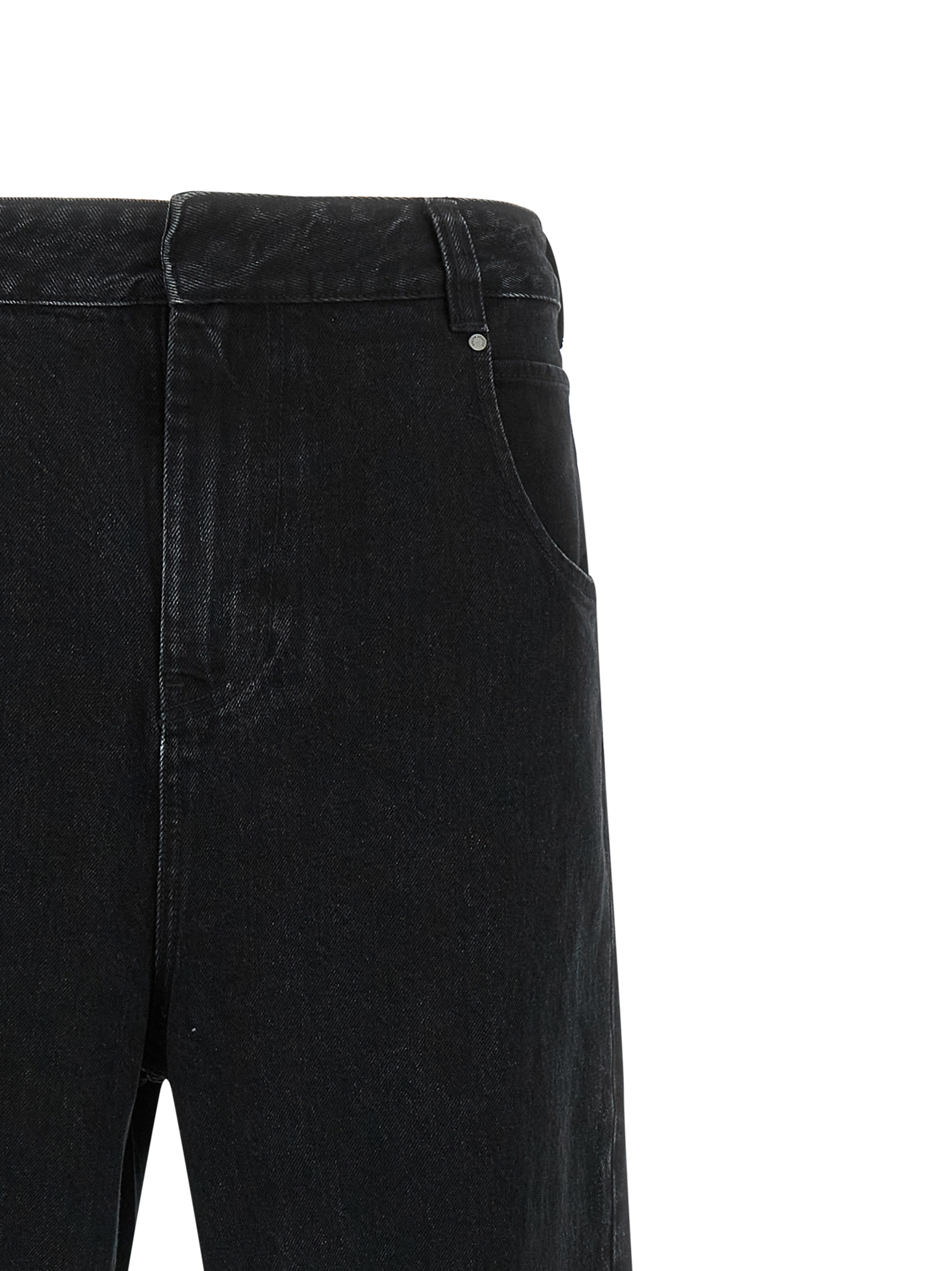 Gem' garment-dyed 13.75 oz Japanese cotton denim jeans, front zip and button closure, five pockets, wide straight leg, knee pin, back logo tag.