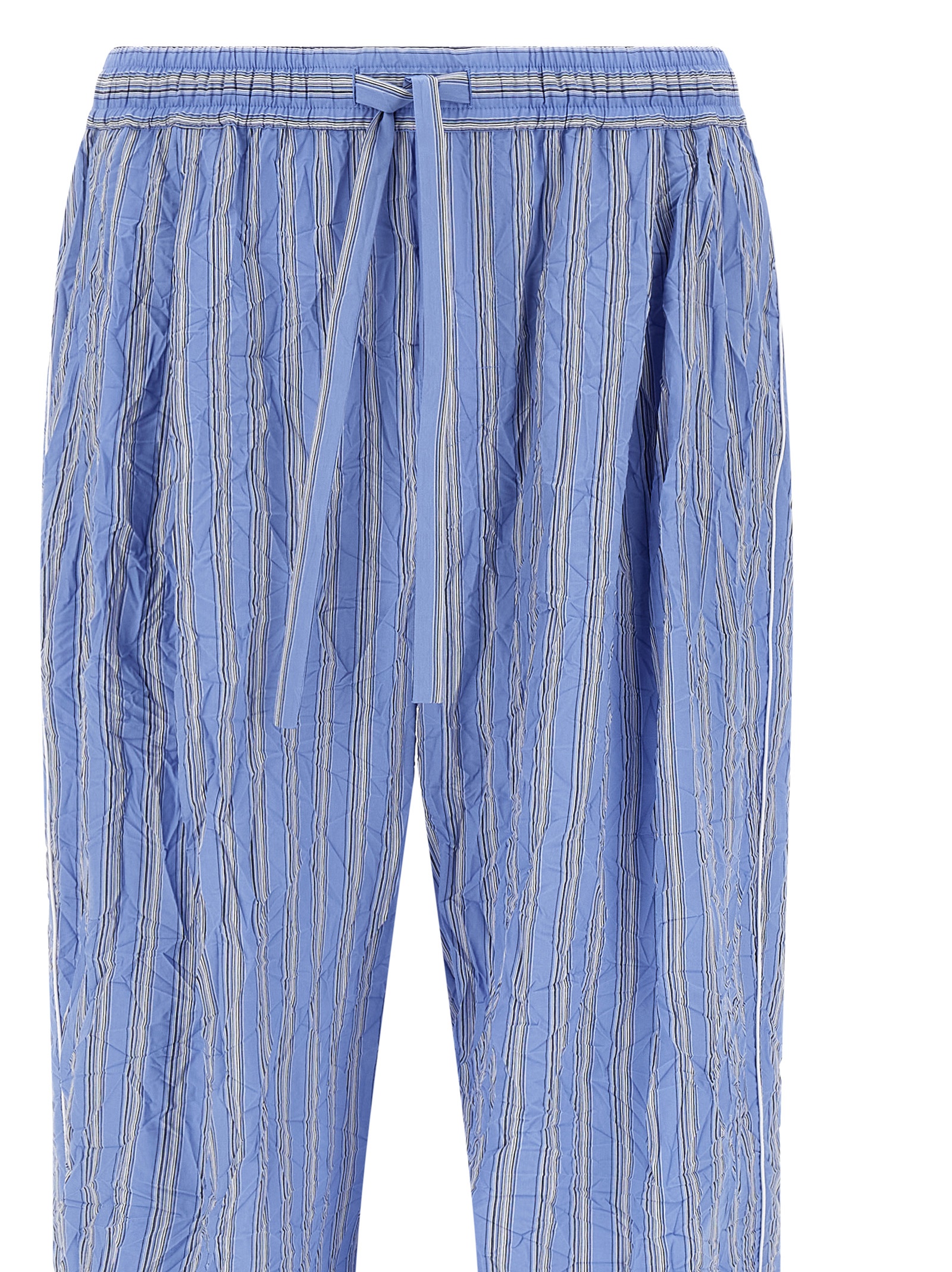 'Vanity' pants in cotton and silk blend canvas froissé patterned striped, pajama model, wide and straight leg, drawstring elastic waistband, trompe l'oeil flap, pockets, solid color piping on the side.