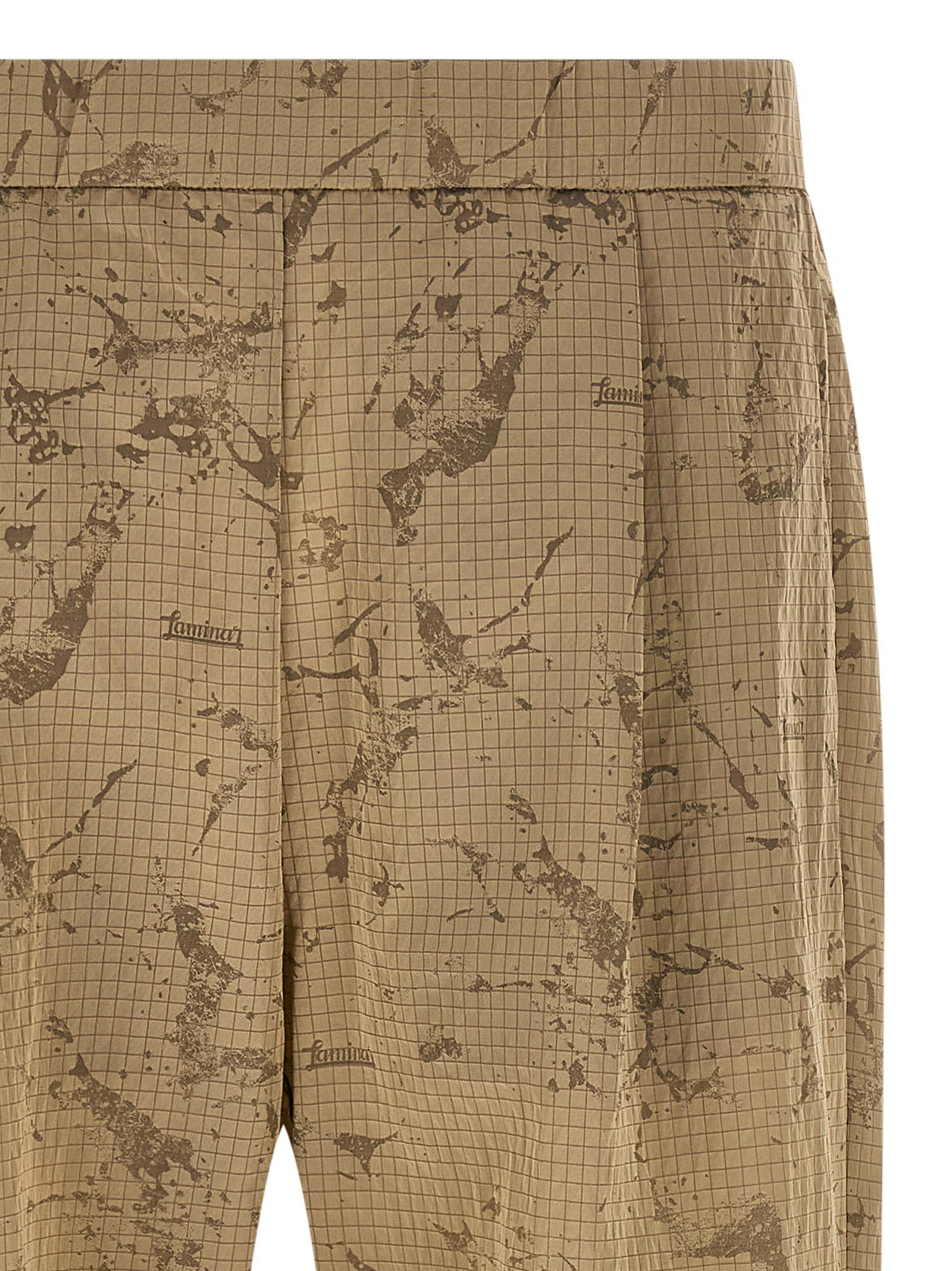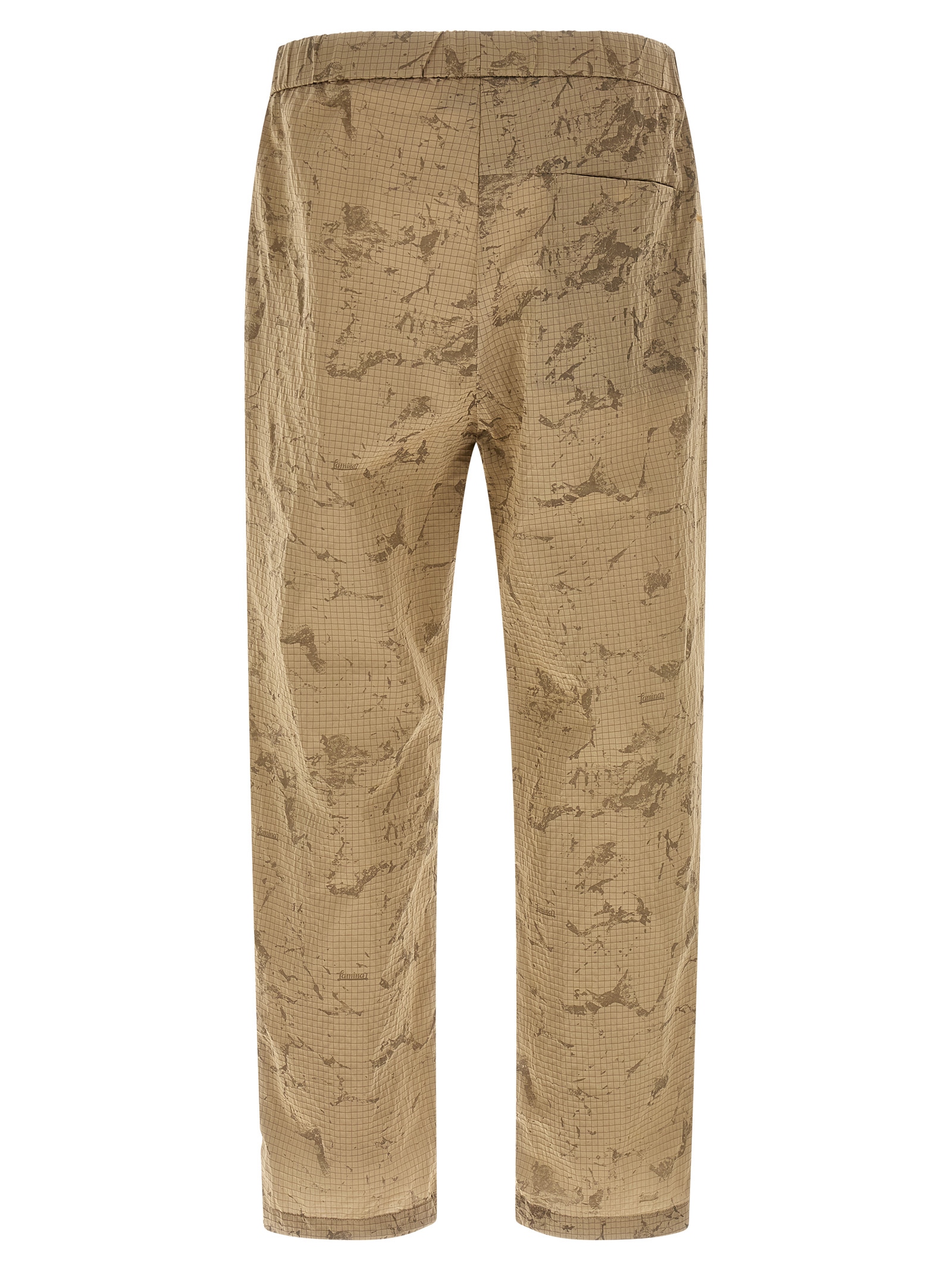 Shiny nylon ripstop pants, camouflage print, loose fit, drawstring elastic waistband, front pin tucks, side pockets, straight leg with elastic hem and half side zip.