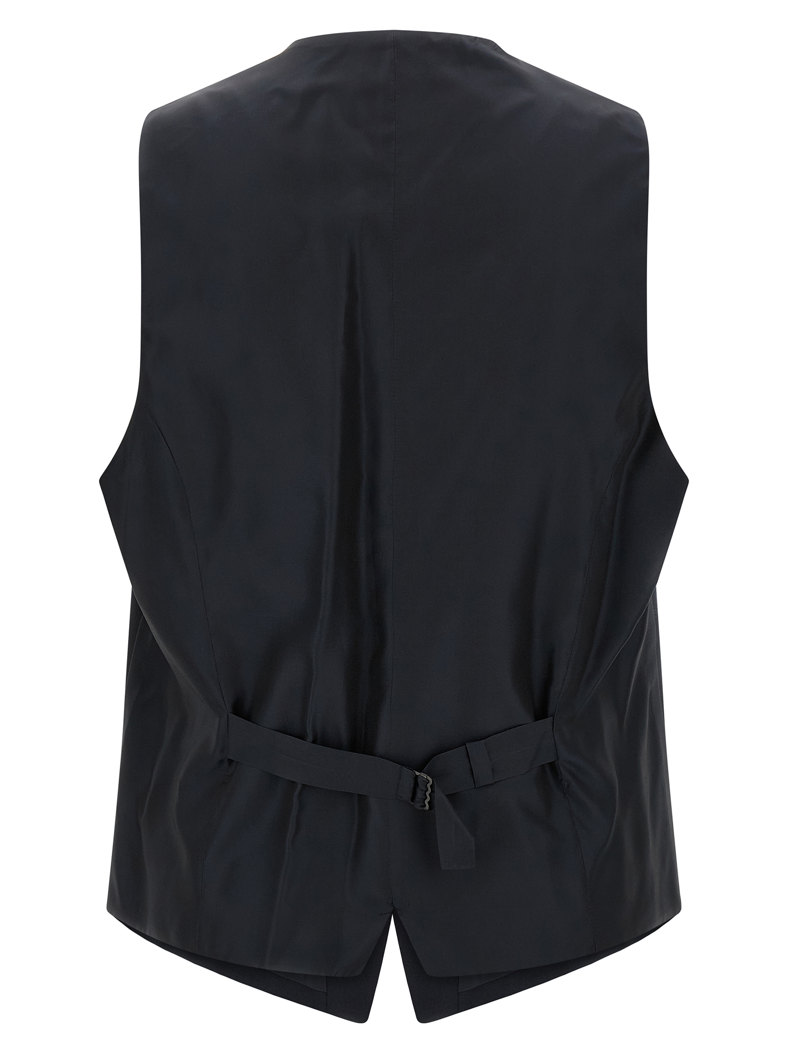 - жилет з V-подібним вирізом, застібка на ґудзиках спереду, регульований ремінець ззаду, накладні кишені; - штани з еластичними складками, кишені «американе» спереду, кишені ззаду, застібка на блискавку та ґудзики спереду, підкладка з віскози.