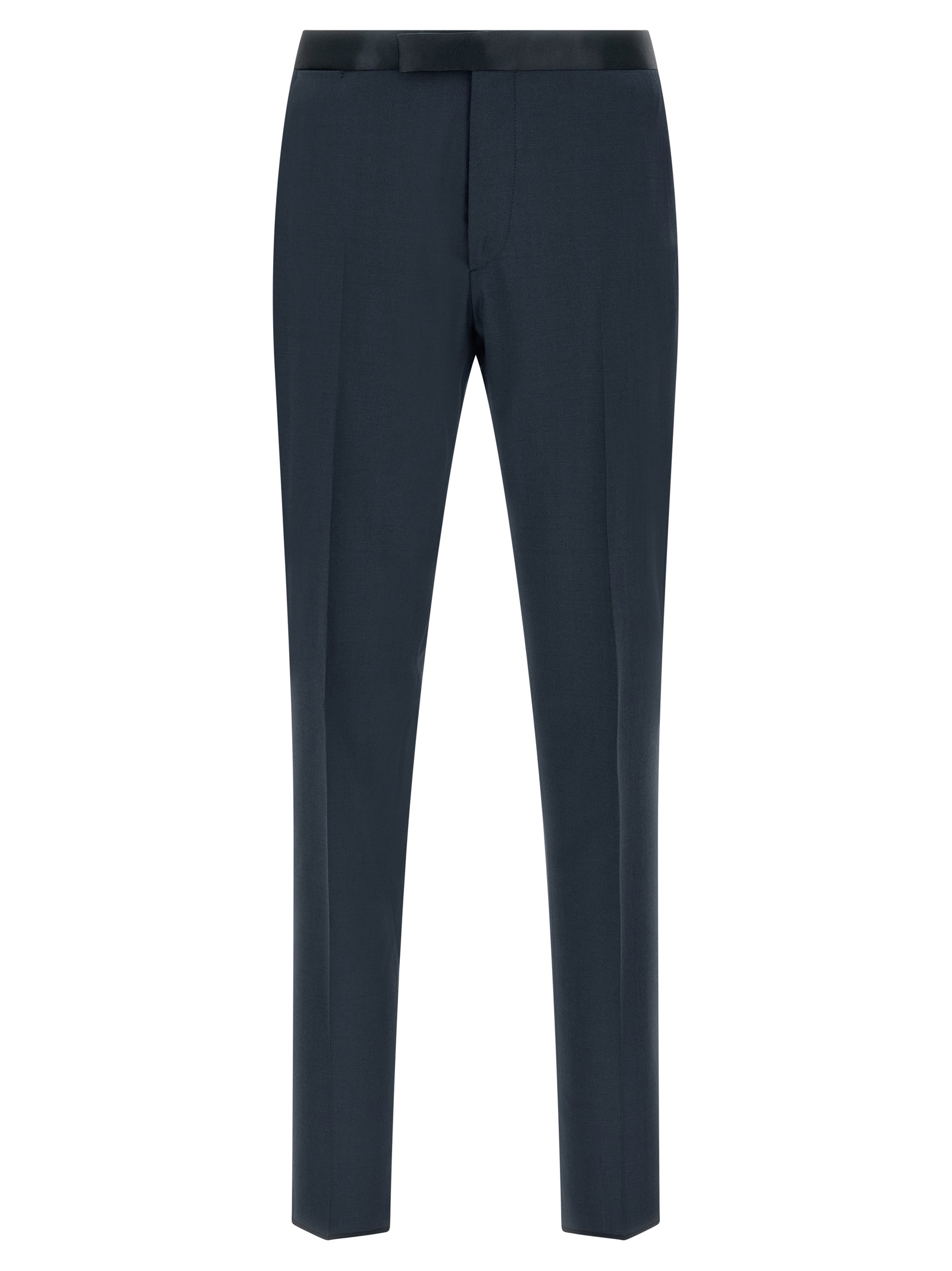Super 110's virgin wool dress with tone-on-tone satin details, tuxedo style consisting of single-breasted blazer with front covered button closure, peak lapels with removable metal brooch, breast pocket, patch pockets, cupro lining, four inner pockets, structured shoulder strap, cuffs with opening buttonholes, back vent and trousers with stretched pleat, straight leg. Front pockets, back welt pockets, zip hook and front button closure, leg bottoms with hem to be finished, cotton lining.