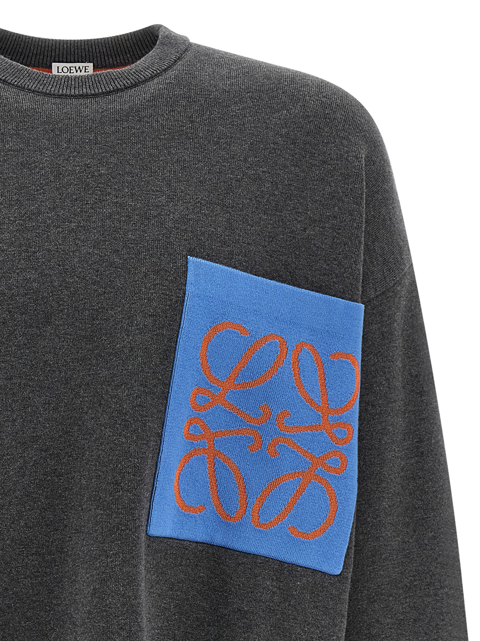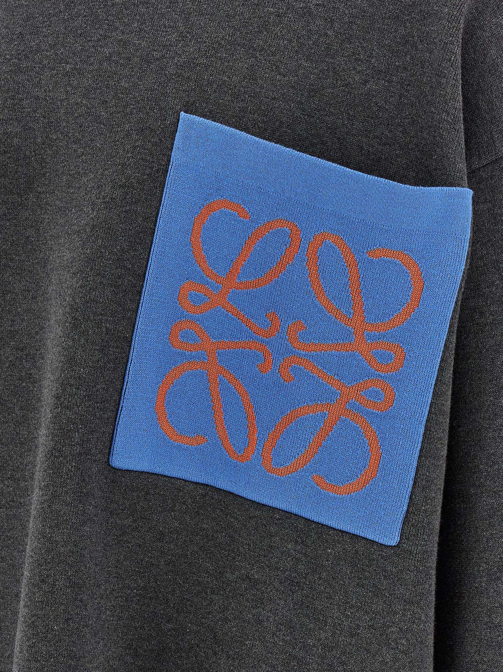 Двосторонній светр середньої ваги з бавовняної суміші, контрастна кишеня з вставкою Anagram, круглий виріз горловини, довгі рукави з манжетами та опущеними плечима, а також необроблений низ.