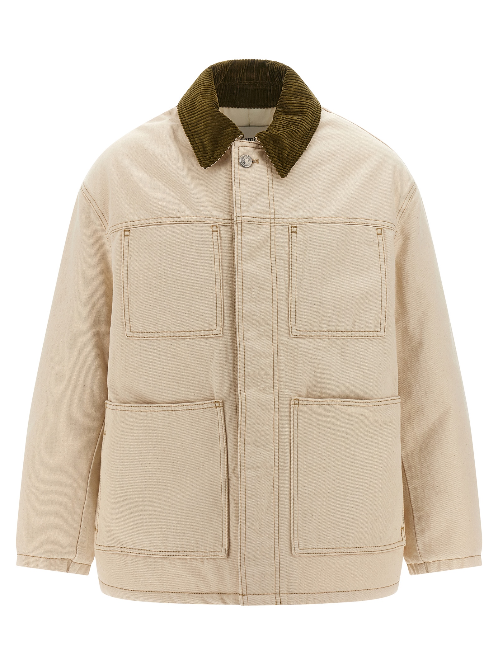 Cotton canvas jacket with padded lining, contrast stitching, 'Worker' style, contrast corduroy shirt collar, front button closure, pockets, long cuffed sleeves, back leather logo patch.