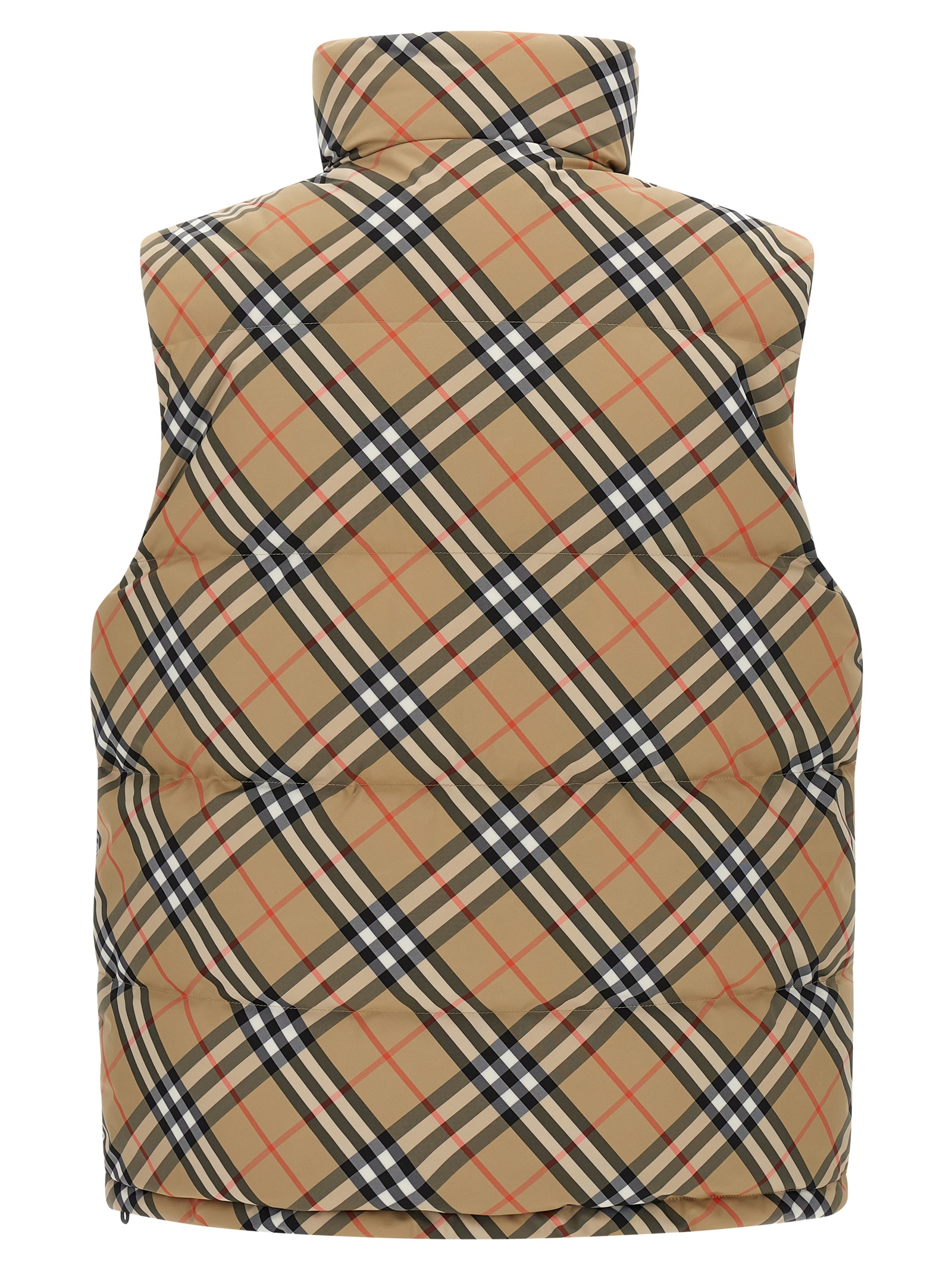 'Snowshill' reversible vest in Burberry Check fabric and solid quilted nylon with goose down padding, silicone 'Equestrian Knight Design' patch and front zip closure, standing collar, pockets, drawstring at the hem.