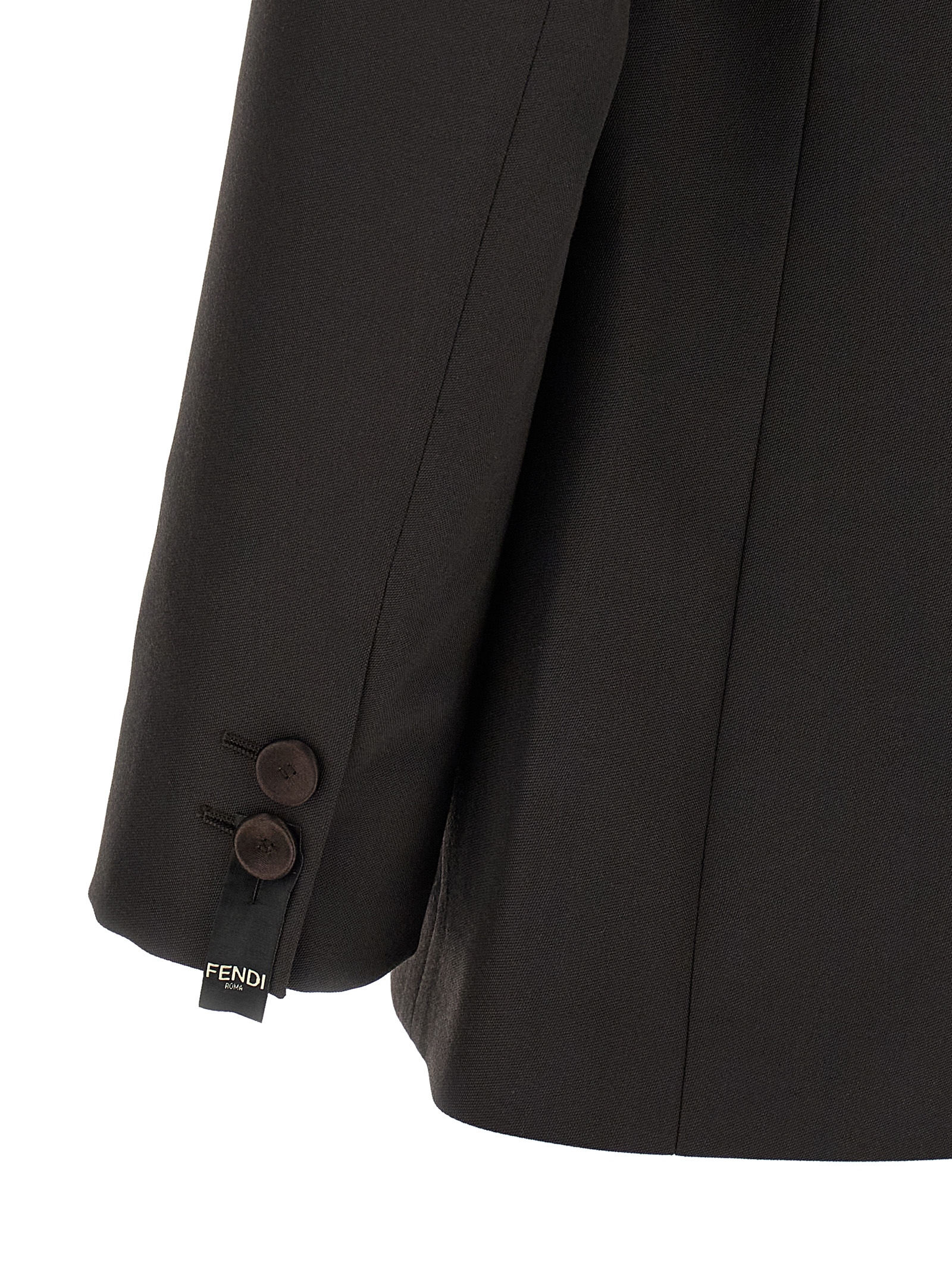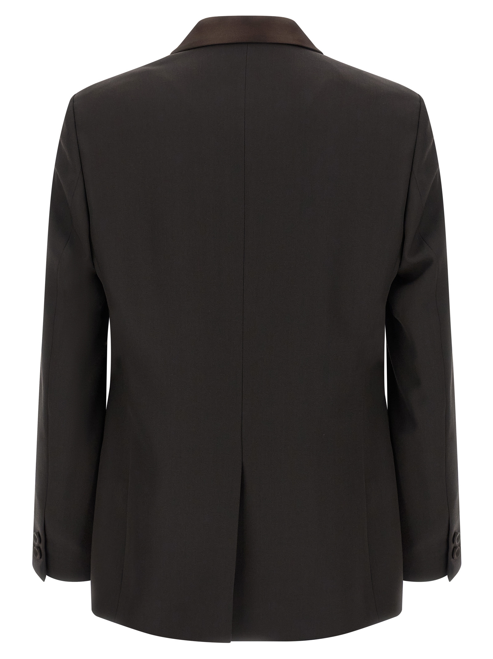Single-breasted wool crêpe blazer with front button closure, tone-on-tone silk mirror lapels, chest pocket, patch pockets, structured shoulder strap, cuffs with open buttonholes, back vent, lining.
