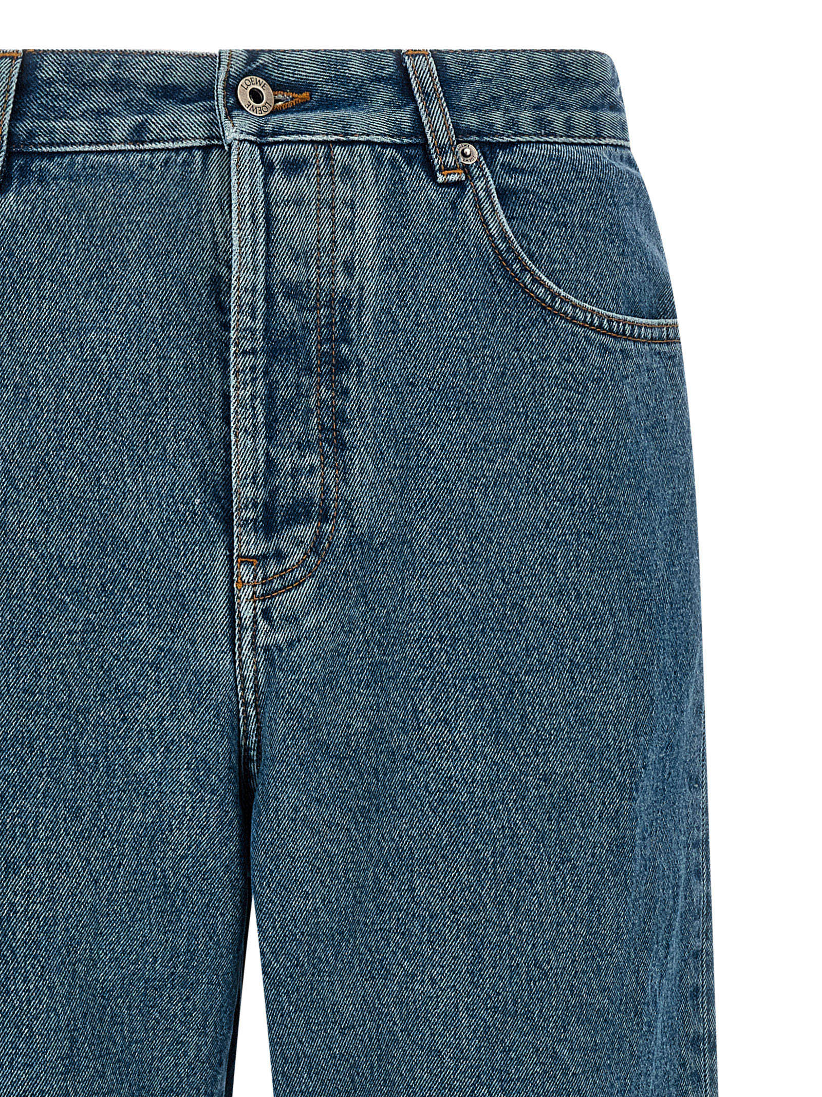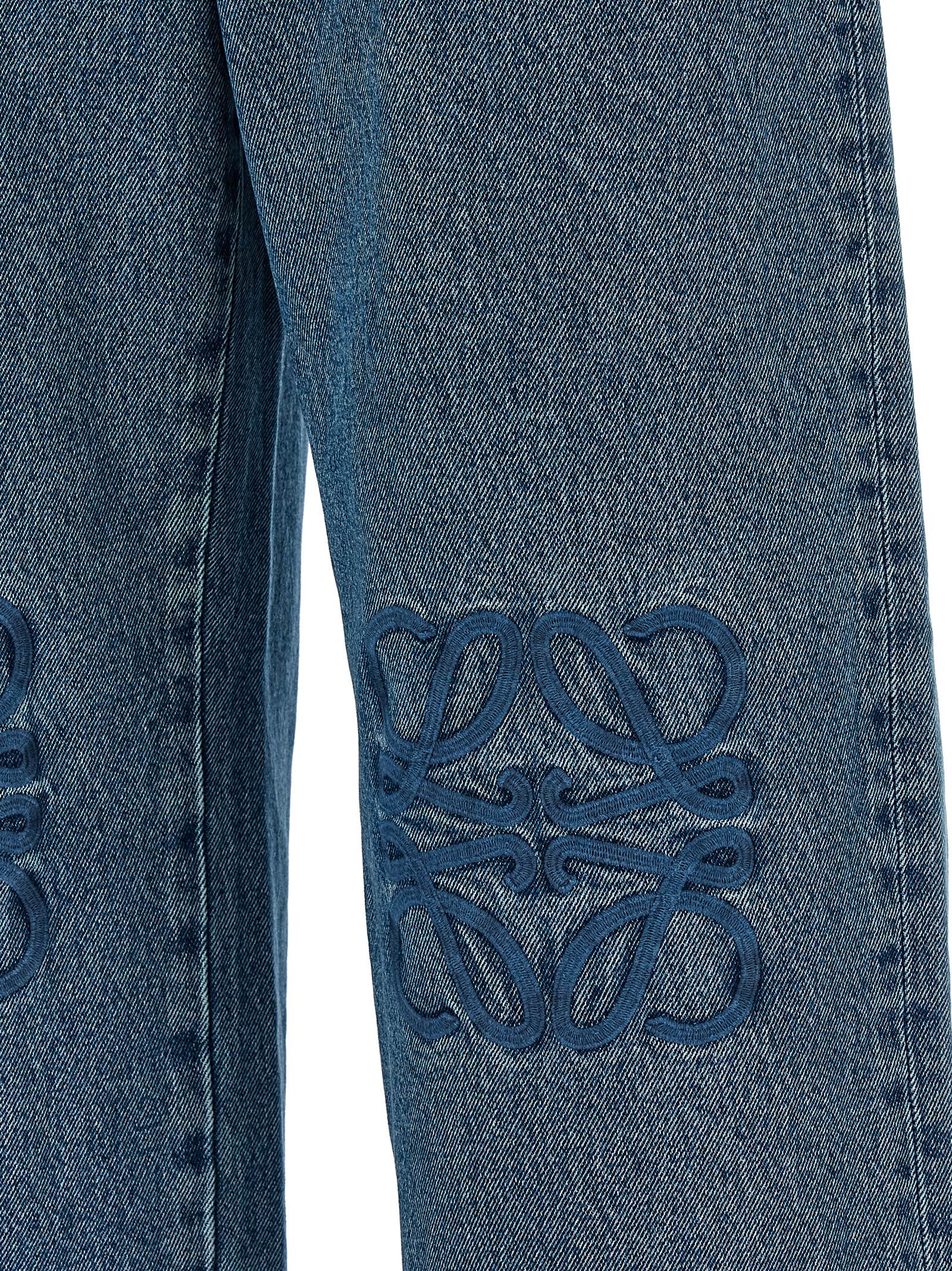 Cotton denim jeans with tone-on-tone embroidery on the front Anagram pattern, contrast stitching, wide and straight leg, zip and button closure, five pockets, and leather logo label at the back.