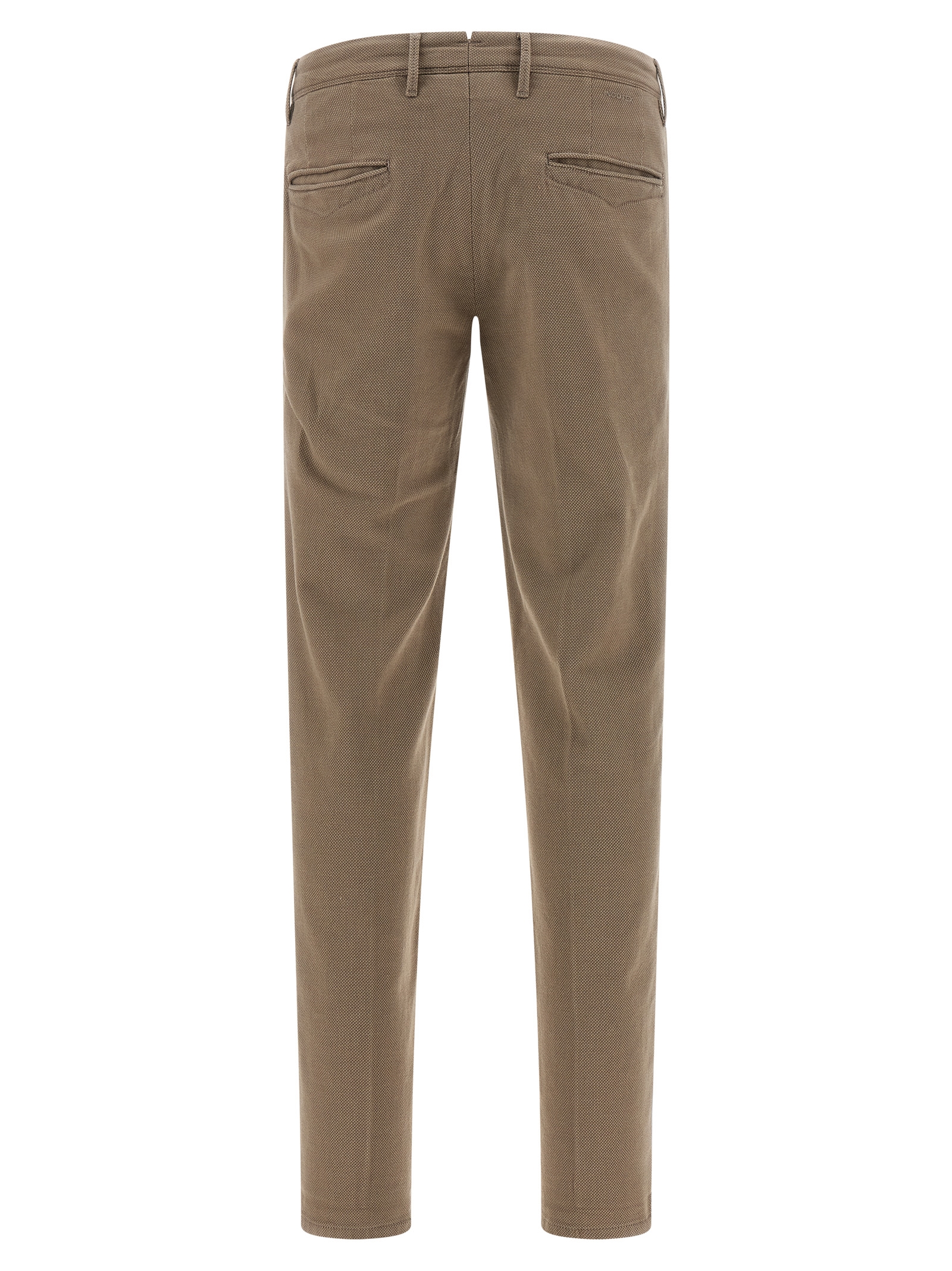 Stretch cotton honeycomb trousers, stretched pleat, low waist, front zip and button closure, pockets, straight leg.