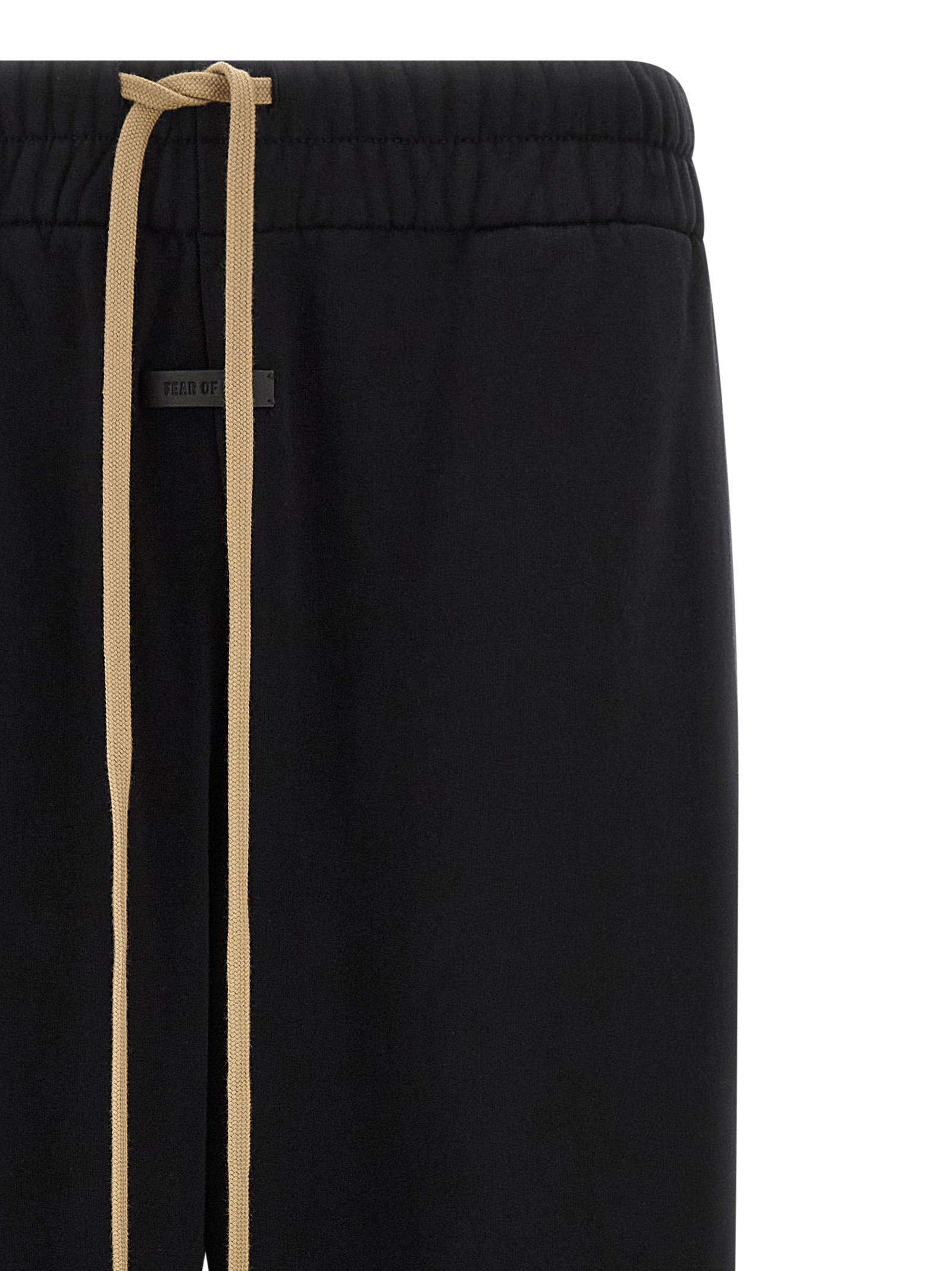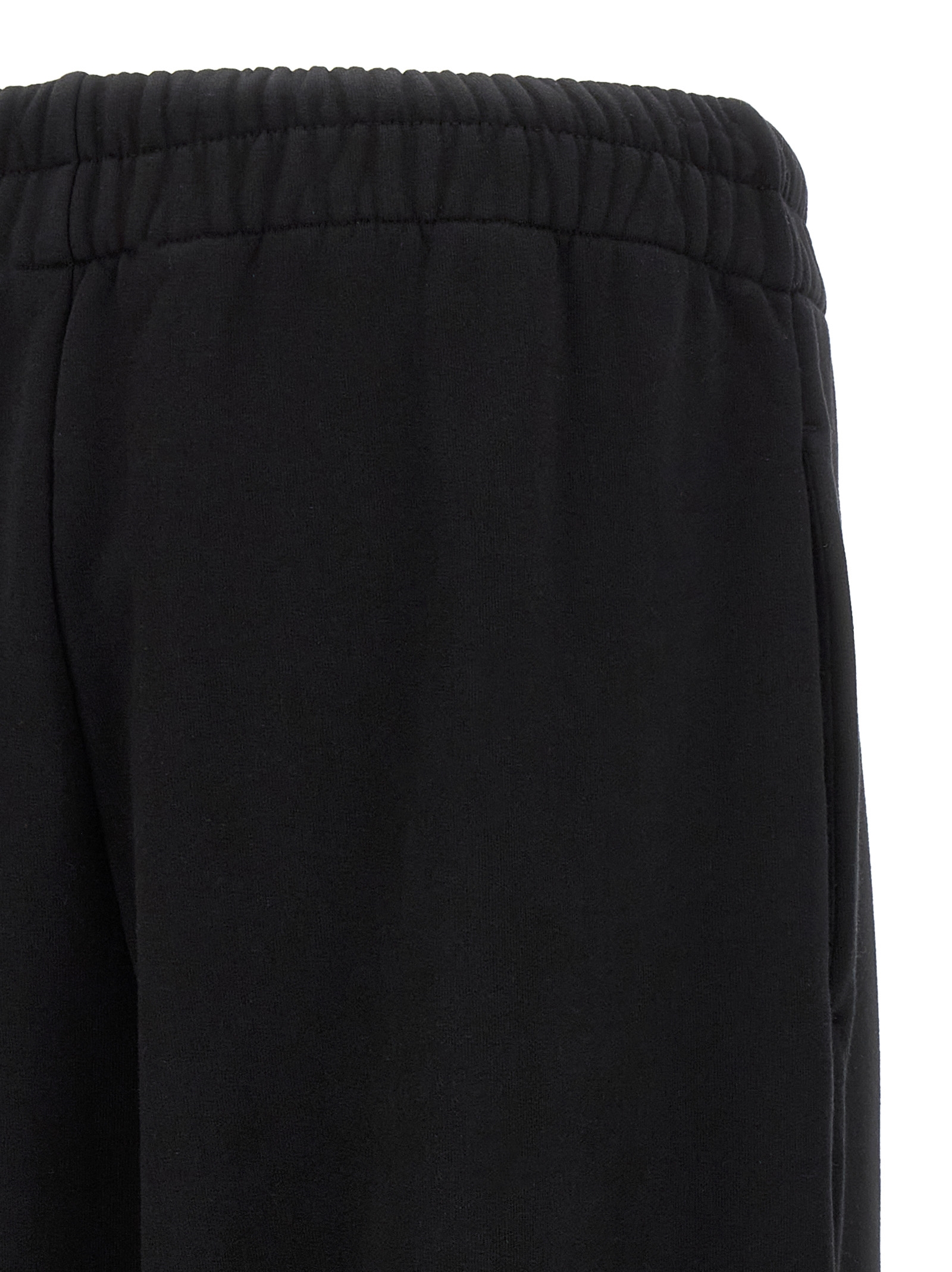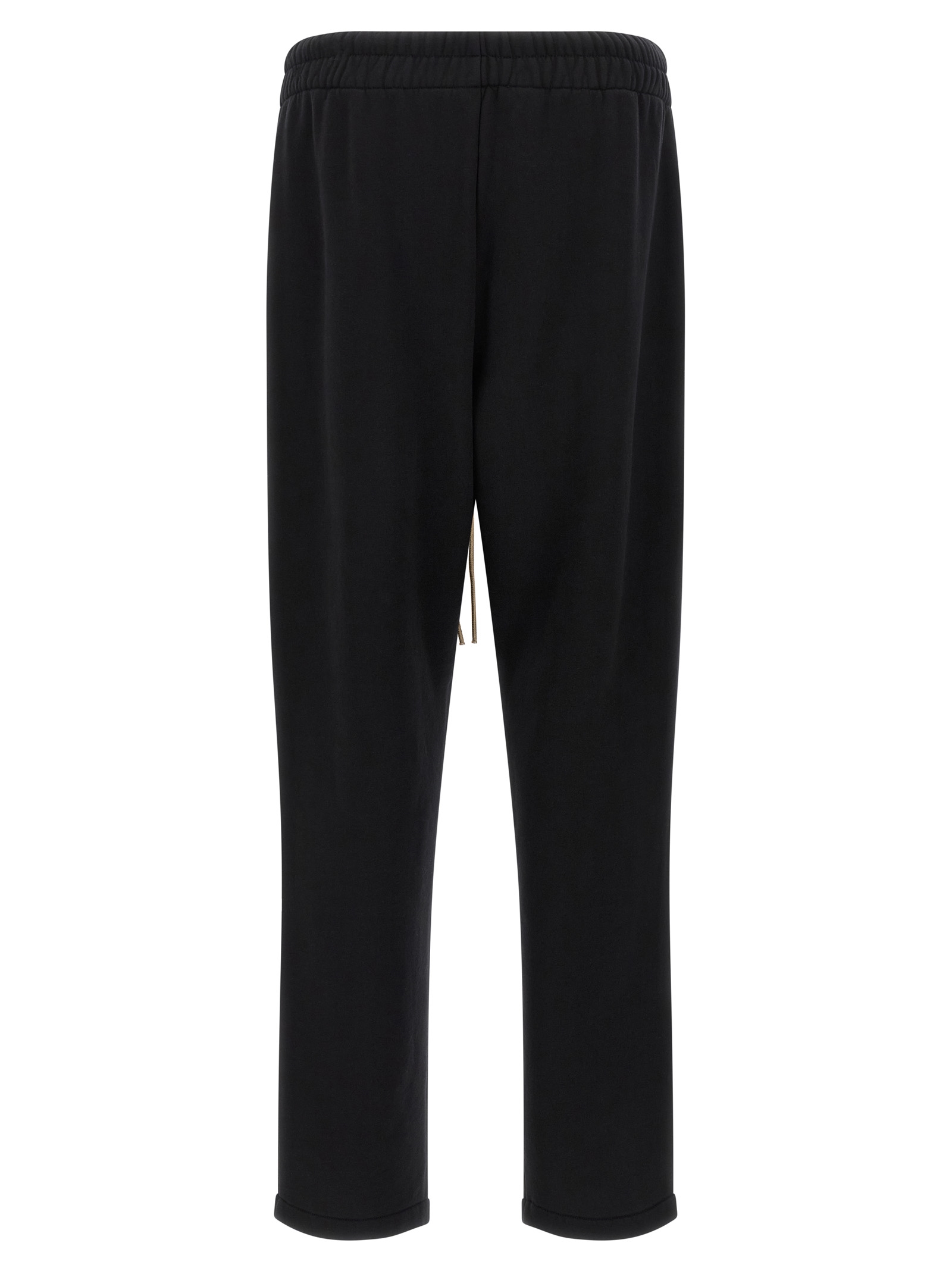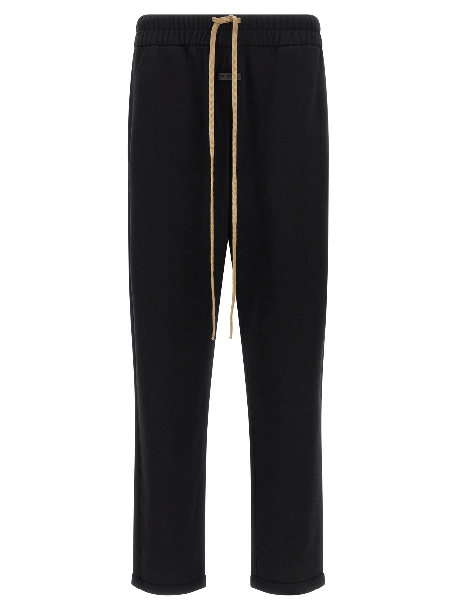 Brushed cotton joggers, front leather logo patch, adjustable drawstring elastic waistband, pockets, wide, straight leg.