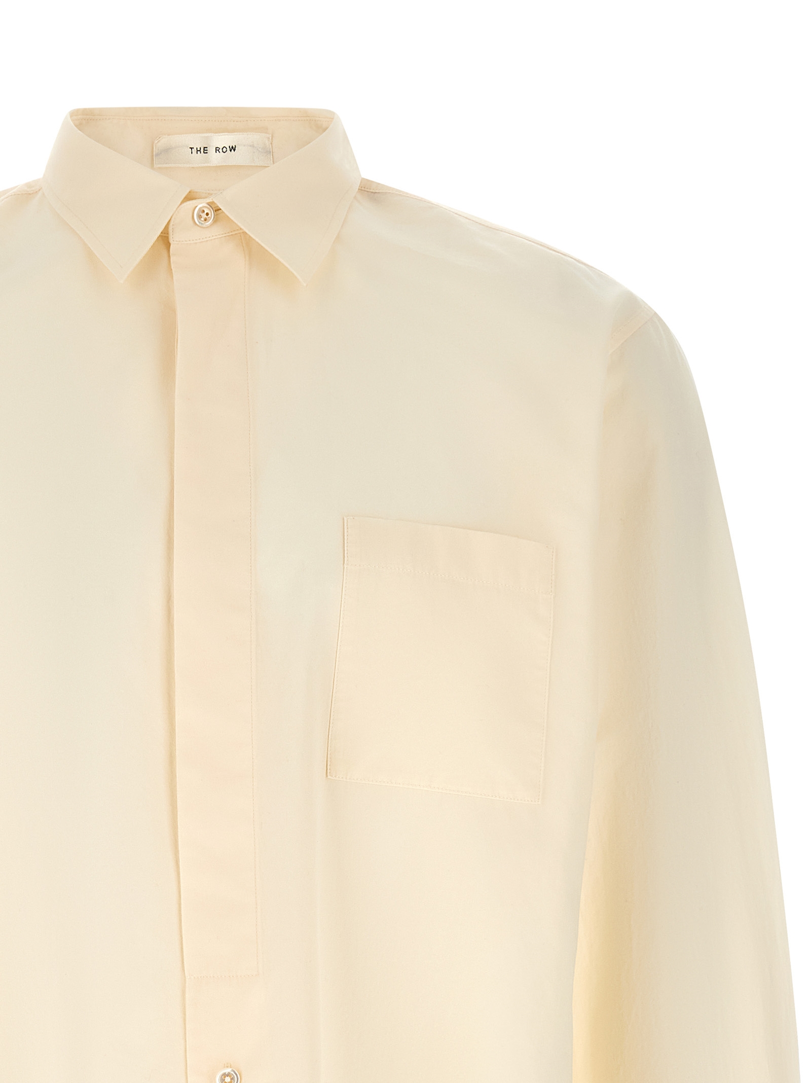 'Marek shirt' cotton poplin shirt with slightly ruffled texture, collar, front patch pocket, front mother-of-pearl button closure and front flap, back yoke, long sleeves with cuffs and buttons.