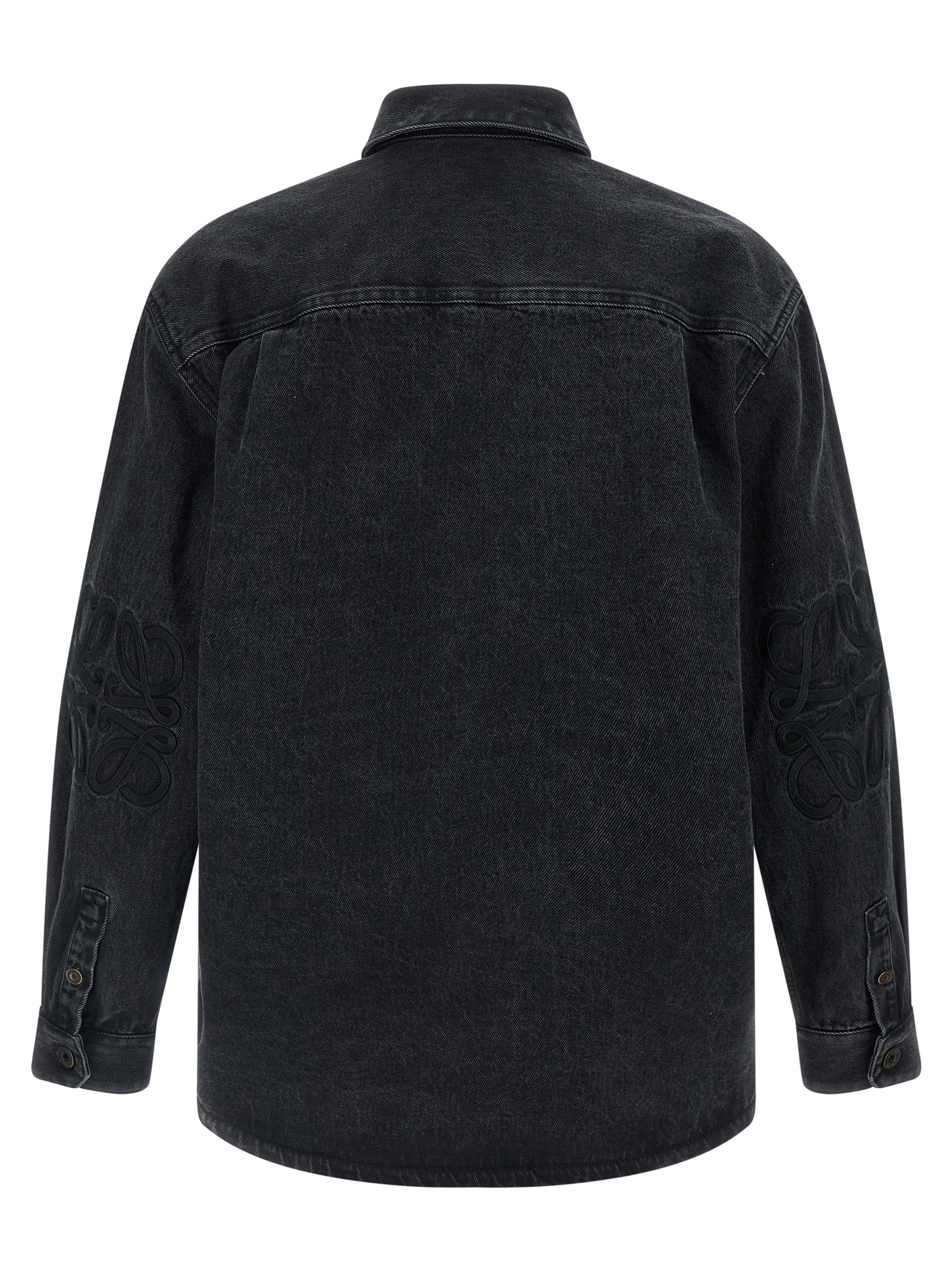 Medium weight cotton denim overshirt, chest pocket, front metal button closure, long cuffed sleeves and tone-on-tone 'Anagram' embroidery on the elbow.