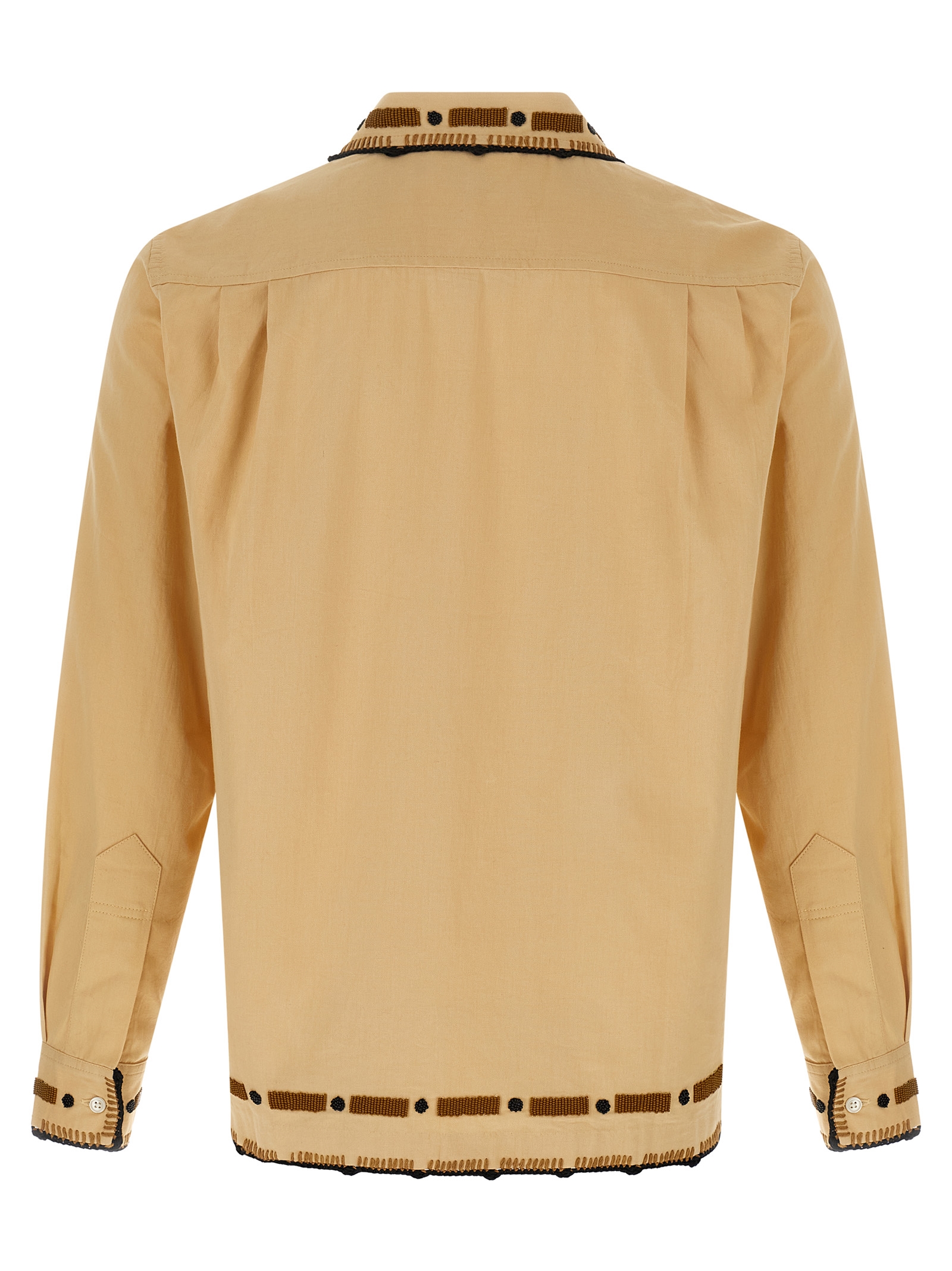 'Beaded Ryegrass' cotton shirt with embroideries and handmade beads, front button closure, long cuffed sleeves.
