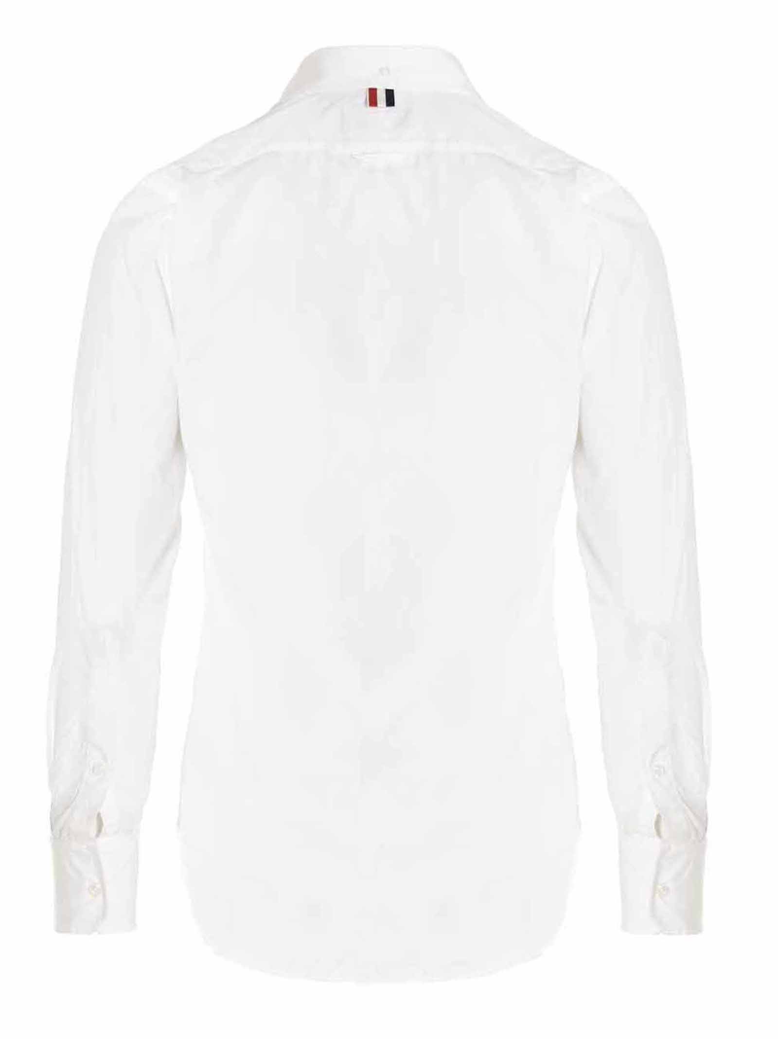 Solid cotton poplin shirt, front button closure with striped grosgrain detail, breast pocket, long sleeve with cuff, back logo, front logo patch.