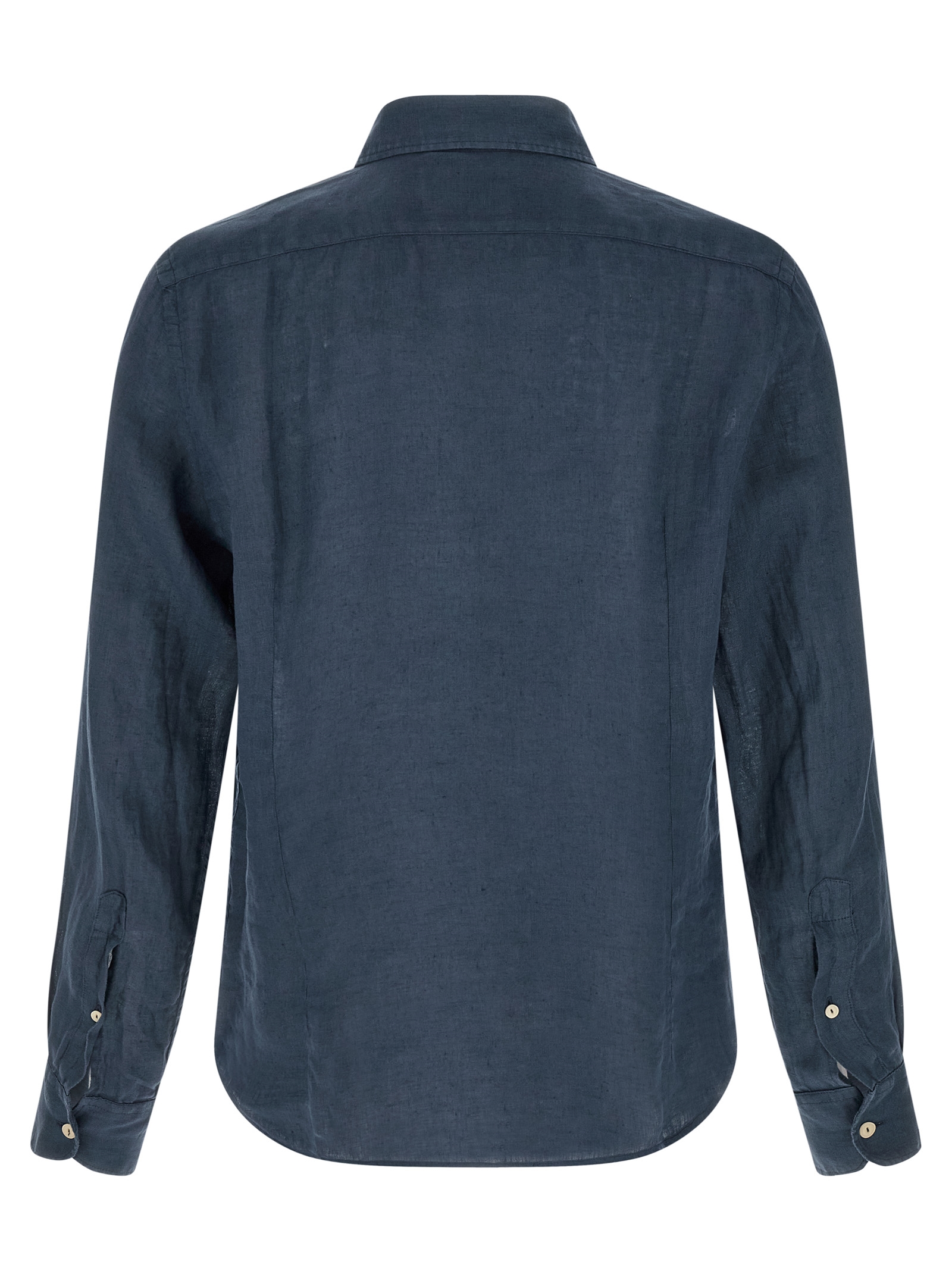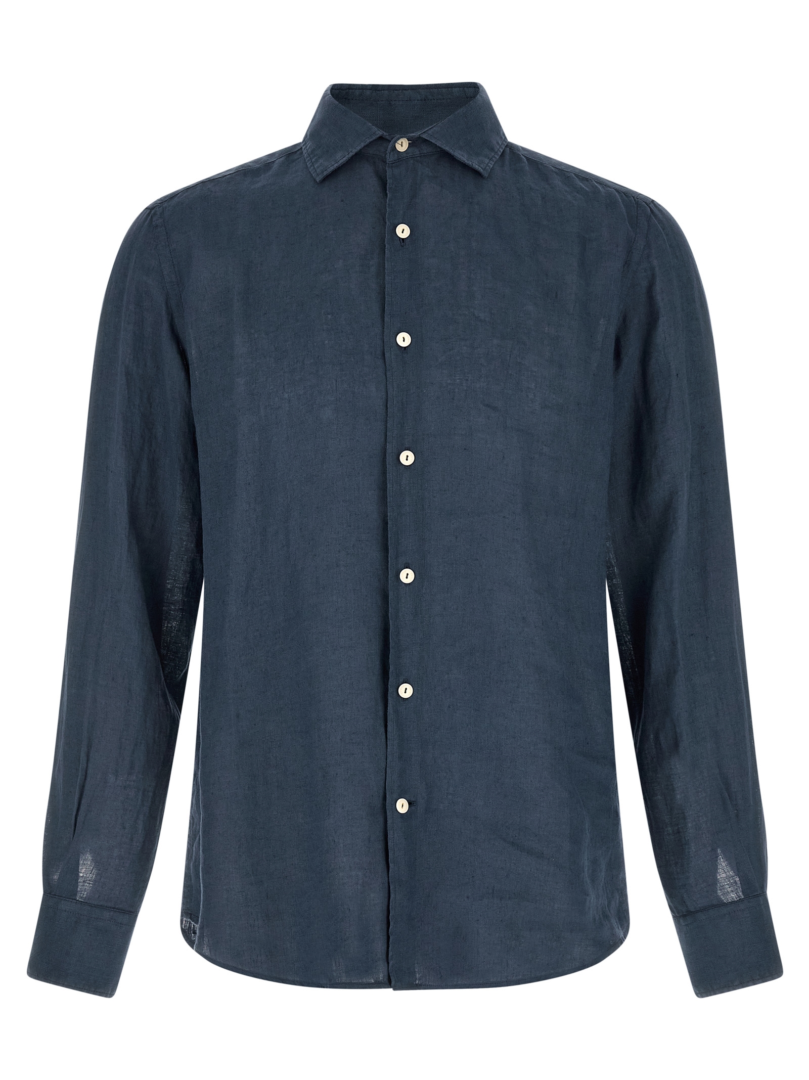 'Pamplona' linen shirt with pointed collar, front button closure, rounded hem, long sleeves with cuffs and buttons.