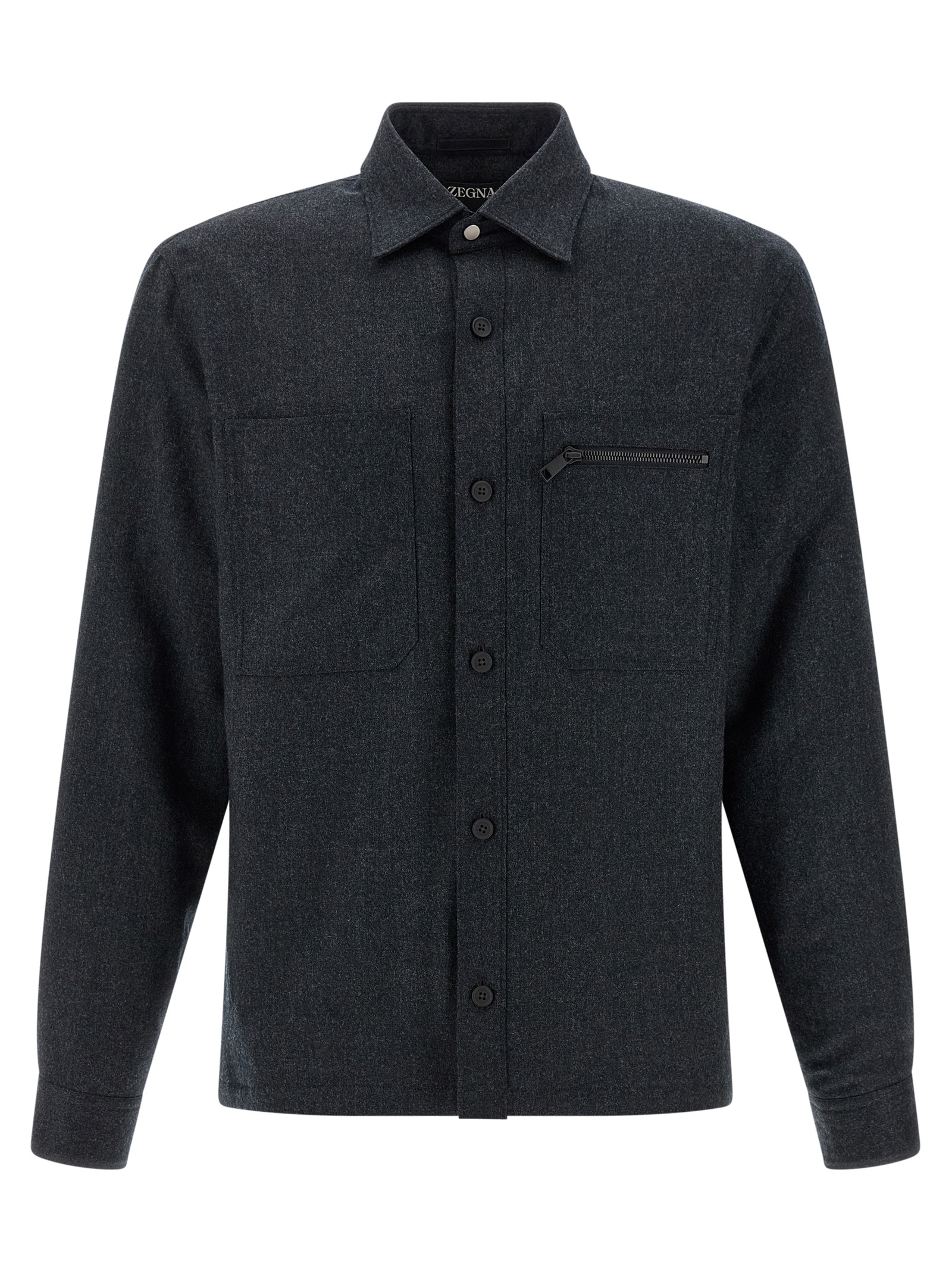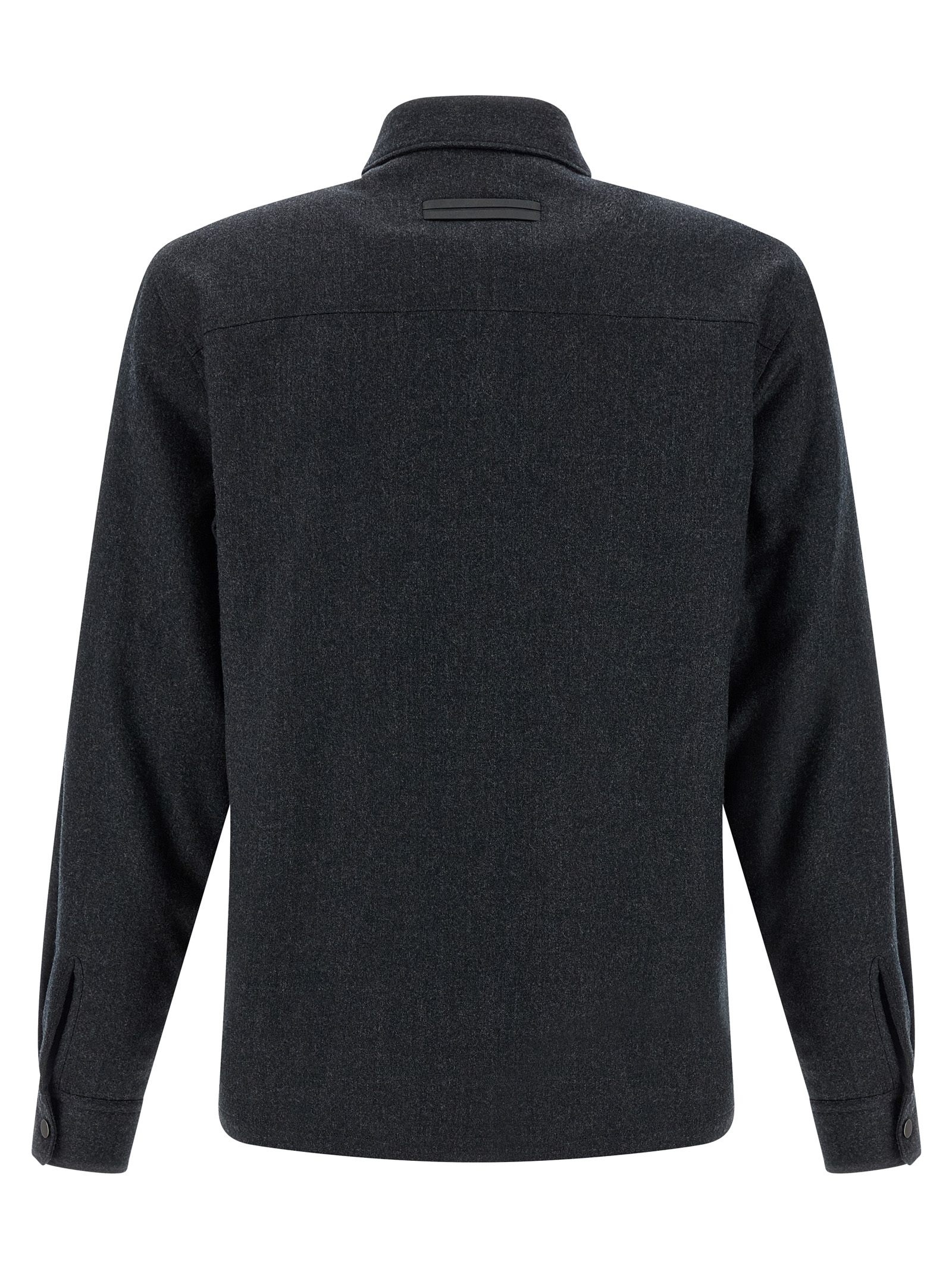 Lightly padded techmerino overshirt, front button closure, pockets, long cuffed sleeves.