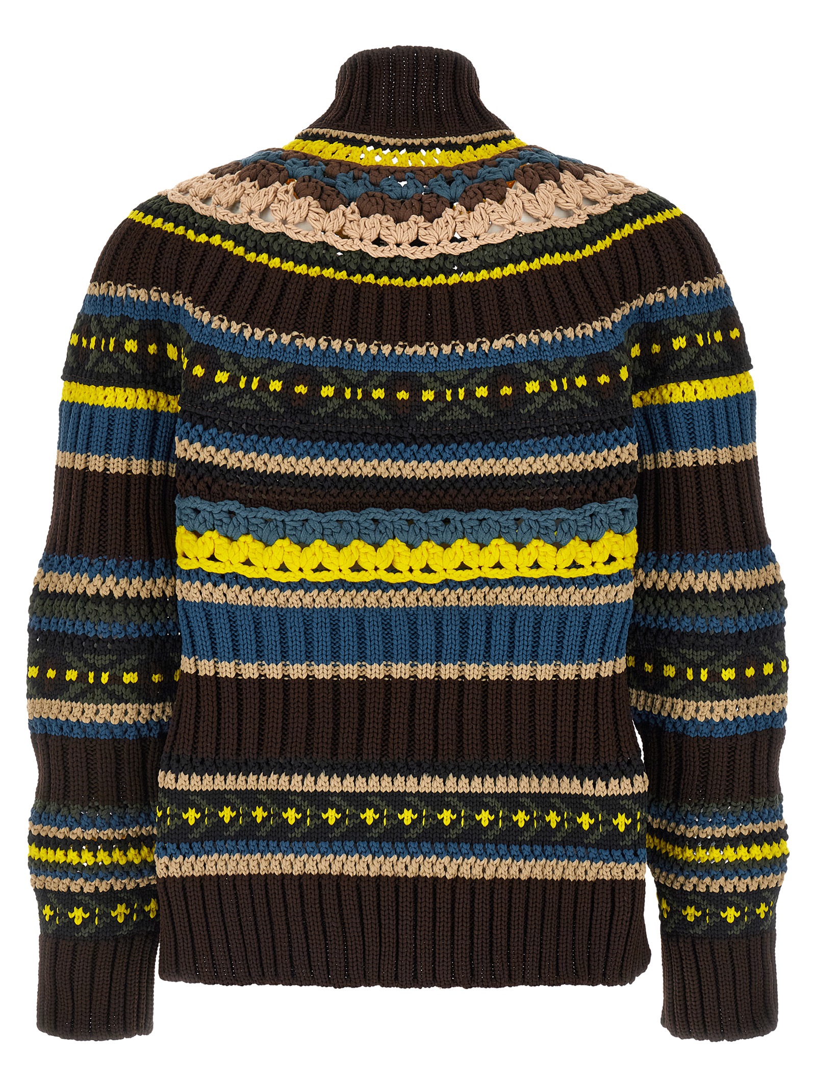 Knit' cardigan in extra heavy cotton blend knitted with openwork details, standing collar, zip closure and hidden snap buttons on the front, pockets, long cuffed sleeves, and band on the hem.
