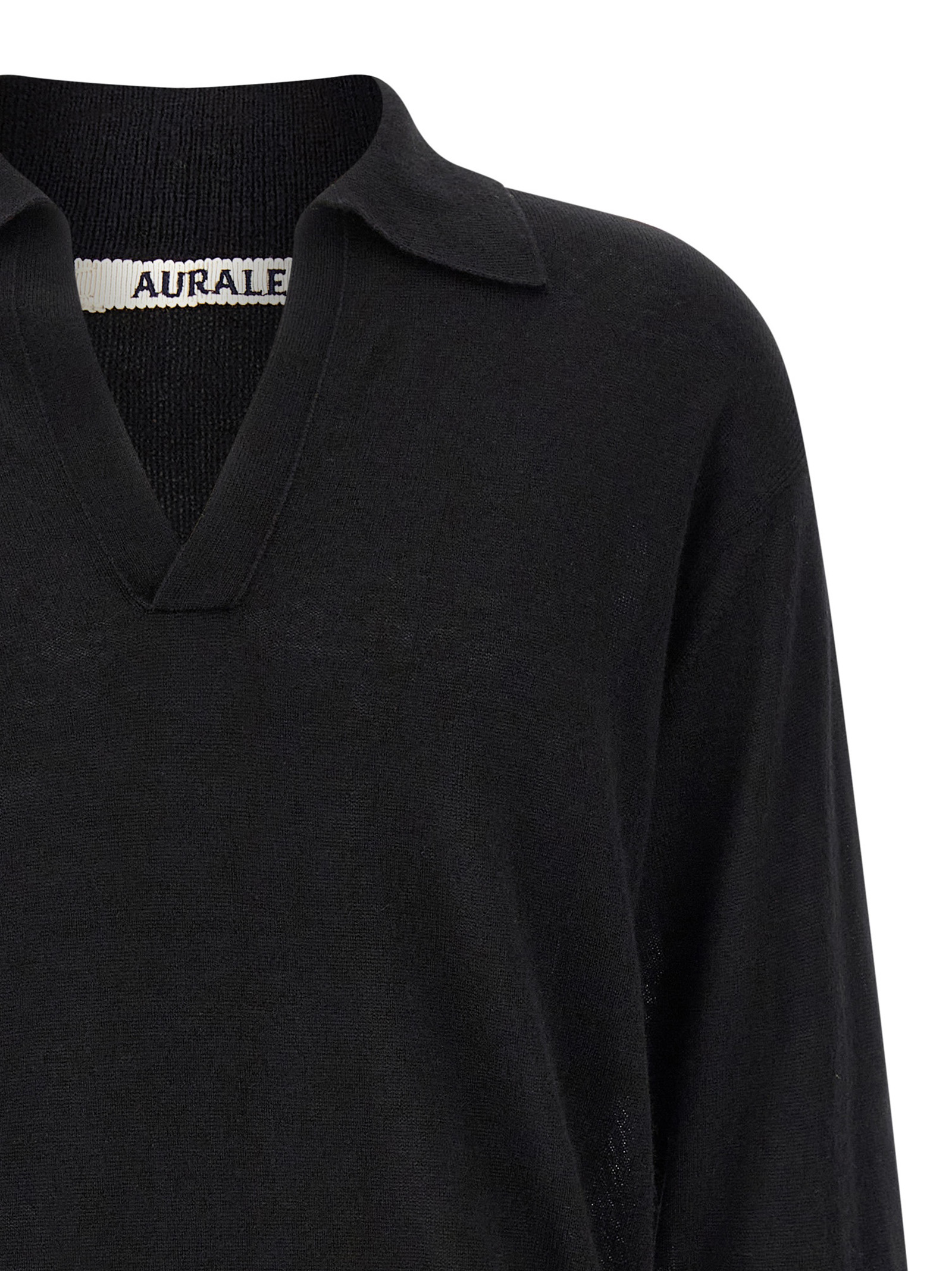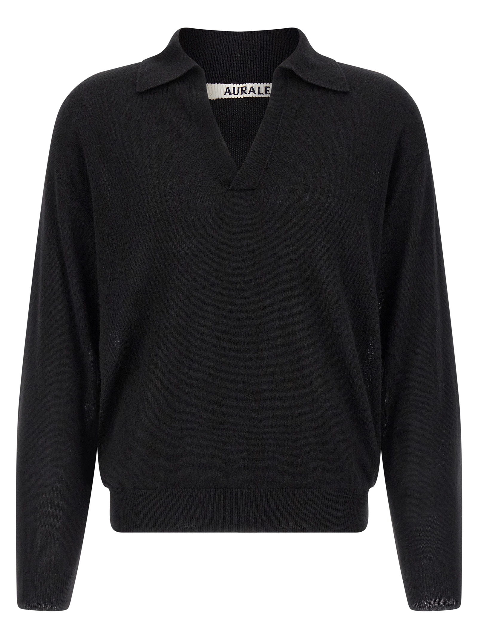 'Knit Skipper Polo' cashmere and silk blend sweater, pointed collar with V-neck, long sleeves with cuffs and dropped shoulders, slightly elasticated ribbed knit hem.