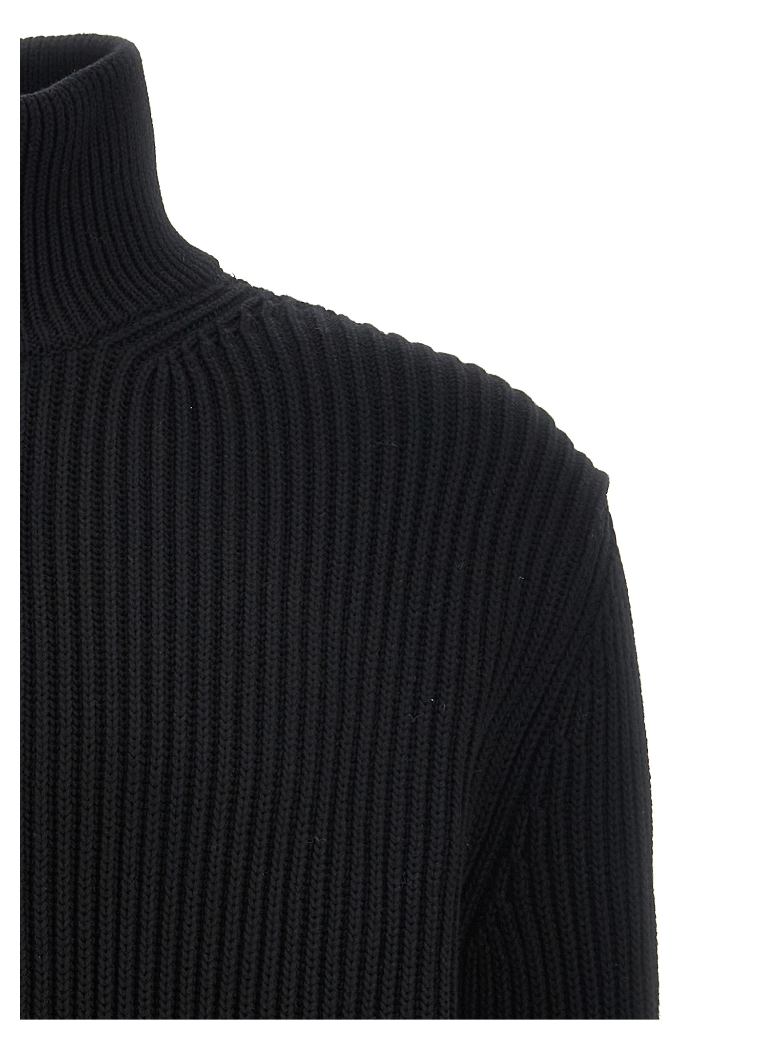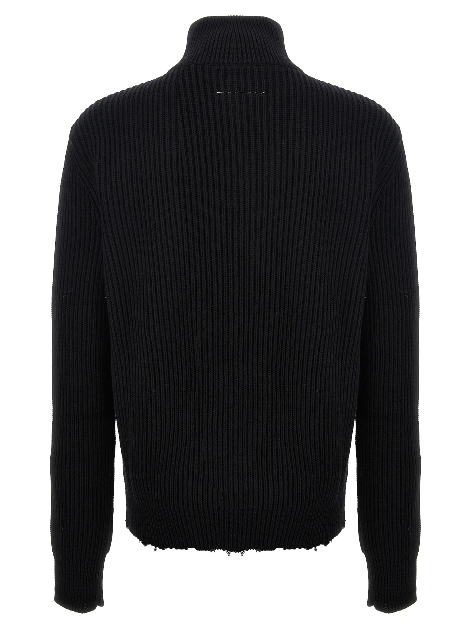 'Sportsjacket' ribbed cotton knit cardigan with high neck, zip closure, long sleeves, frayed hem.