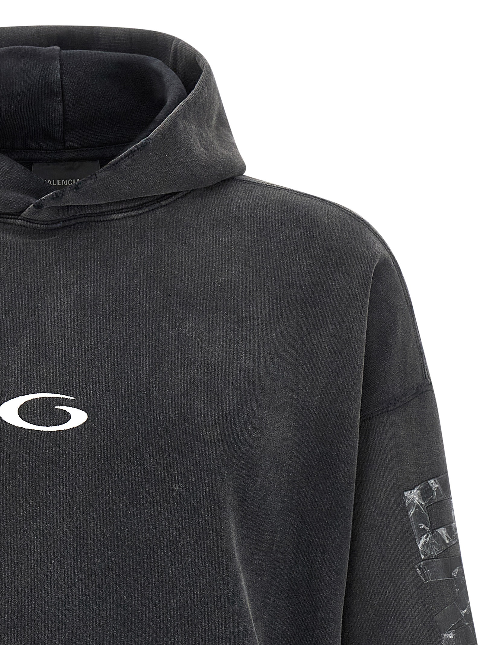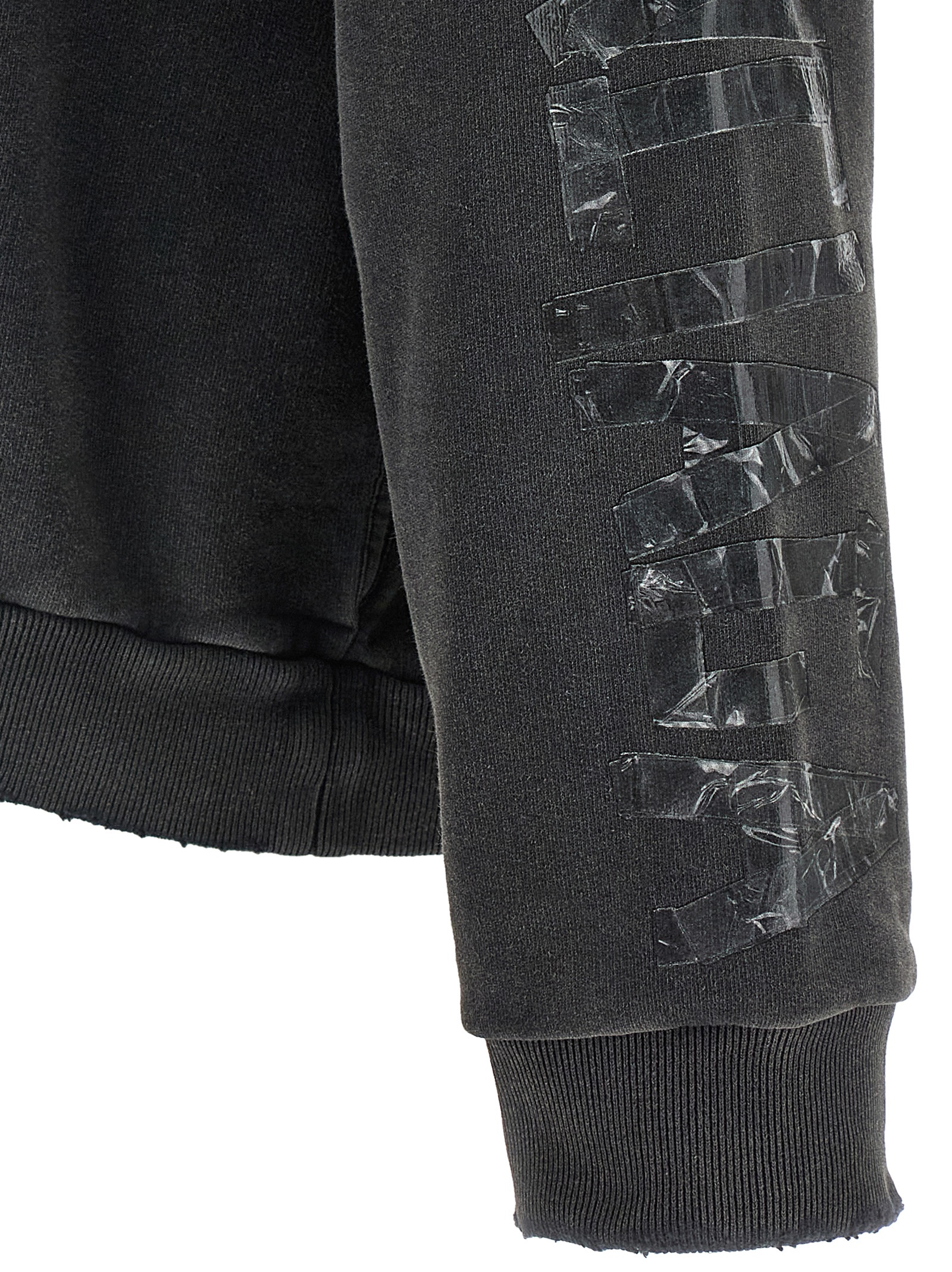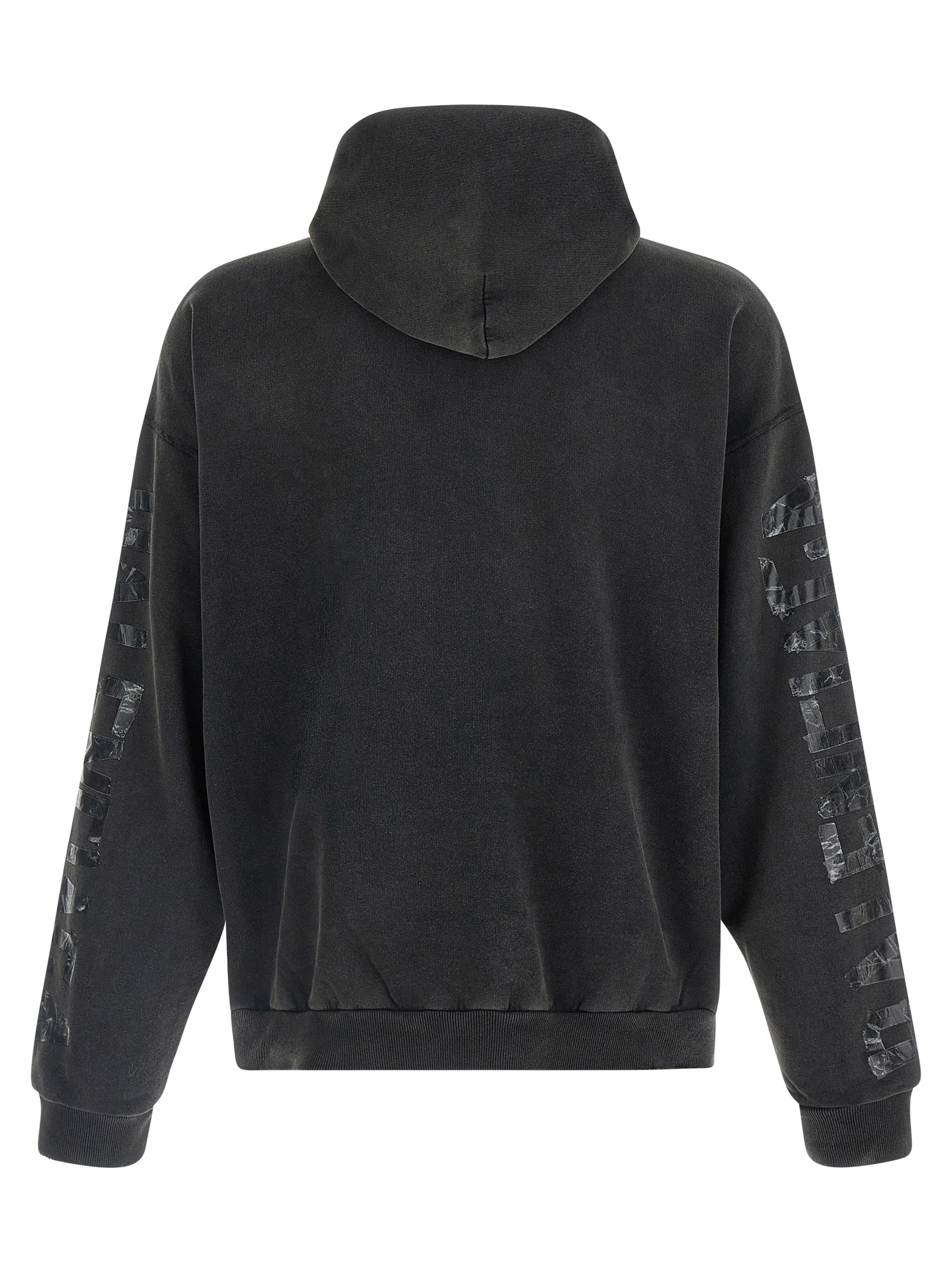 Washed and used dry fleece hoodie with logo embroidery and ripped front pocket, long cuffed sleeves, dropped shoulders and 'Transparent Tape' pattern.