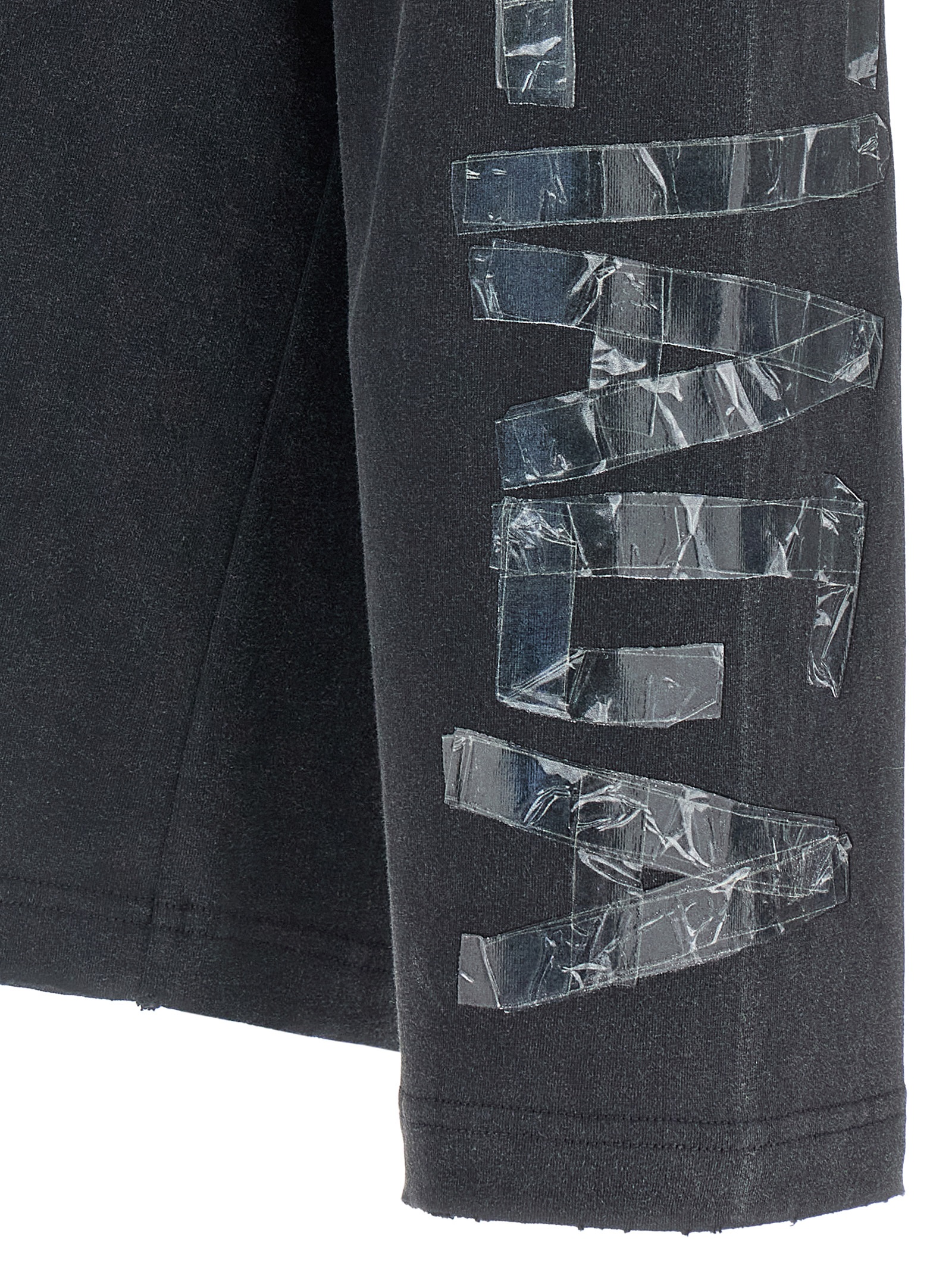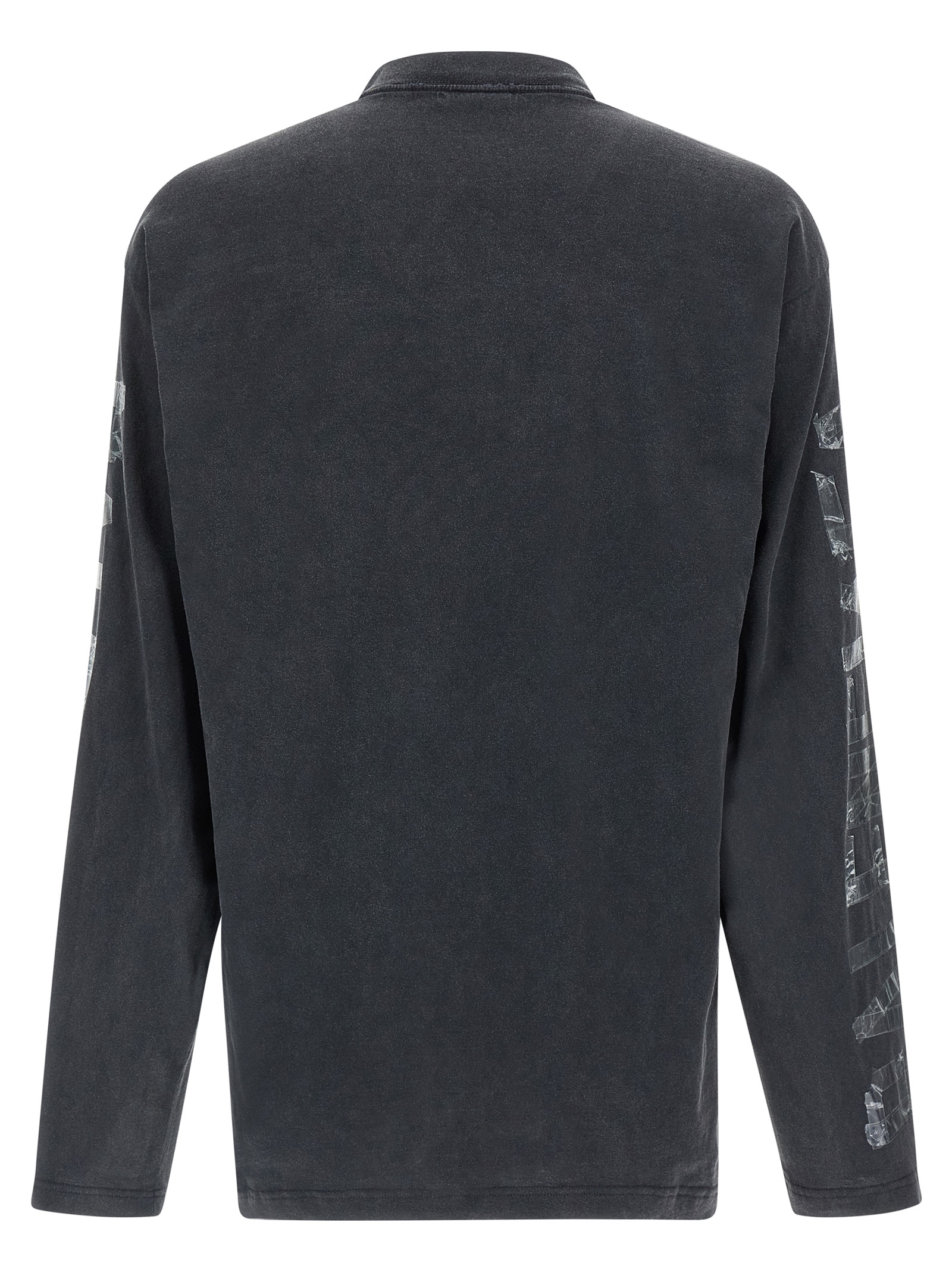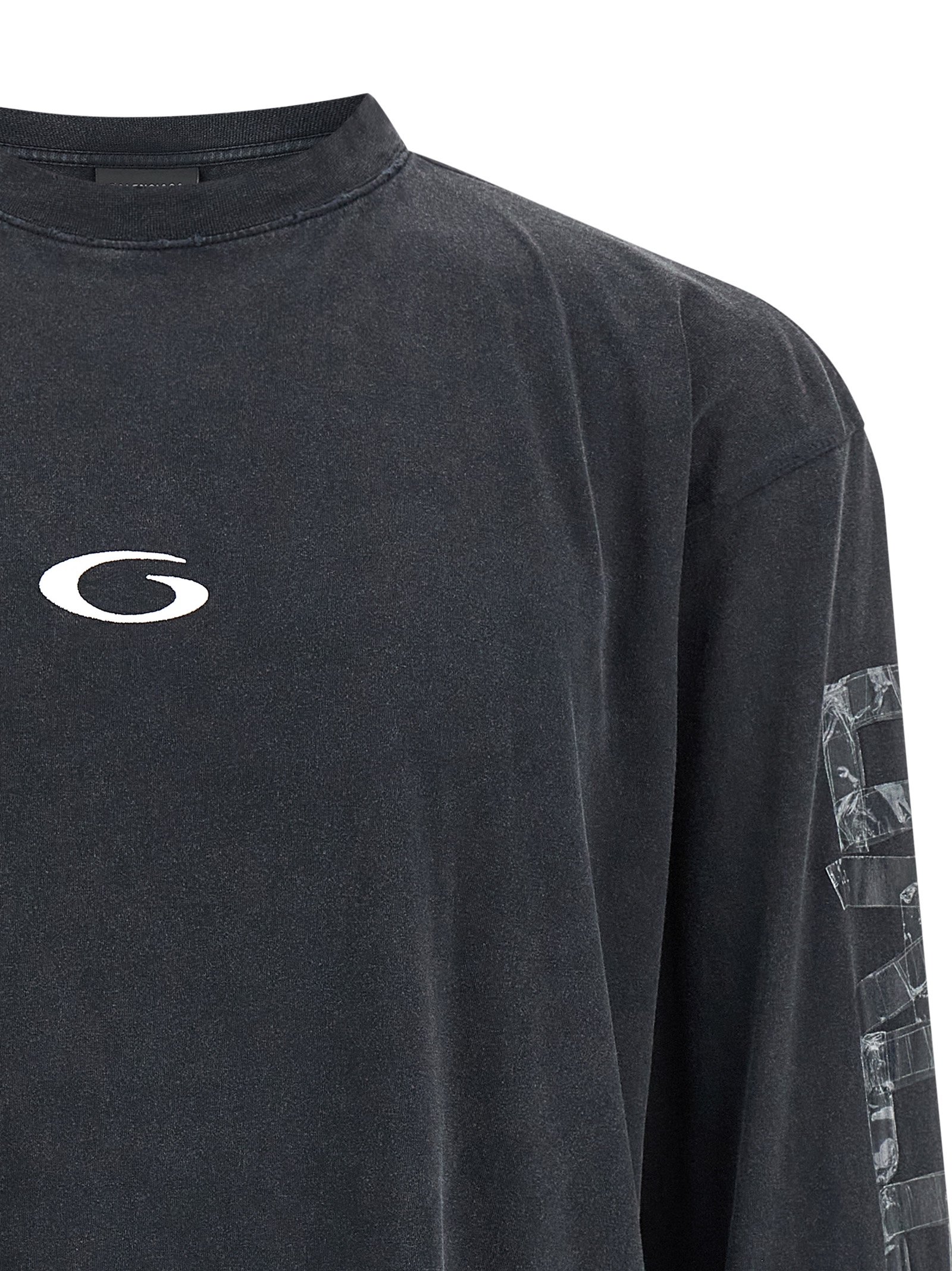 'Shifted' faded dry jersey T-shirt, front 'Loop Sports' embroidery, crew neck, long cuffed sleeves, 'Transparent Tape' print and dropped shoulders, asymmetrical hem.