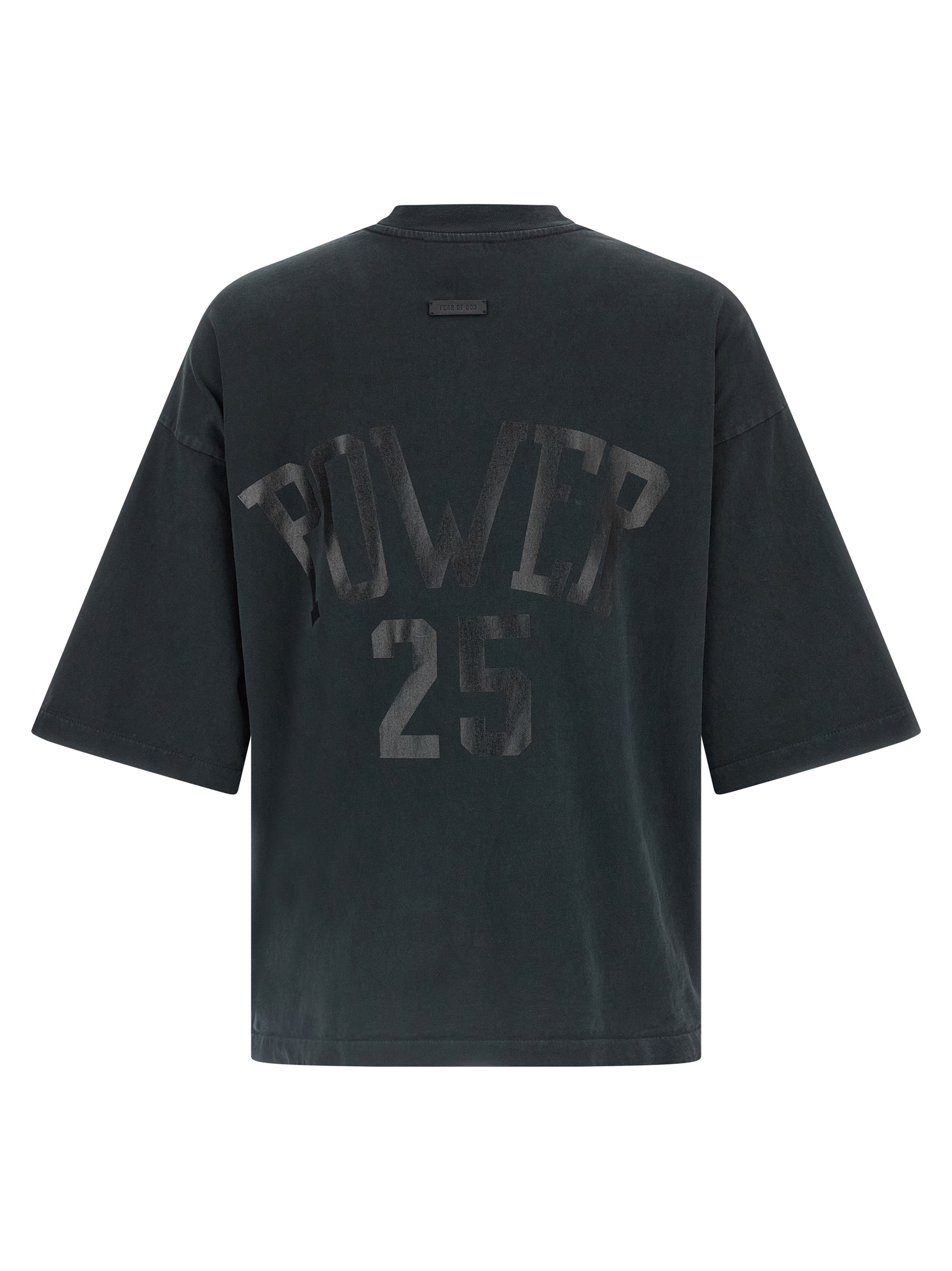 'Power 25' heavy cotton jersey t-shirt with vintage sunfade treatment, tone-on-tone flocked print on the front, back print, crew neck, 3/4 sleeves with dropped shoulders, leather logo patch at the back.he back.