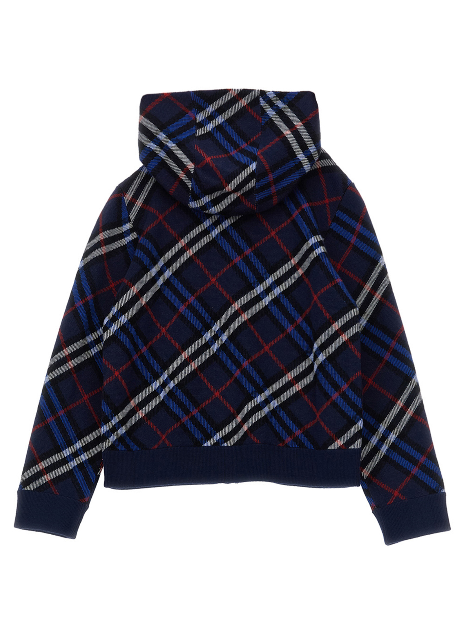 'Jimmy' cardigan in check knit wool jacquard, hood, front zip closure, side pockets, long cuffed sleeves.