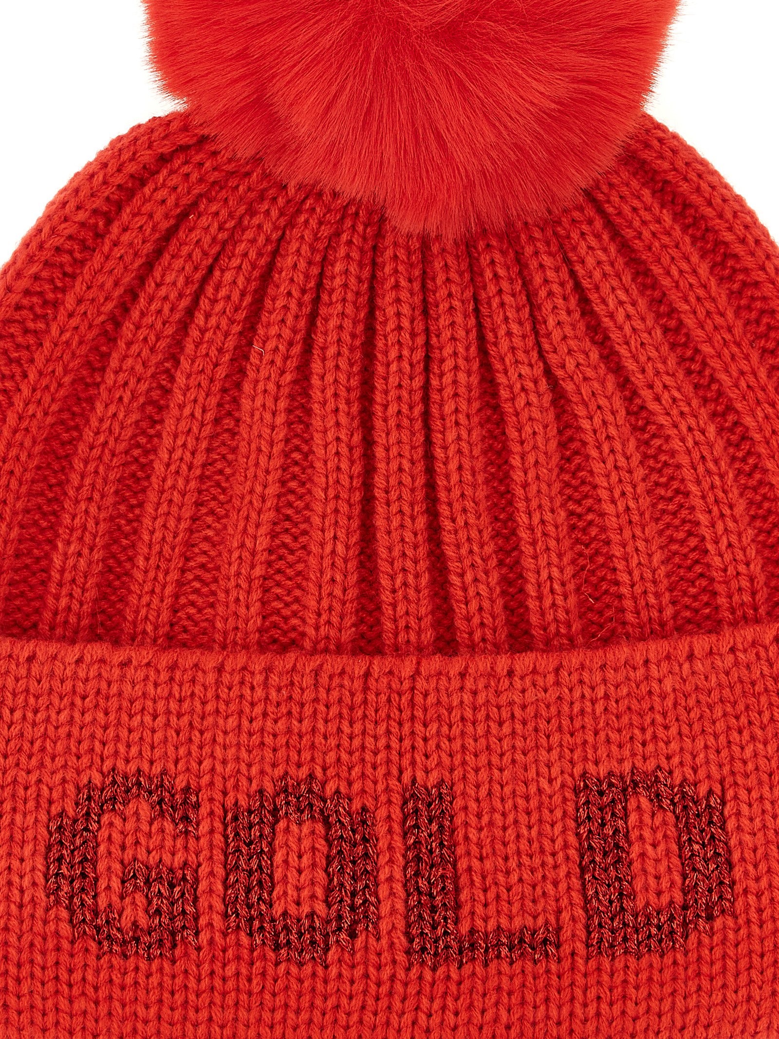 'Hodd' ribbed wool blend beanie, turn-up with tone-on-tone lamé thread jacquard logo, fur-effect fabric pompom, fleece inner band.