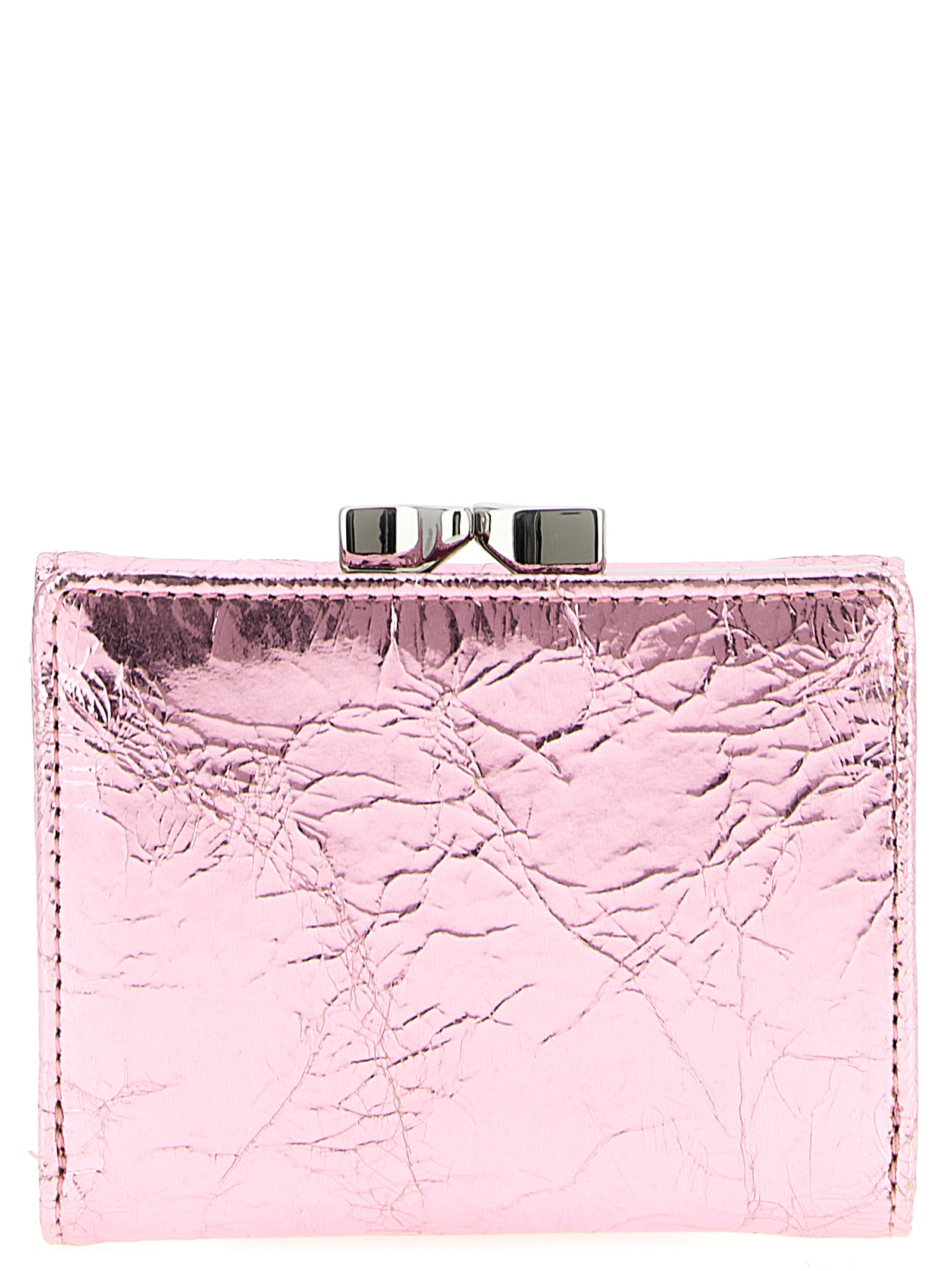 Small 'Frame' crinkle effect metallic leather wallet, flap closure with snap button and metal Orb logo on the front, pocket with metal snap closure on the back.