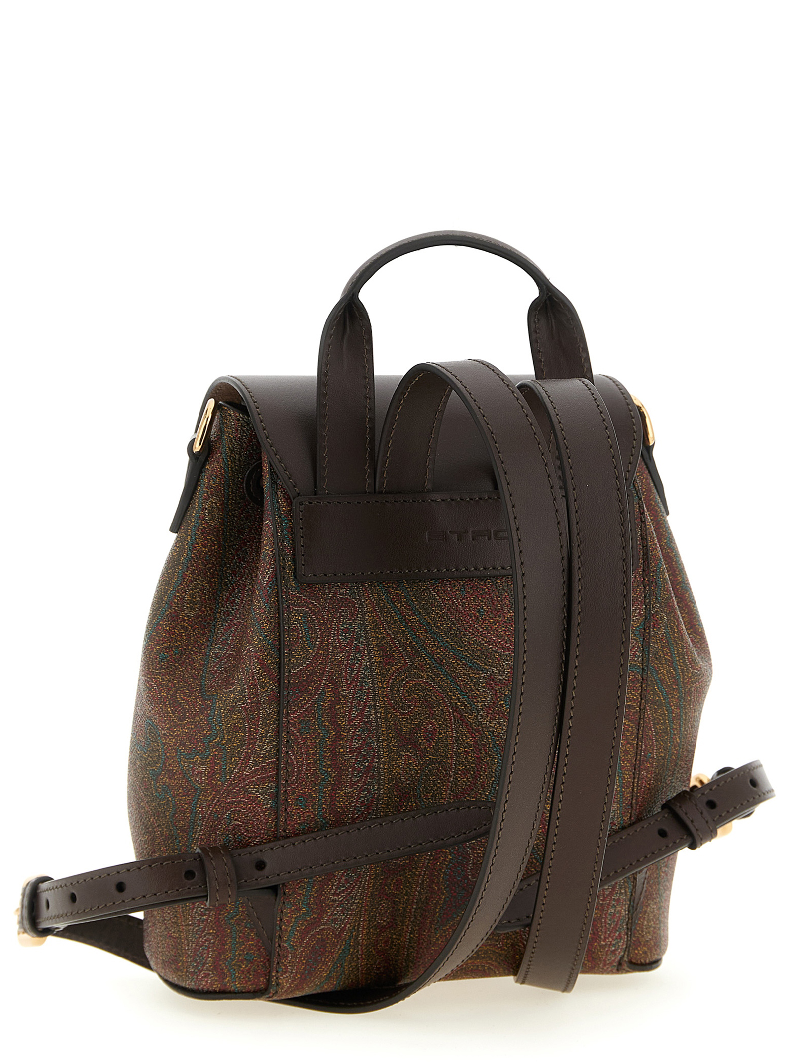 Small 'Etro Essential' backpack in 'Arnica' Paisley jacquard canvas and leather, magnetic flap closure with antiqued metal button with engraved logo, inner drawstring, fixed handle, adjustable shoulder straps.