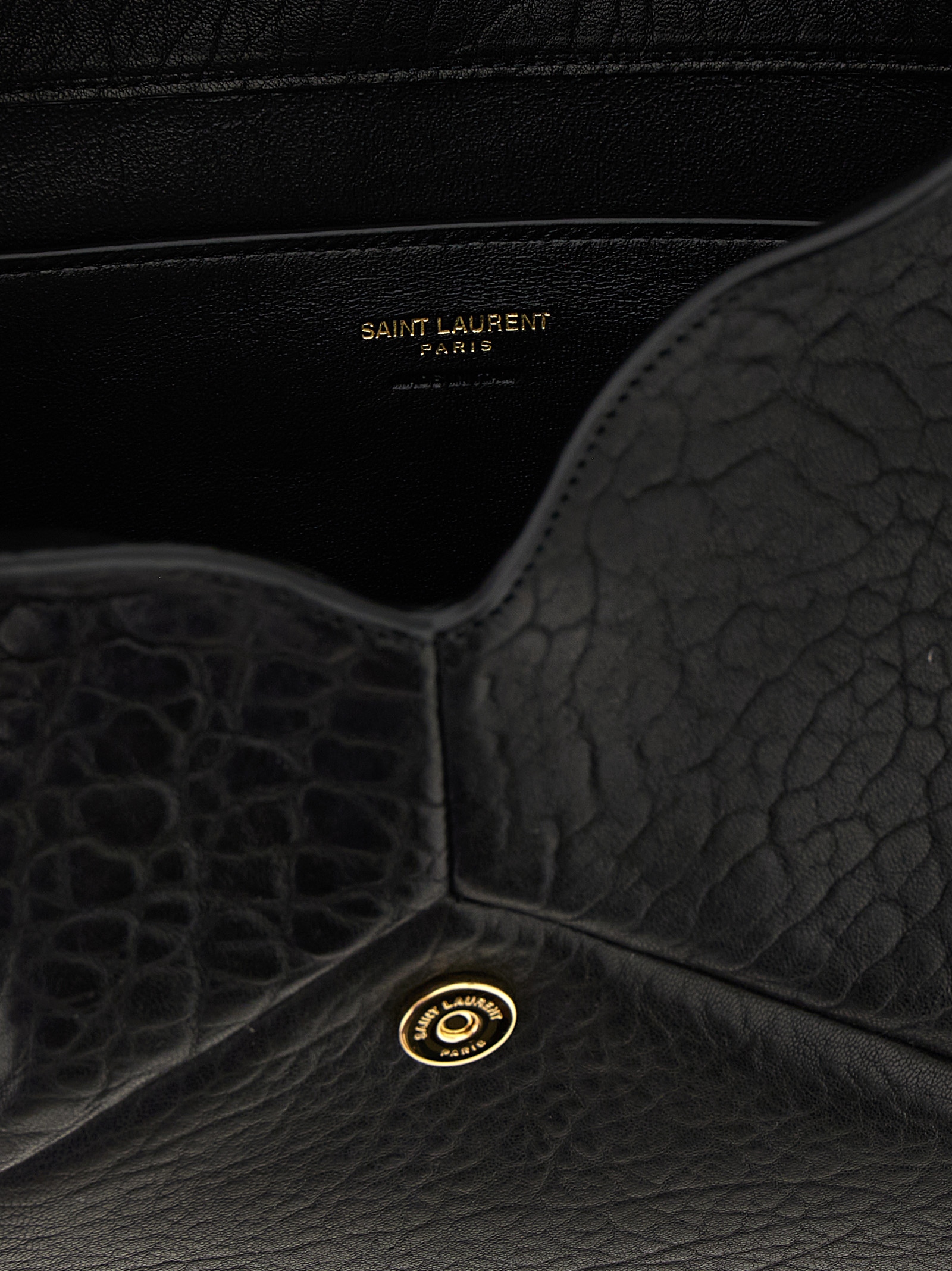 'Envelope' large lambskin clutch bag with magnetic flap closure with metal Cassandre logo applied on the front, origami structure.