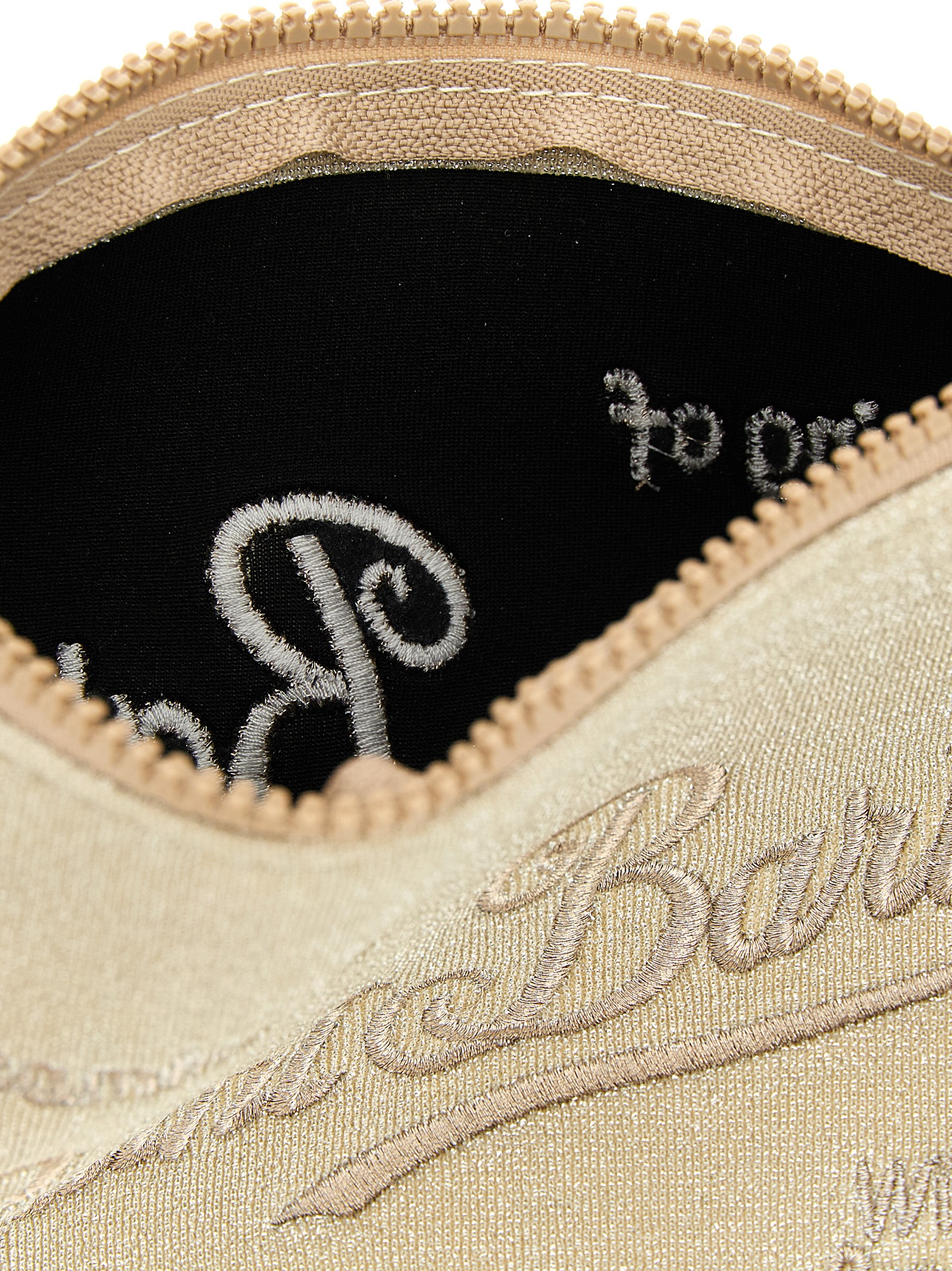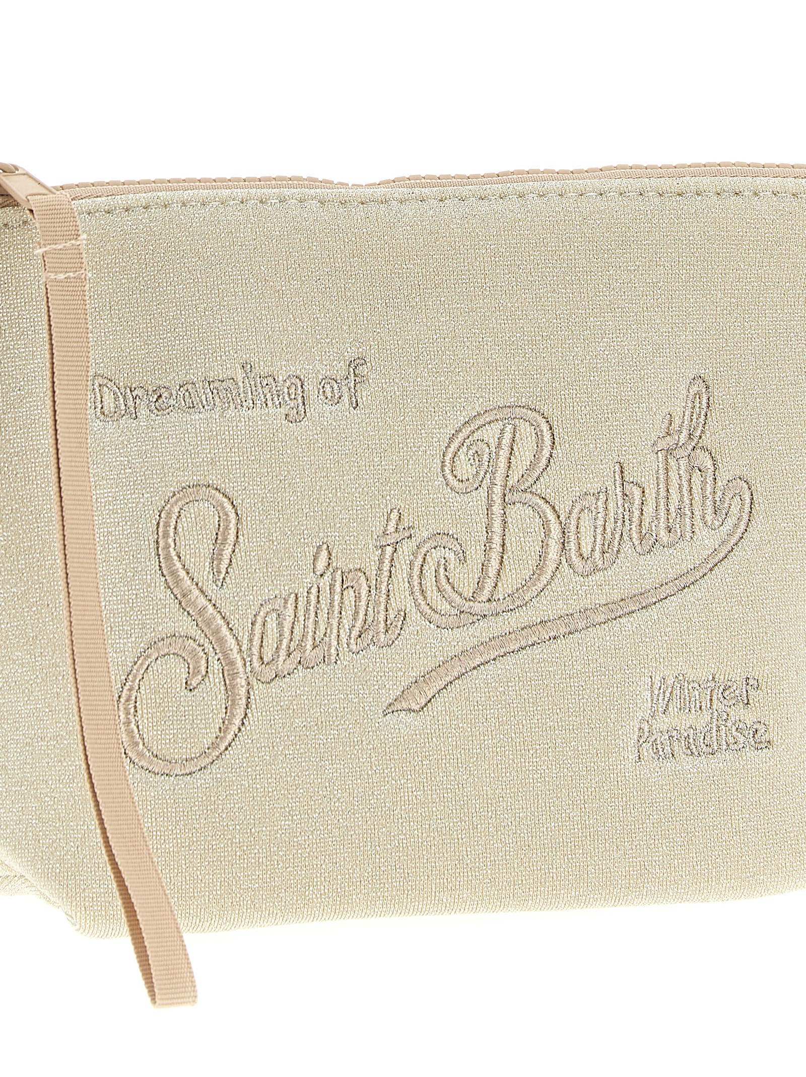 'Aline' lurex clutch bag with tone-on-tone embroidered logo on the front and back, top zip closure.