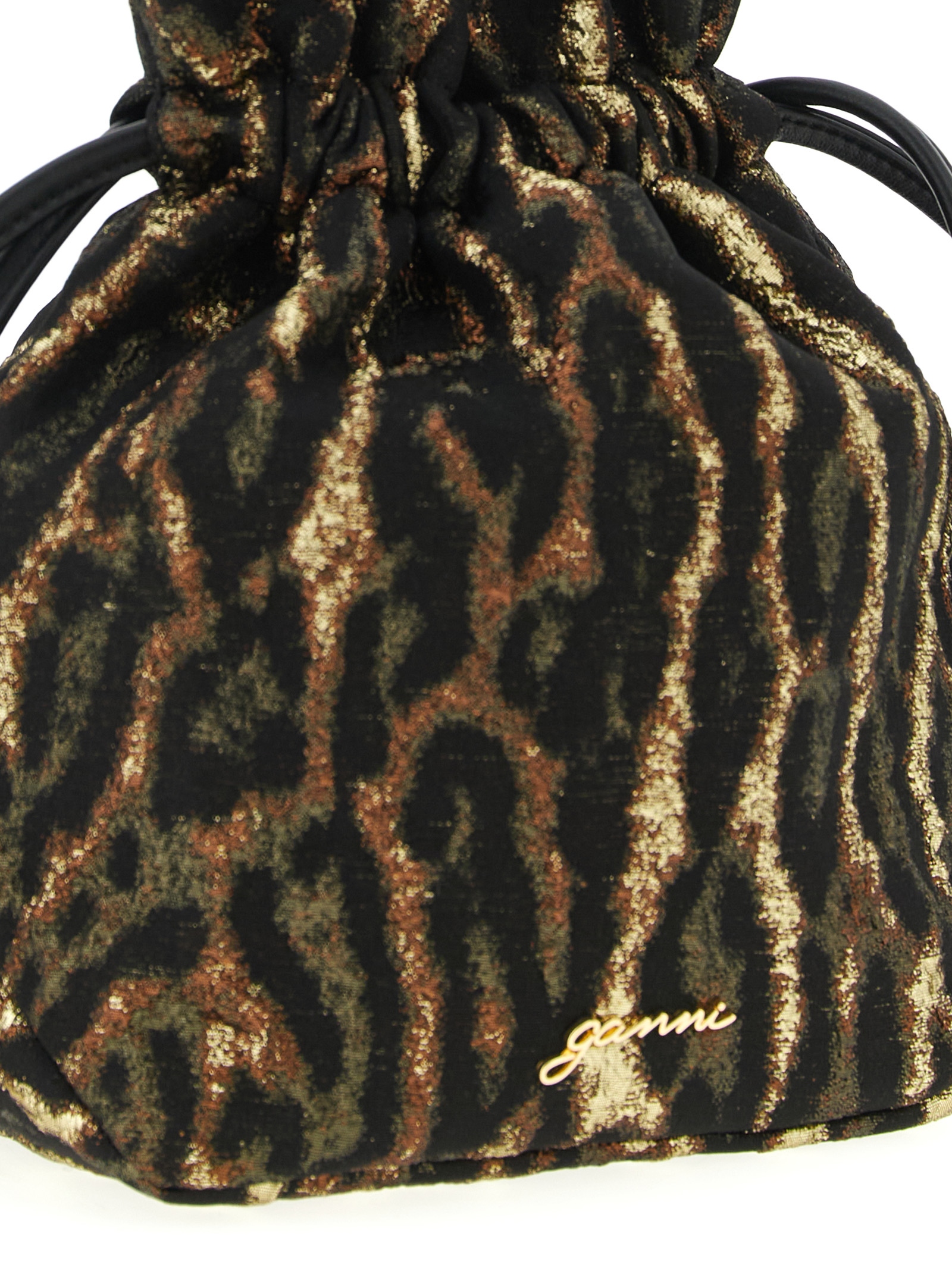 'Metallic Bou Bucket' pouch in jacquard with metallic effect animal print, drawstring closure and metal Ganni Butterfly logo details.