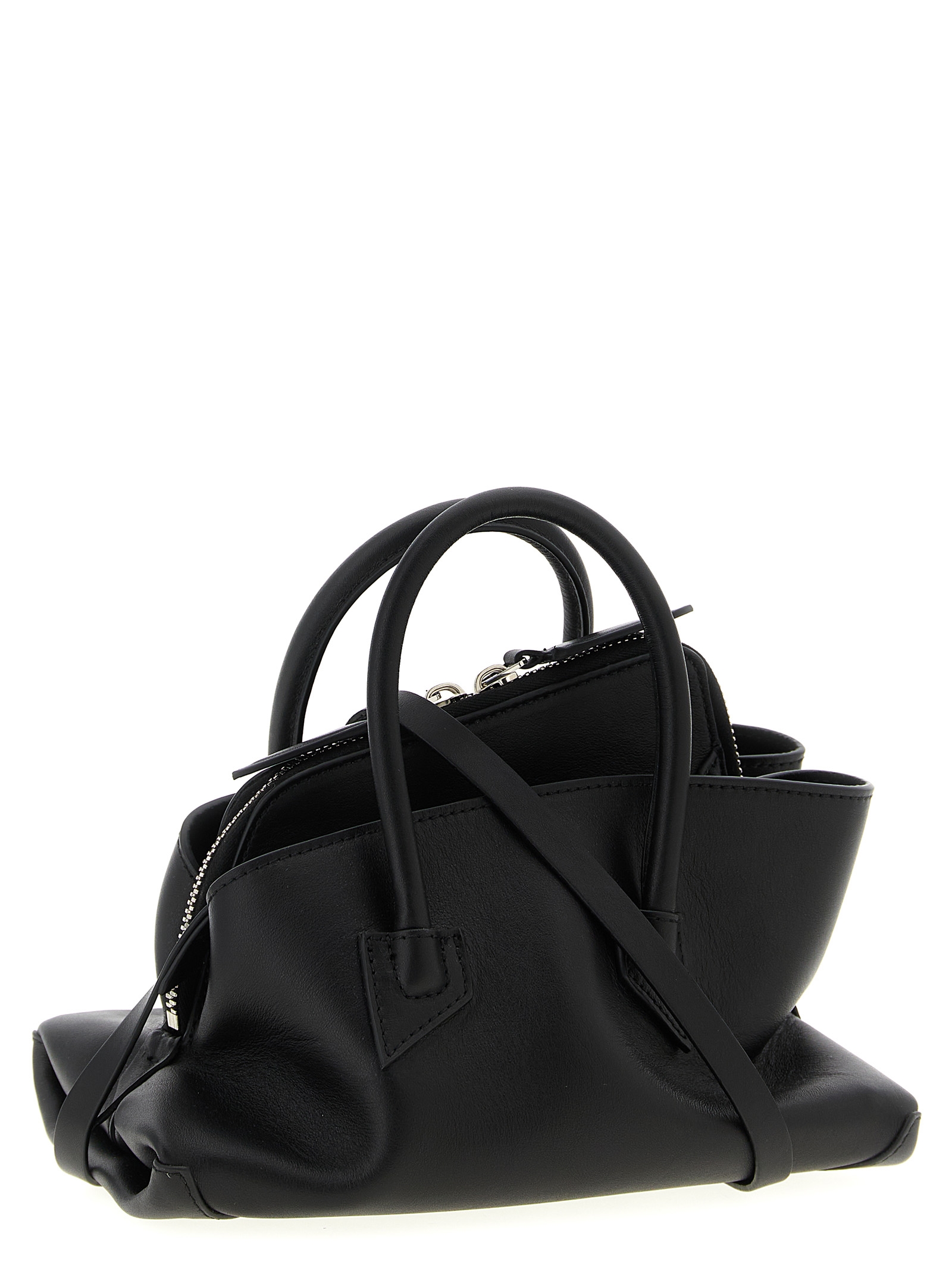 'La Passeggiata Mini' leather handbag with front embossed logo, double fixed handle, top zip closure, side pockets, rigid base with metal feet, removable shoulder strap.