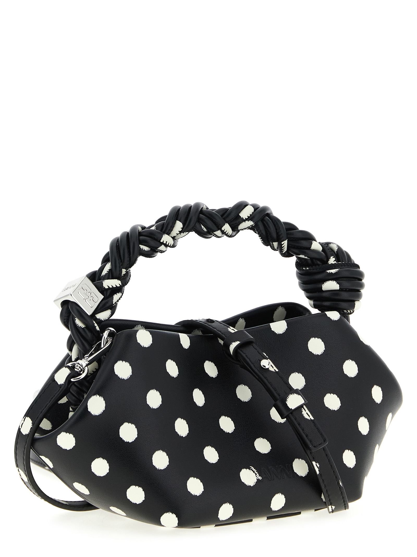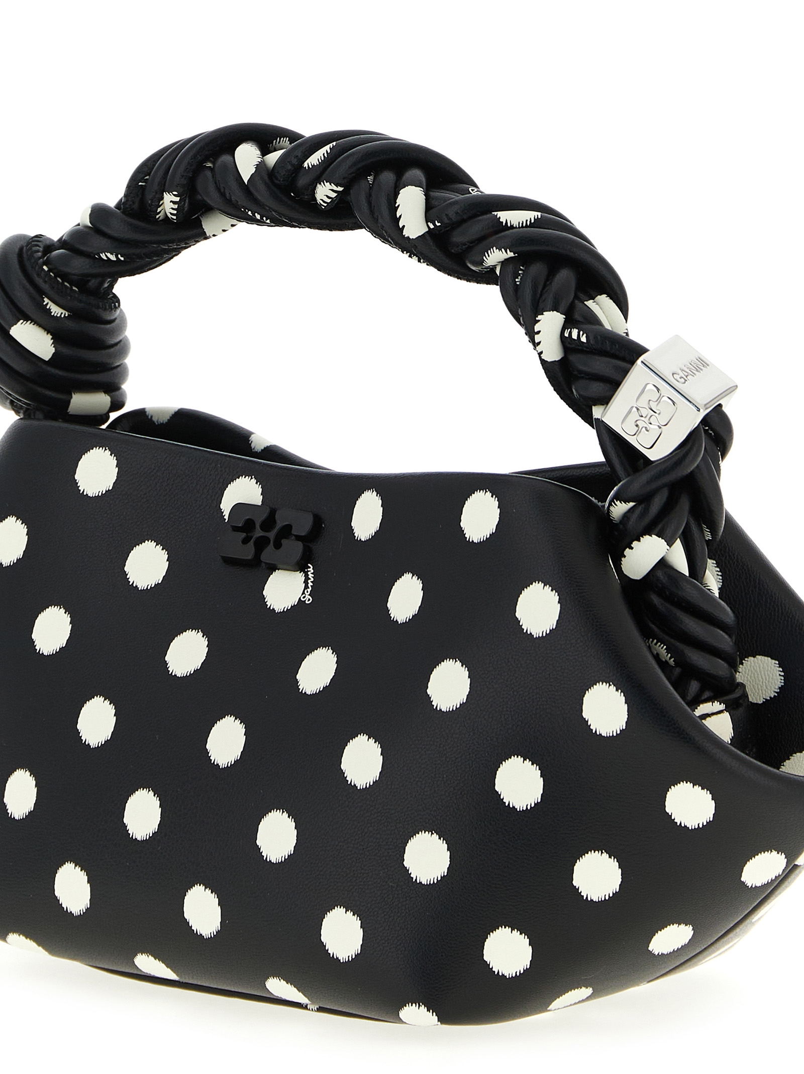 'Polka-Dot Bou' mini handbag in leather-effect fabric with all-over polka dot print, fixed woven handle with metal detail engraved Ganni Butterfly logo, adjustable and removable shoulder strap.
