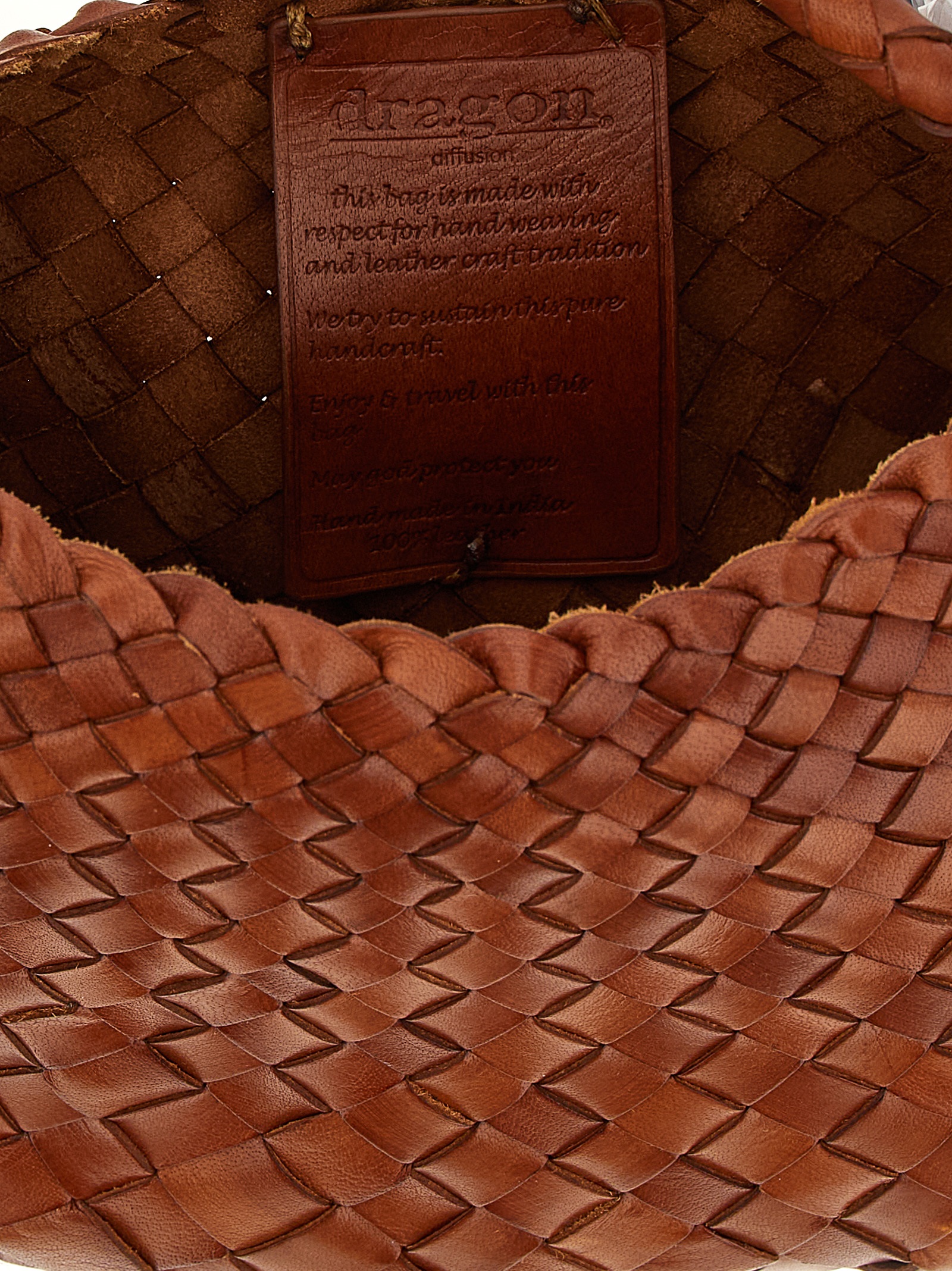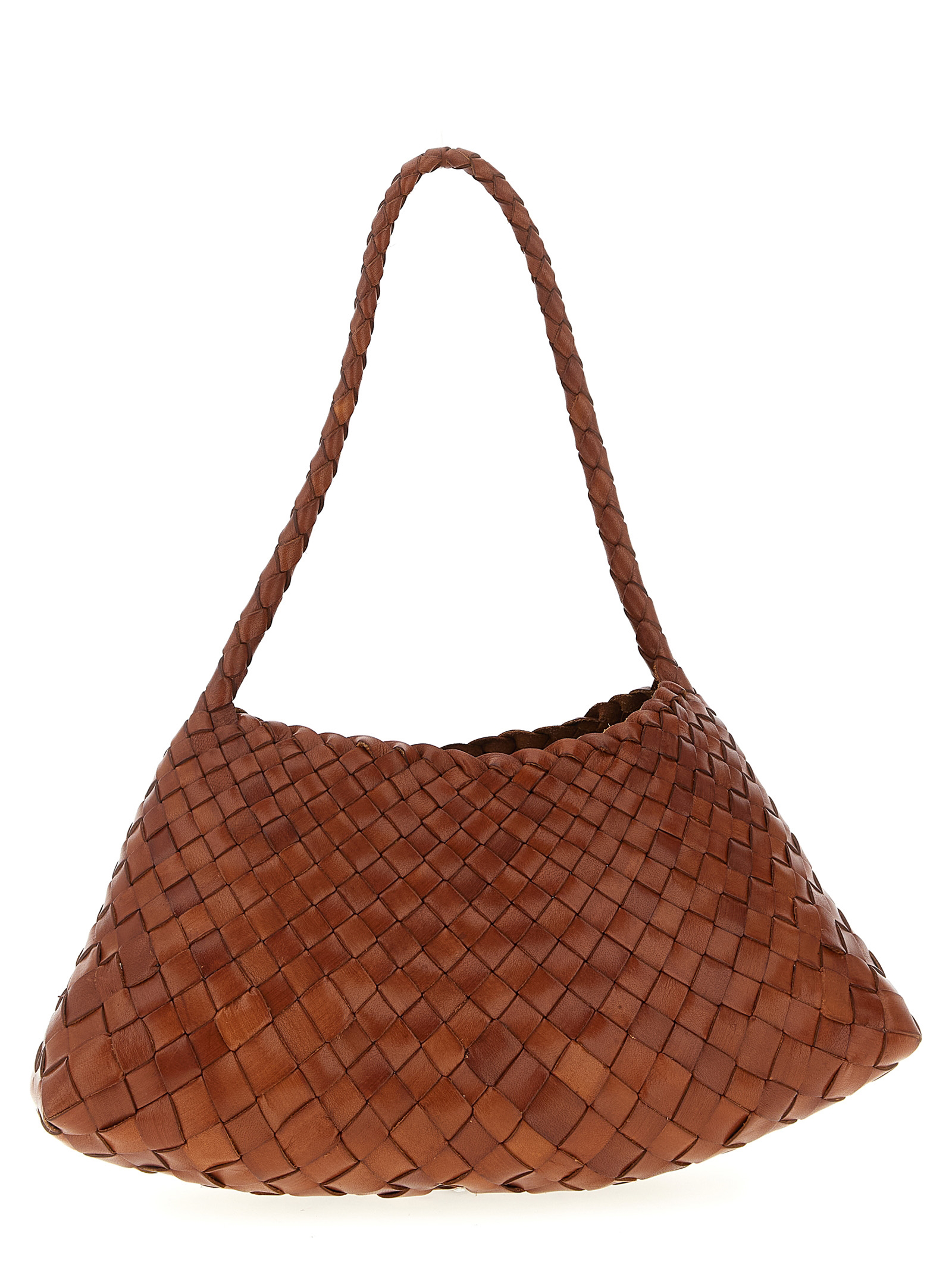 Hand-woven buffalo leather Rosanna shoulder bag characterized by irregular strips of leather that gently taper towards the hem, unlined, fixed handle.