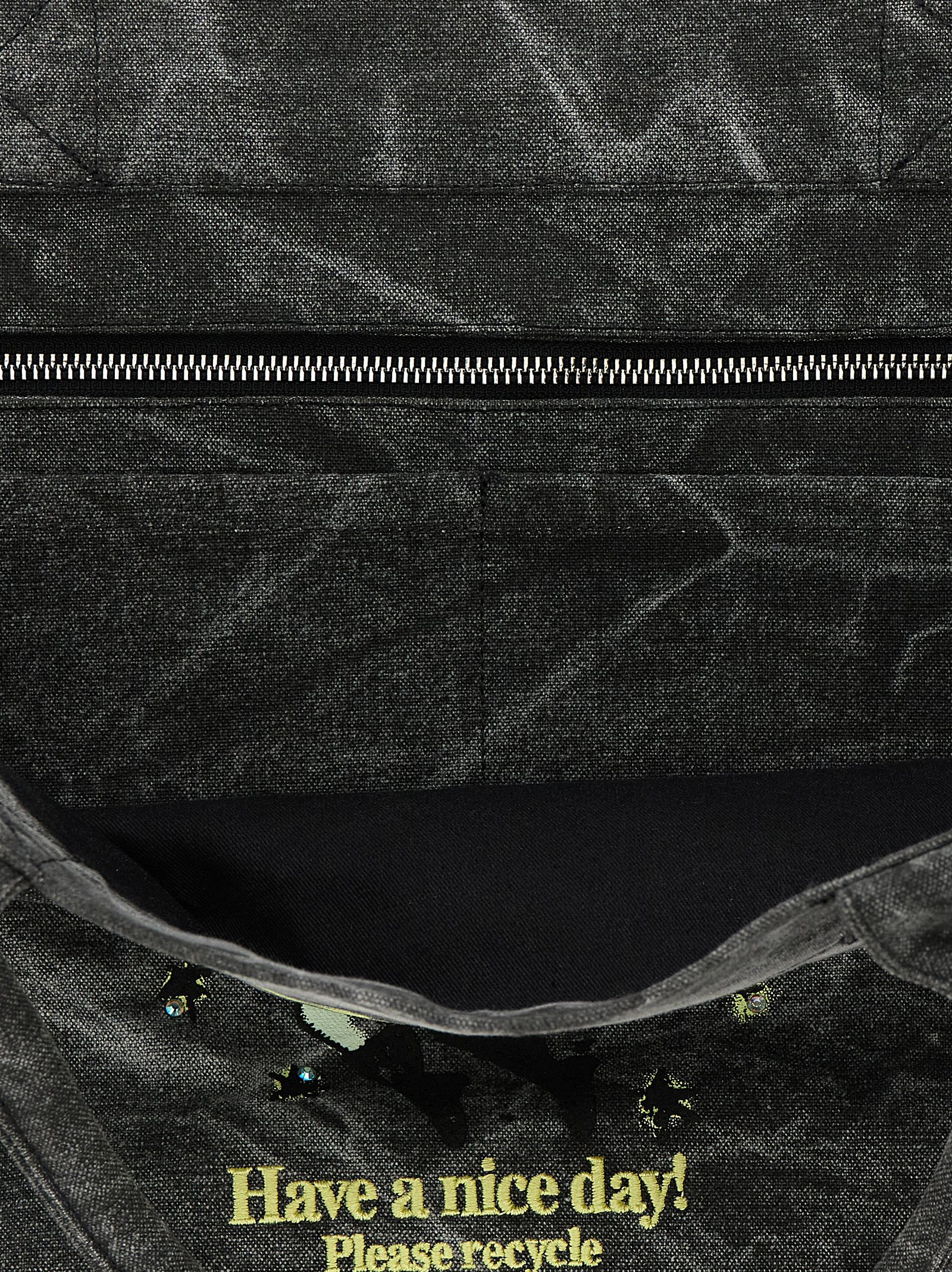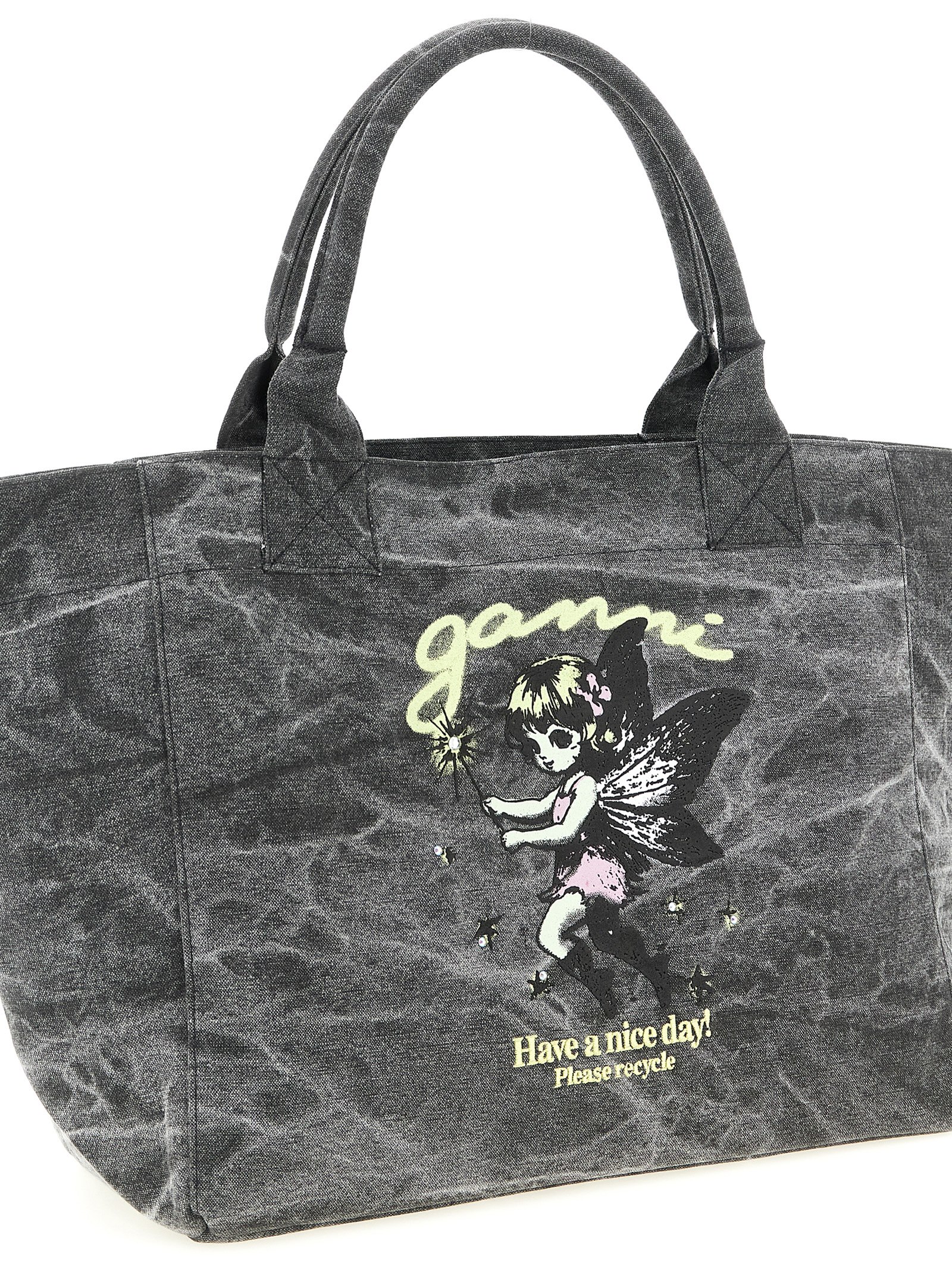 Medium shopping bag in stone-washed canvas, embroidery and front 'Fairy' print with crystal application, double fixed handle, and inside pocket.