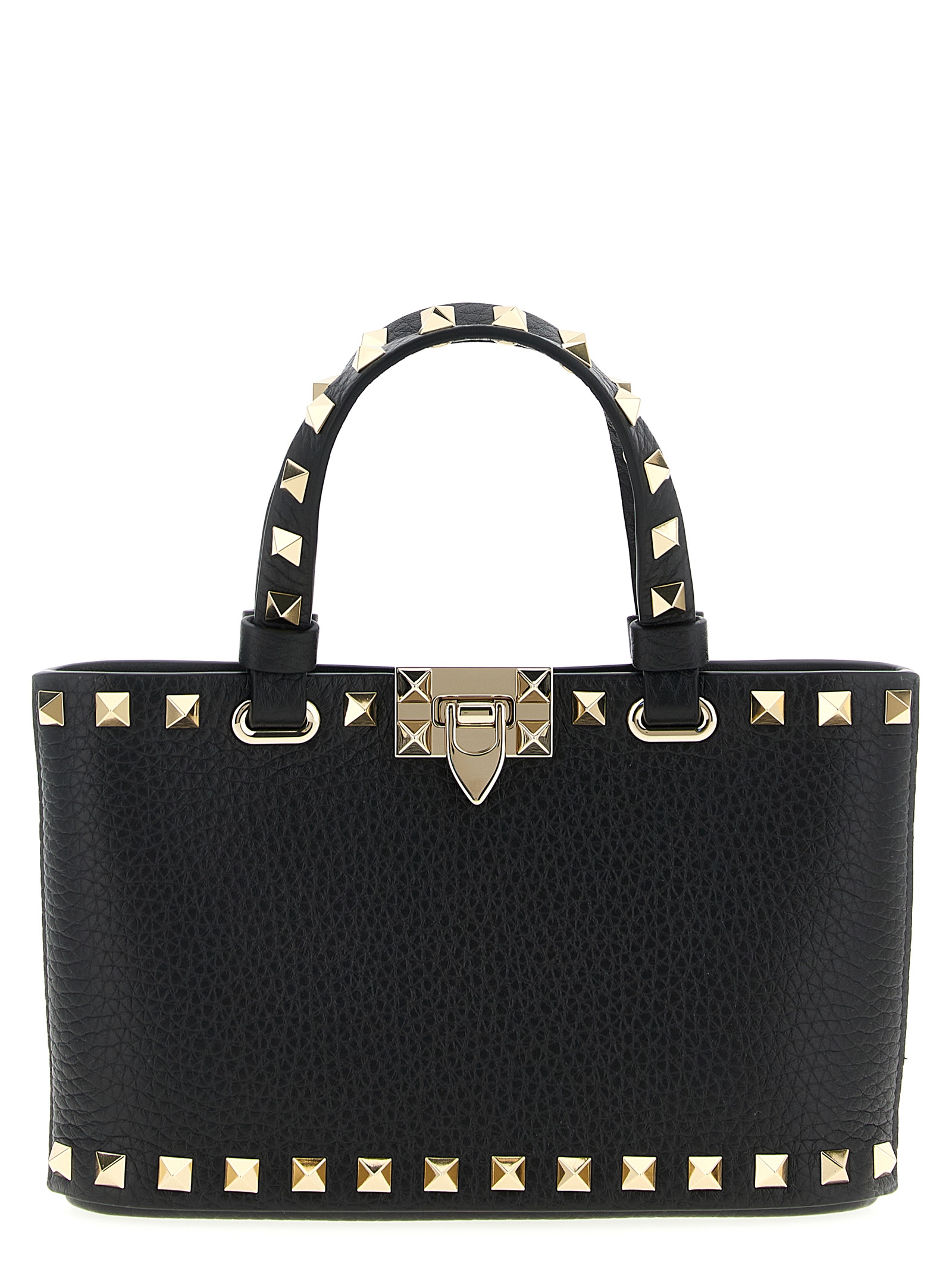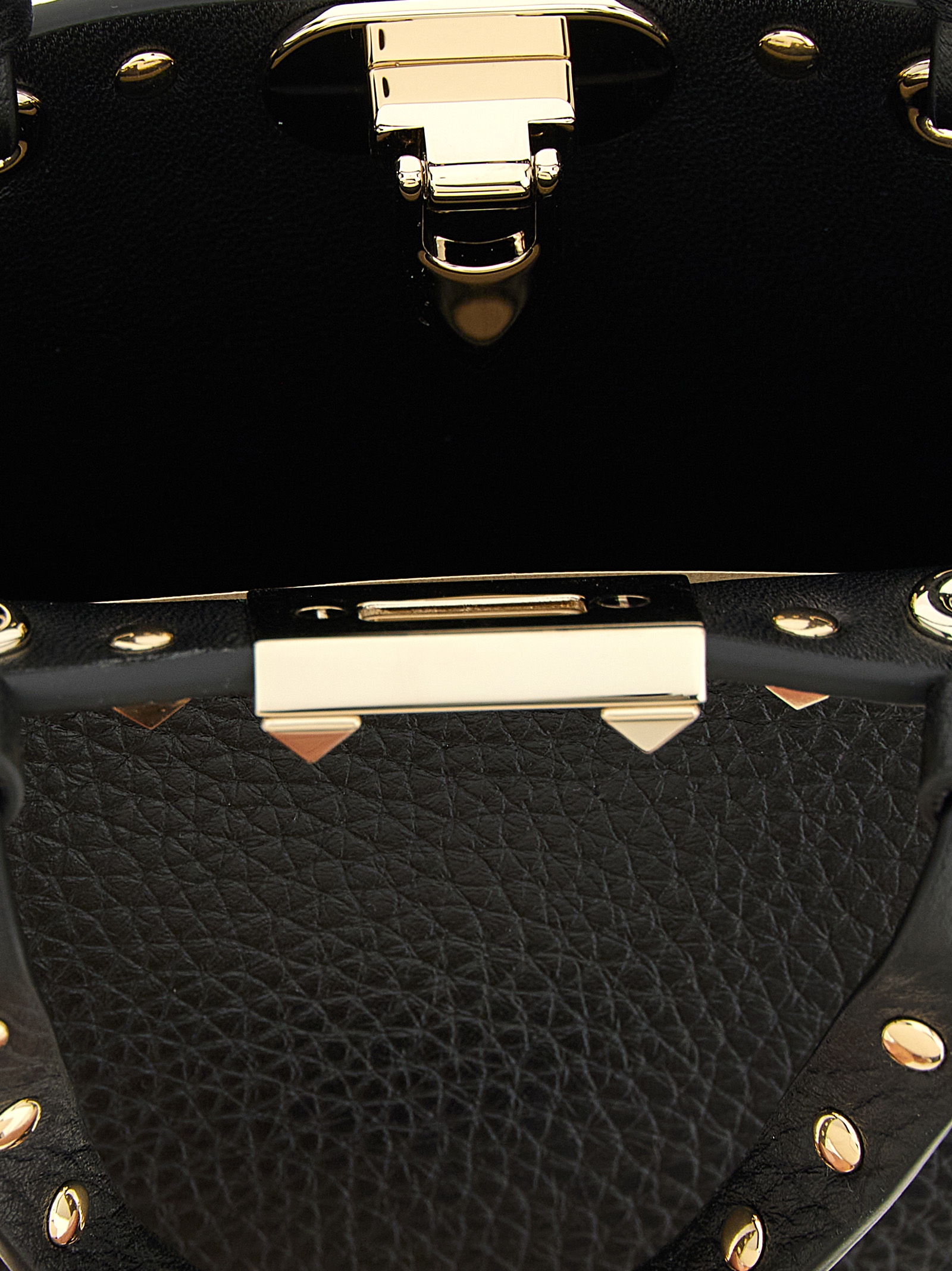 'Rockstud' mini shopping bag in garnet calf leather with platinum-finish metal stud applications, double fixed handle, hook closure, nappa lining, removable chain shoulder strap.