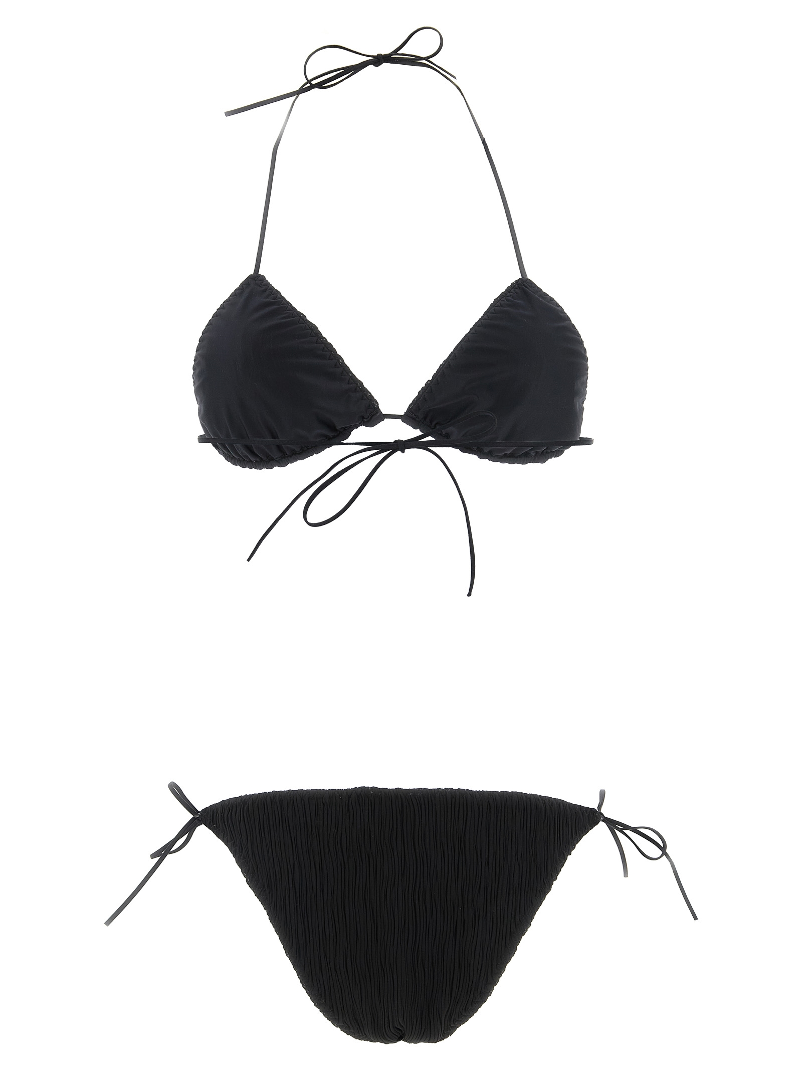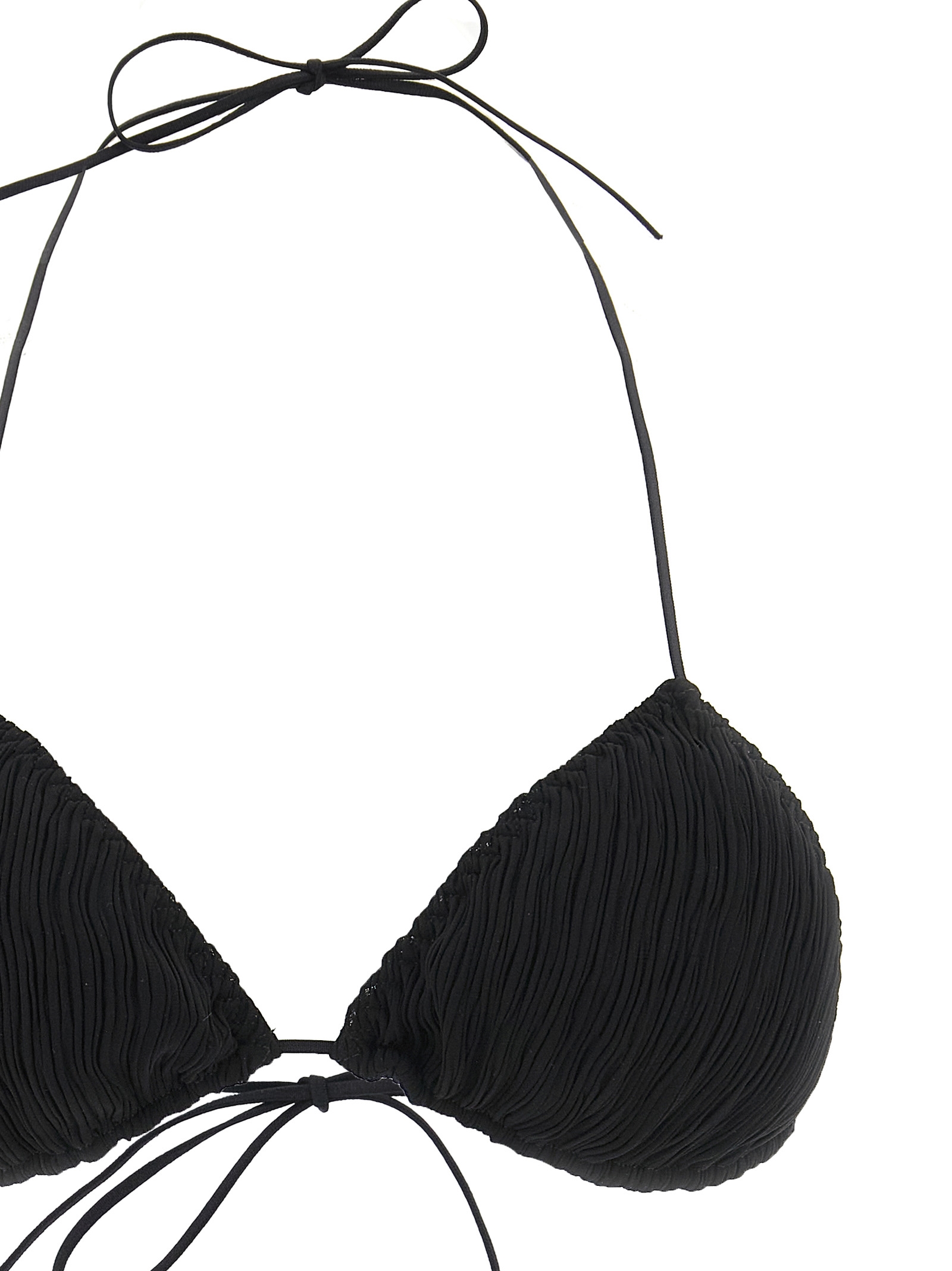 'Triangle Plisse' micro pleated lycra bikini, triangle top with lacing at the back, low-waisted bottoms with medium coverage.