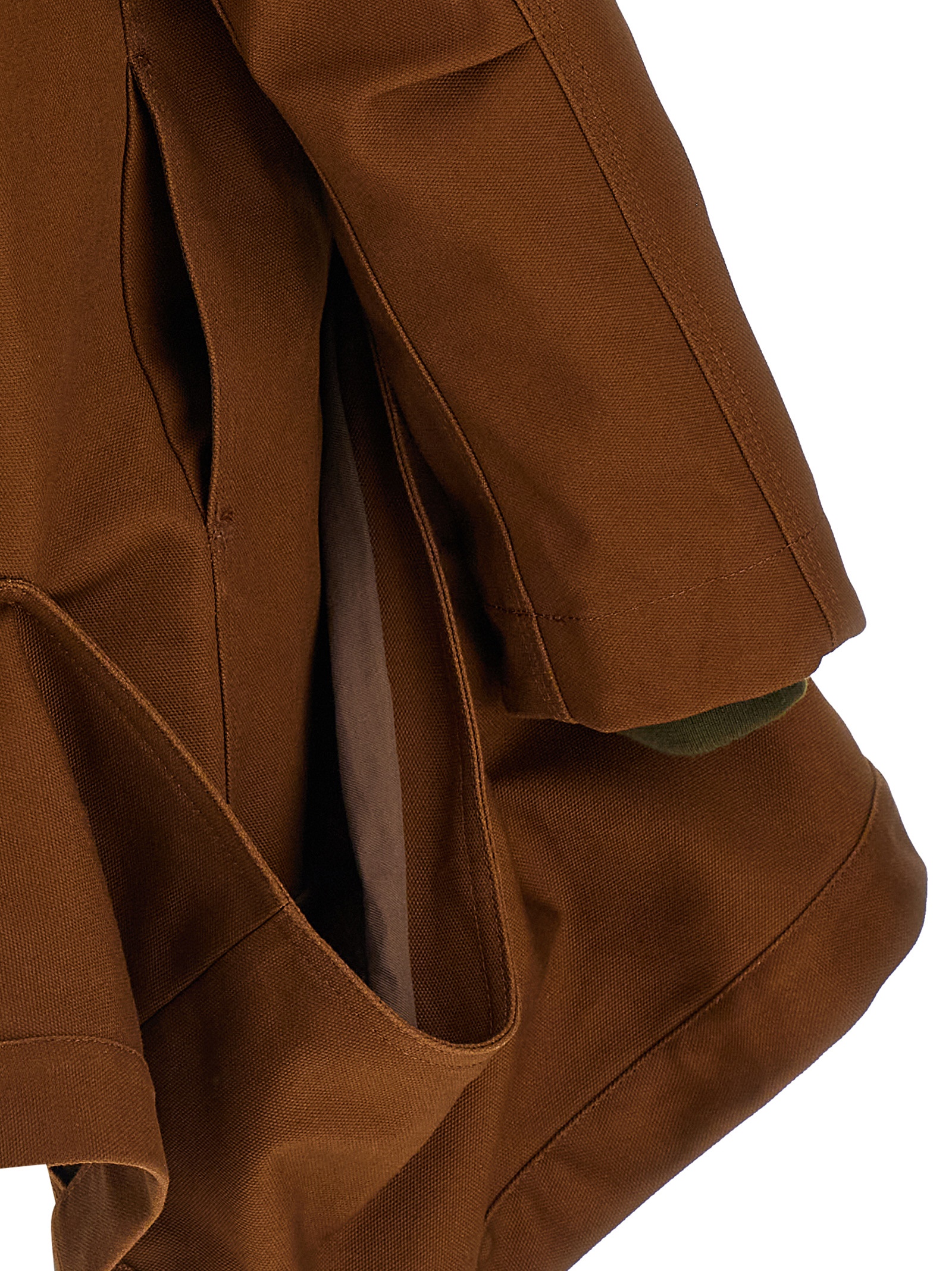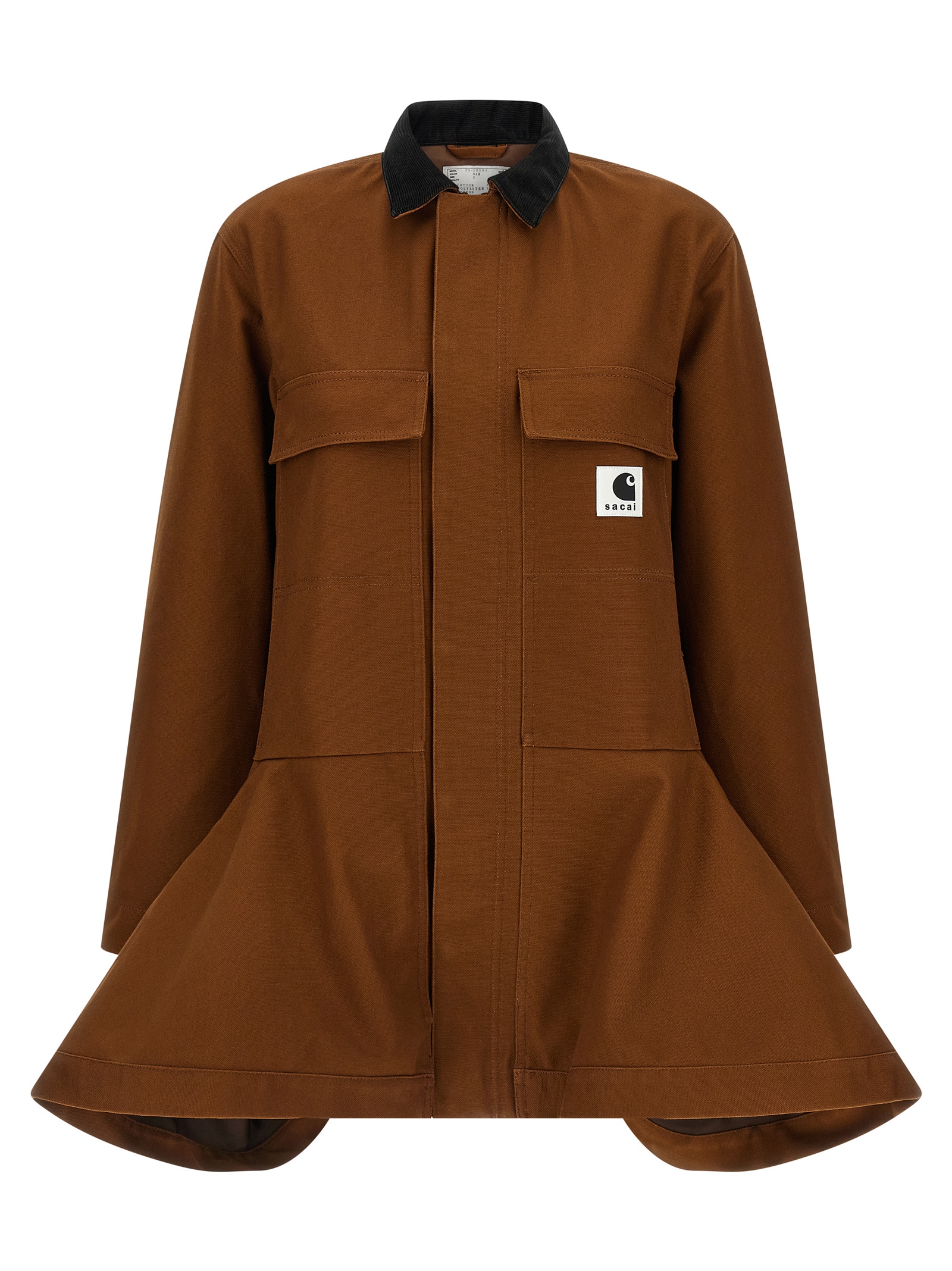 Sacai x Carhartt Wip capsule jacket in heavy cotton canvas with corduroy shirt collar, logo patch and front zip and snap button closure, pockets, long sleeves with contrasting knitted cuffs, peplum on the hem.