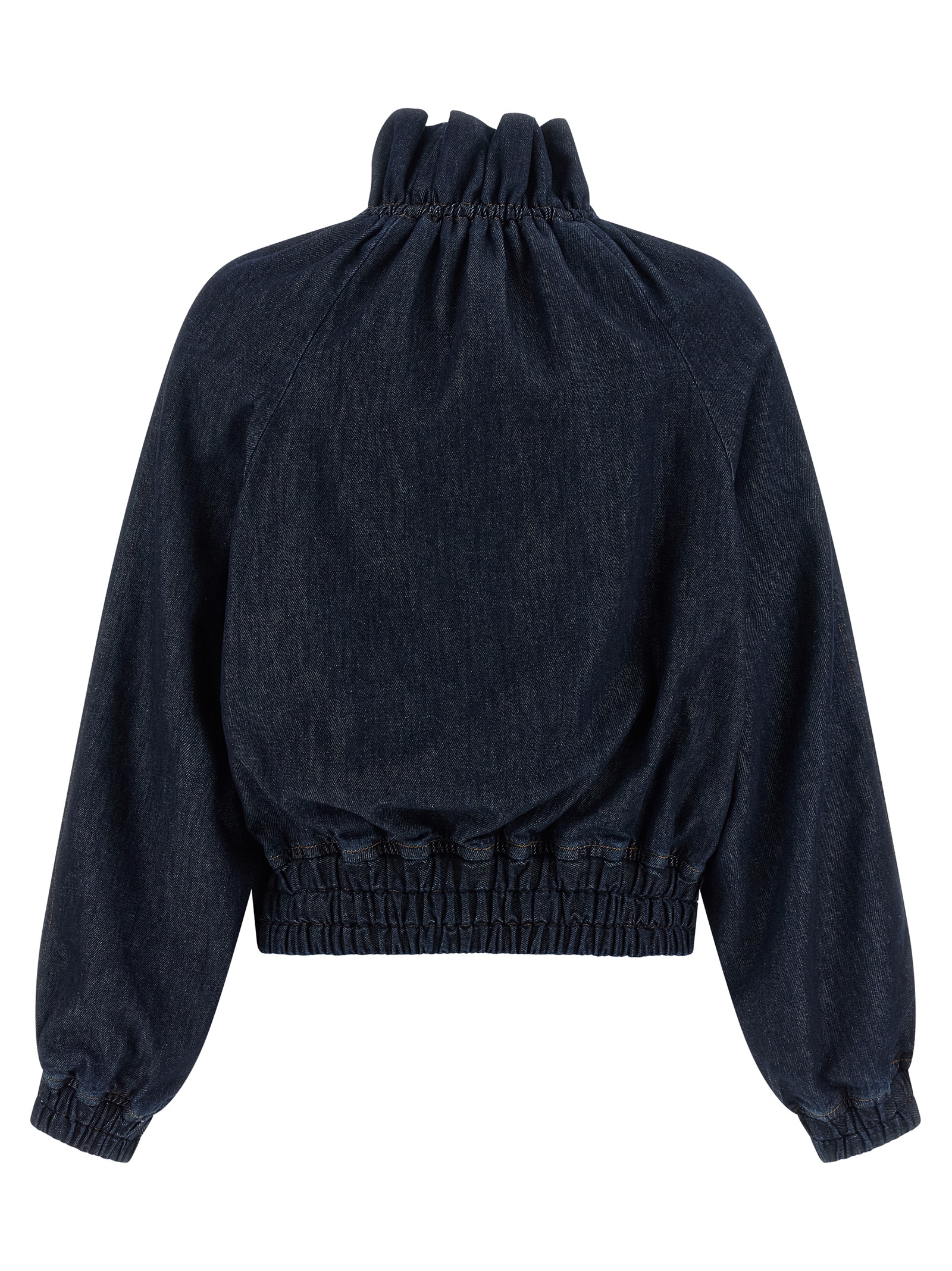 'Voly' cotton denim jacket with contrast stitching, curled neckline with adjustable drawstring, front zip closure, elastic hem, pockets, long sleeves with elastic cuffs.