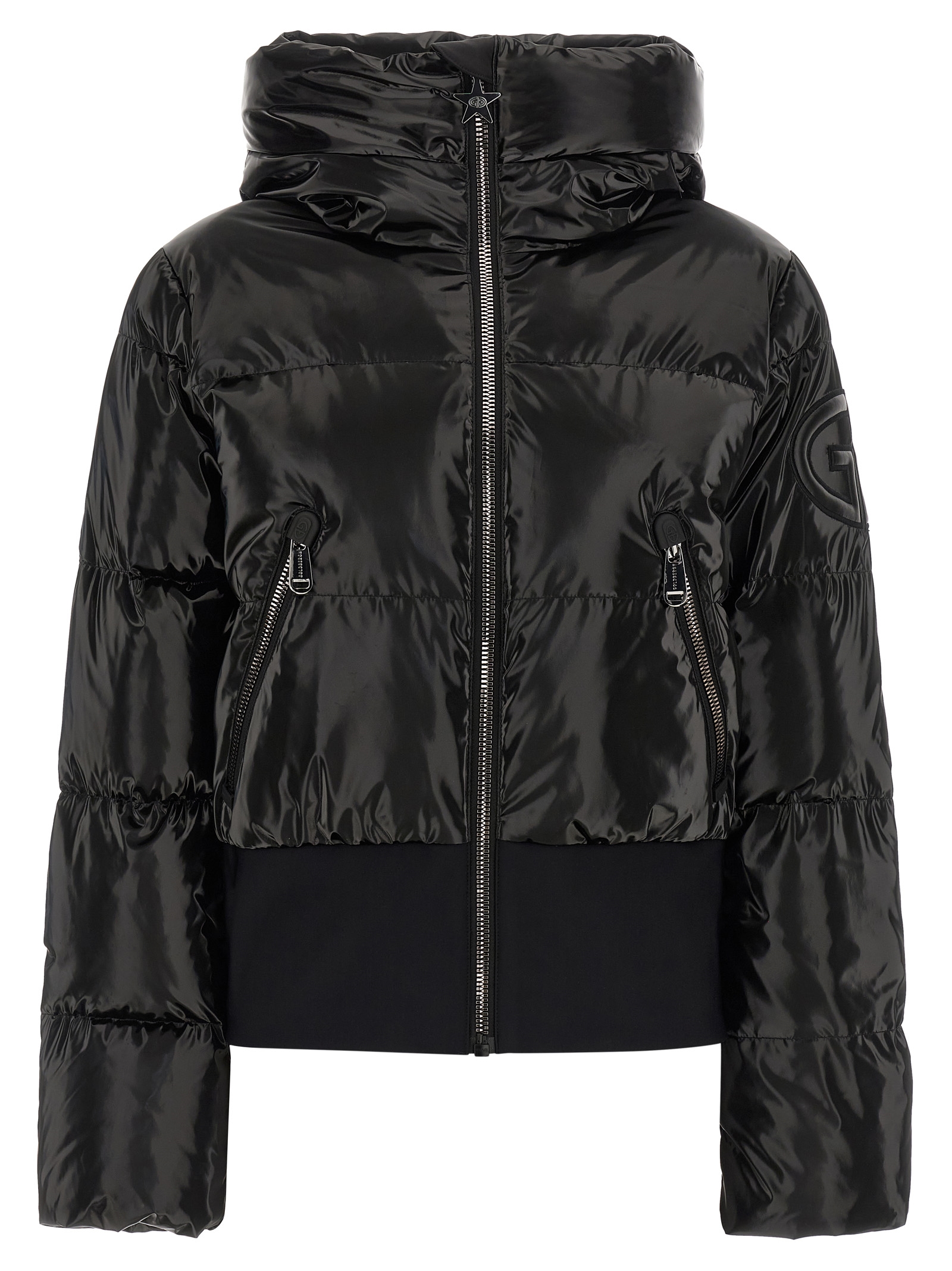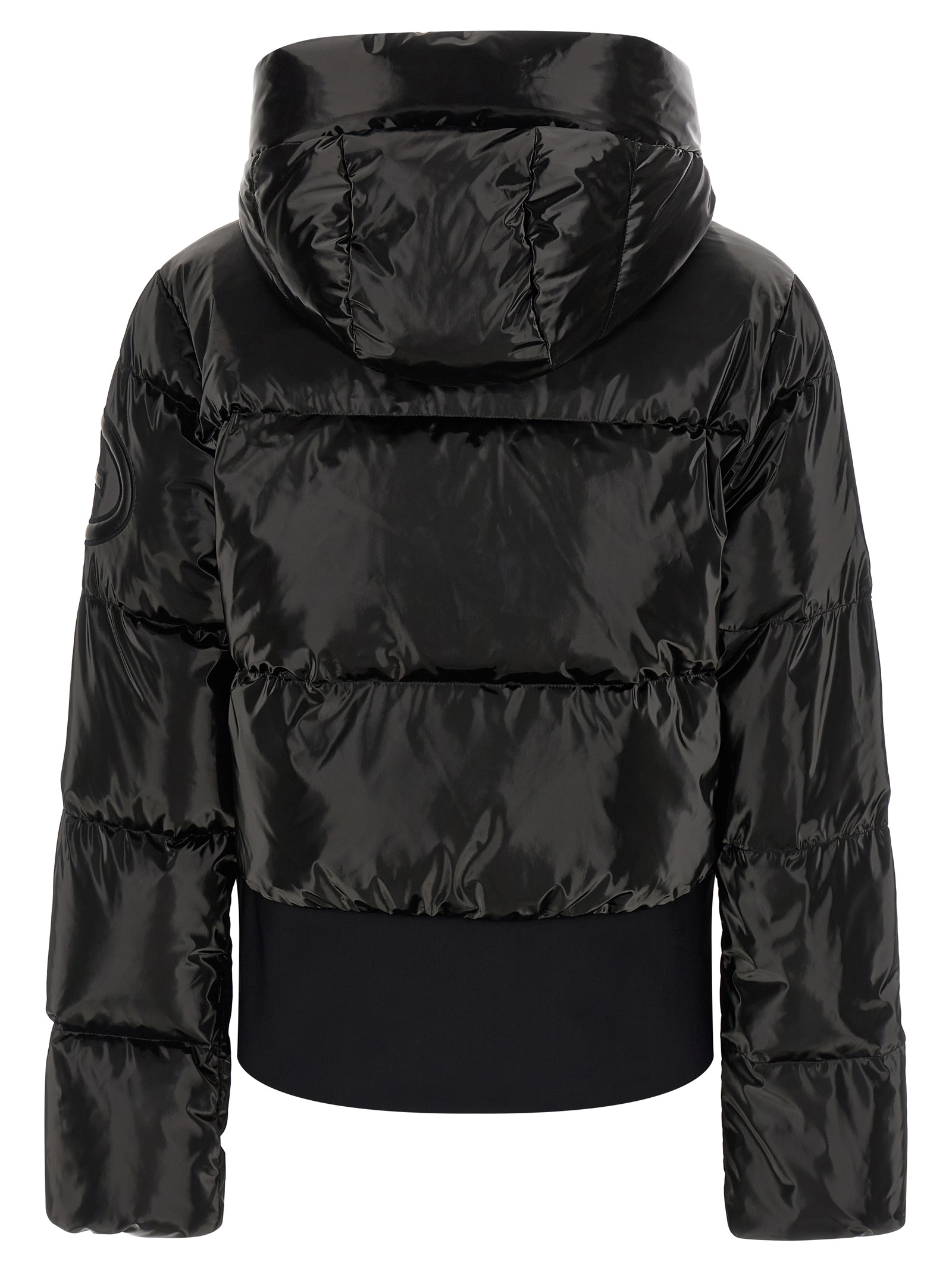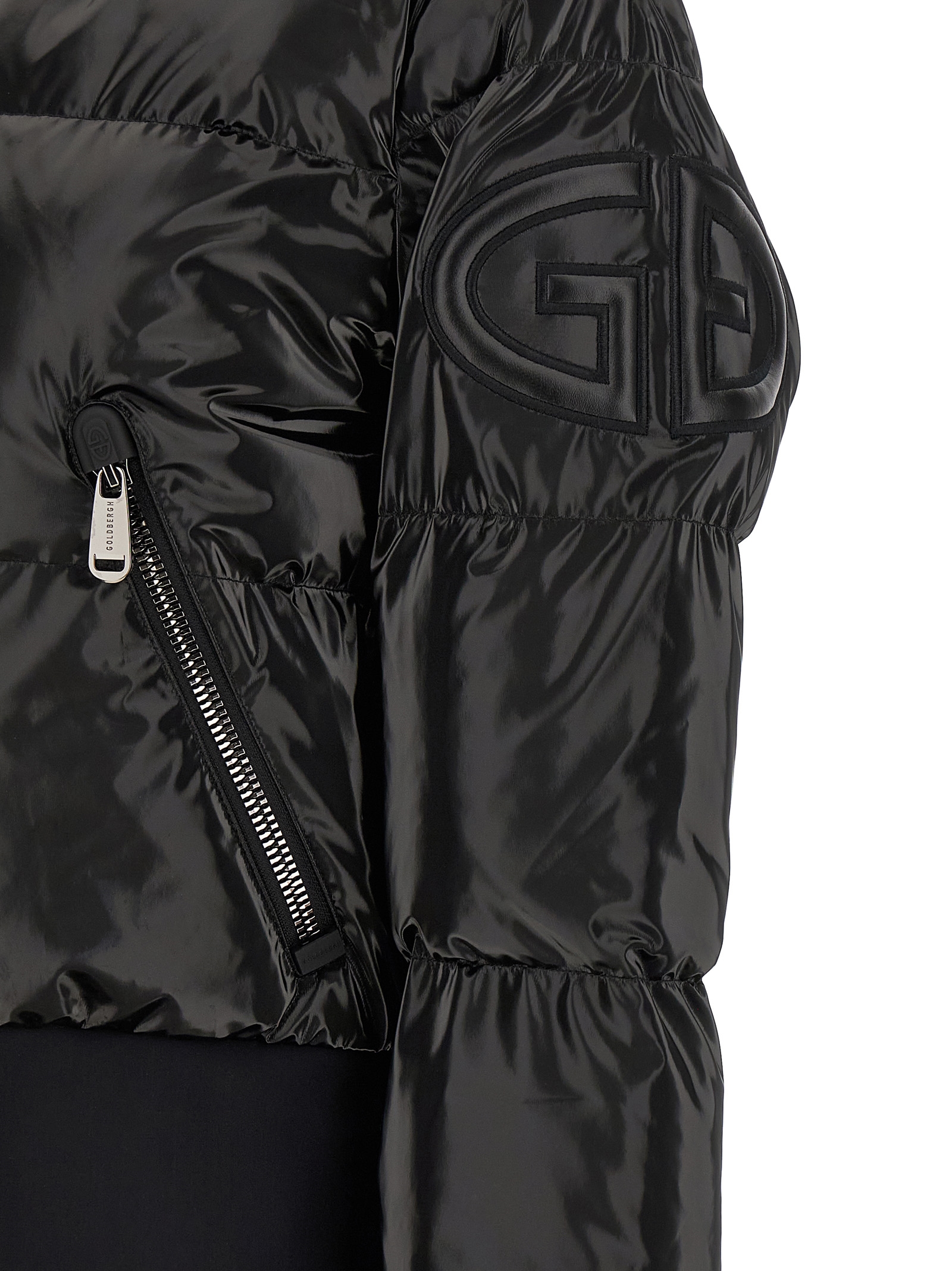 'Bombardino' ski jacket in water-repellent, breathable, quilted and goose feather padded technical fabric, hood, high neck, front zip closure, pockets, long sleeves with windproof gaiter and leather logo embroidery, Softshell band on the garment bottom.