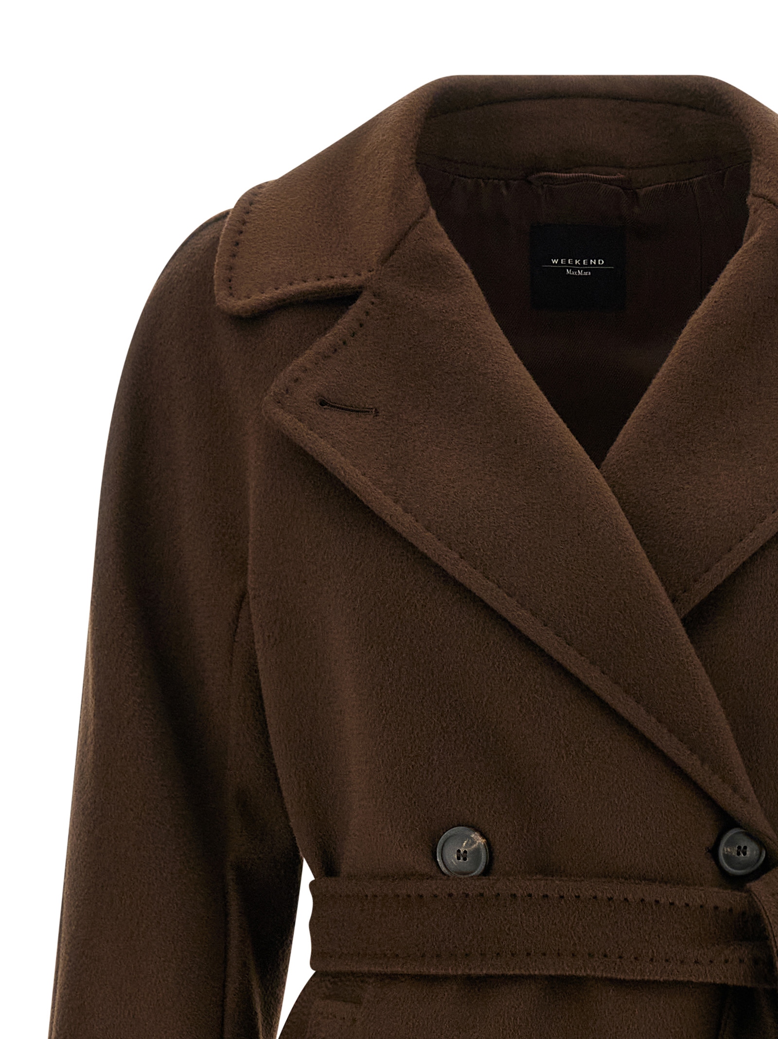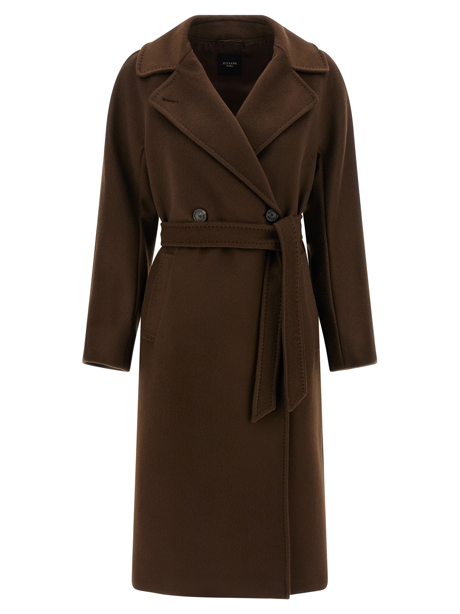 'Resina' double-breasted V-neck wool coat with wide lapels, button closure, side pockets, back central split, knotted belt at the waist, long and wide sleeves,
