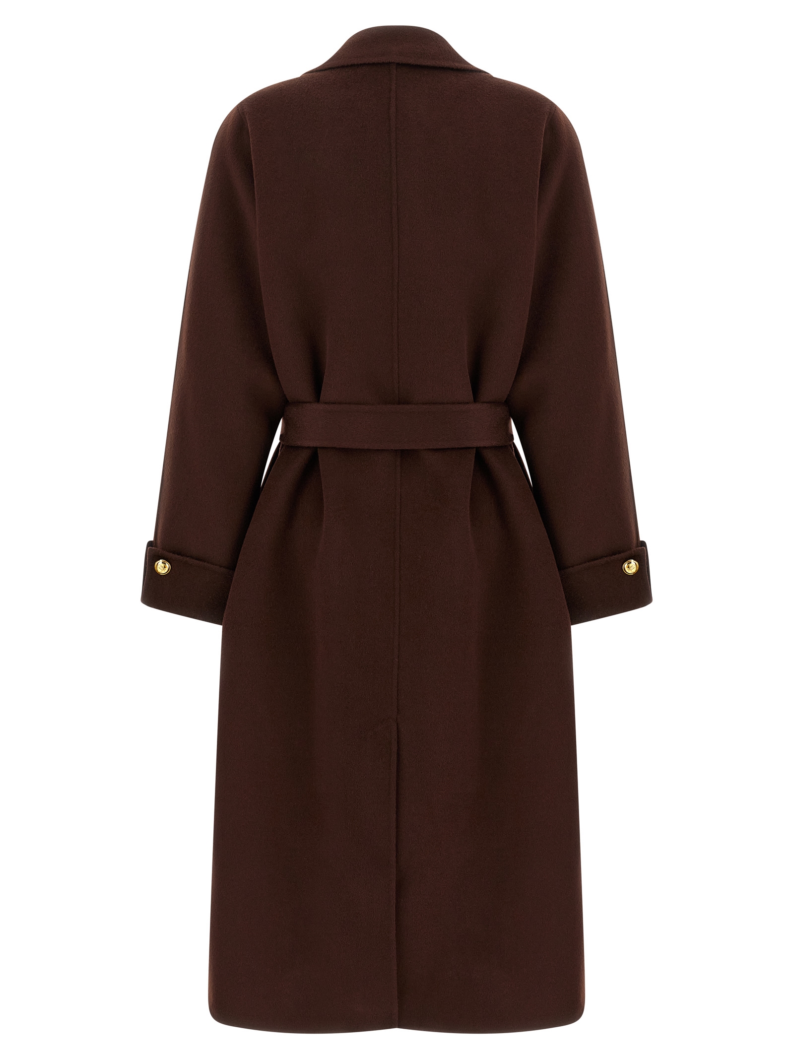 Double wool blend cloth coat, unlined, front metal lettering logo, dressing gown style, lapel collar, pockets, long sleeves with turned-up cuffs and dropped shoulders, back split, removable belt.