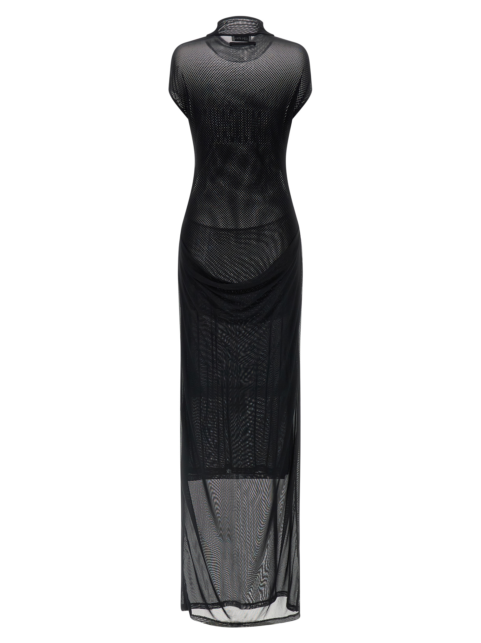 Long sleeveless dress in semi-transparent stretch mesh with flocked pattern, front logo.