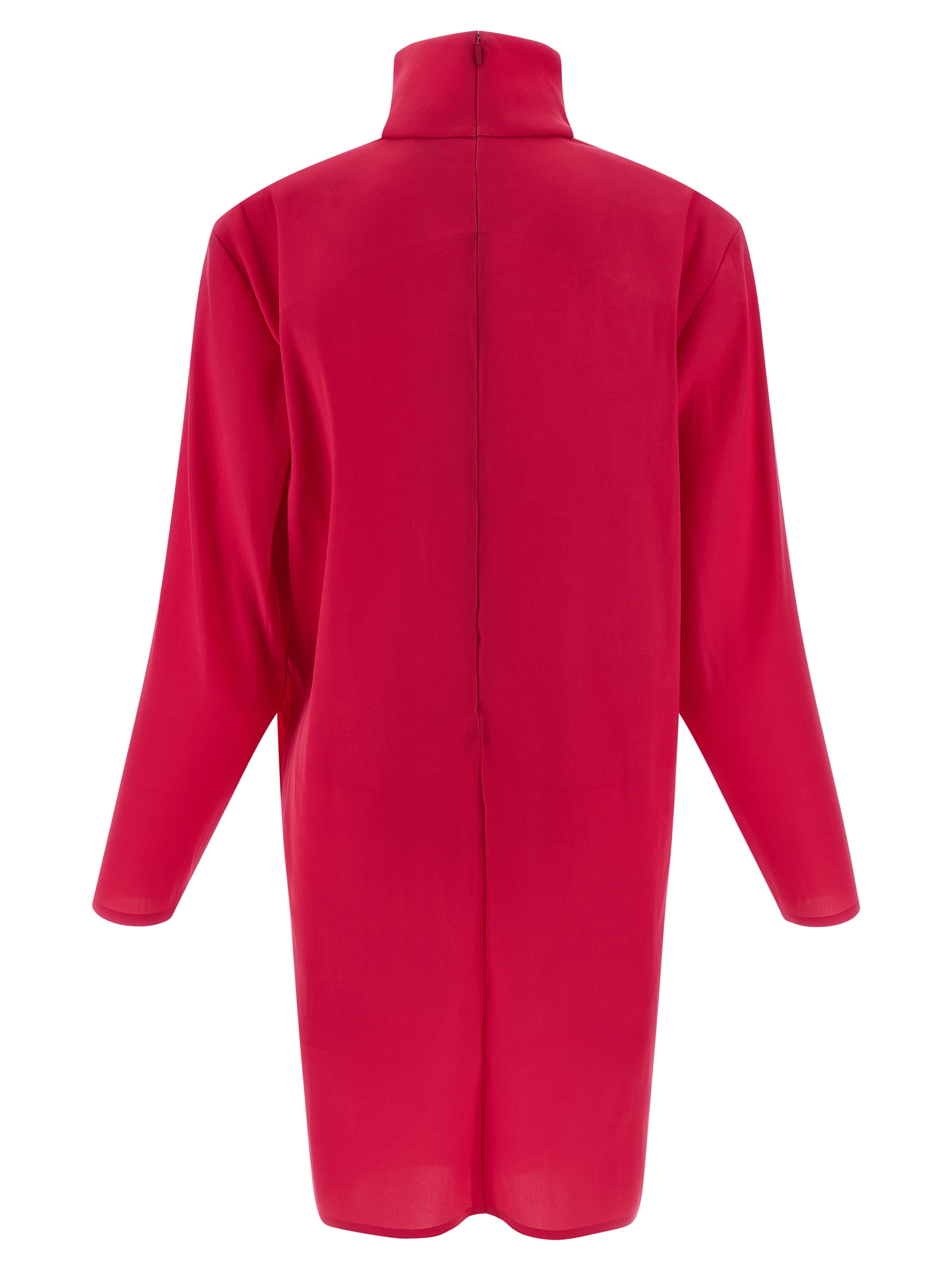 Mini dress in stretch super organza, high neck, trapeze silhouette, structured shoulders with iron support, long sleeves, back zip closure, pockets.