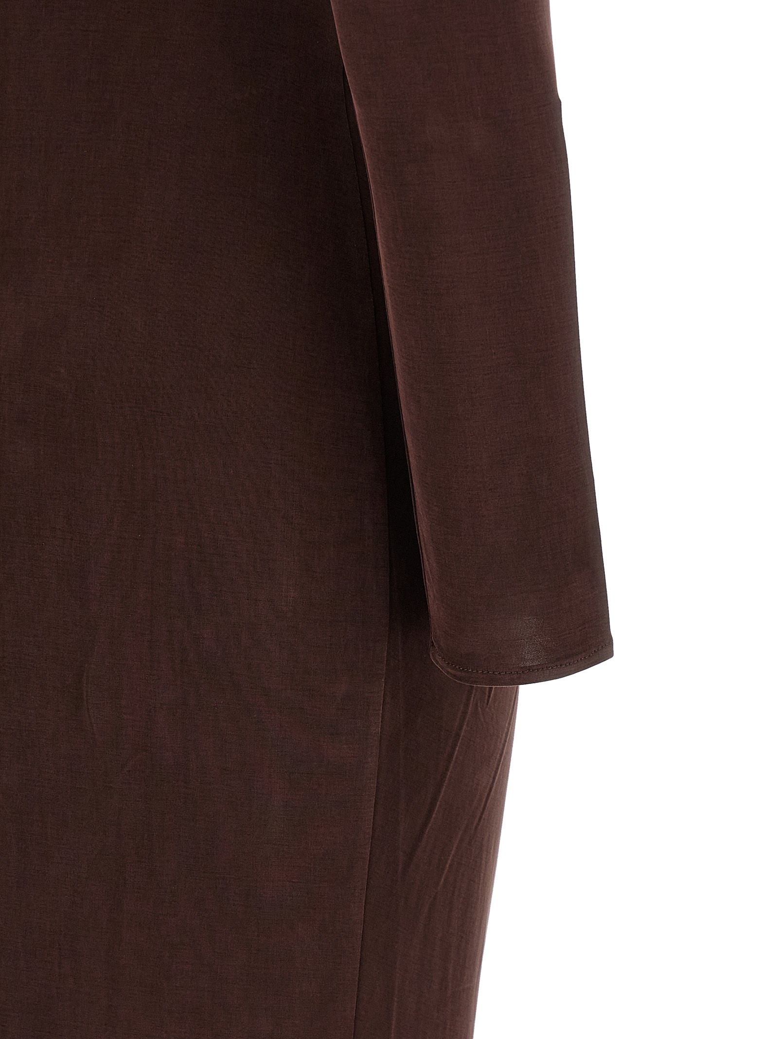 Long 'Red Carpet' dress in cupro jersey with wide front V-neck with draping, curling and jewel logo with rhinestones, padded shoulders, long sleeves, skirt with train and wide front split.